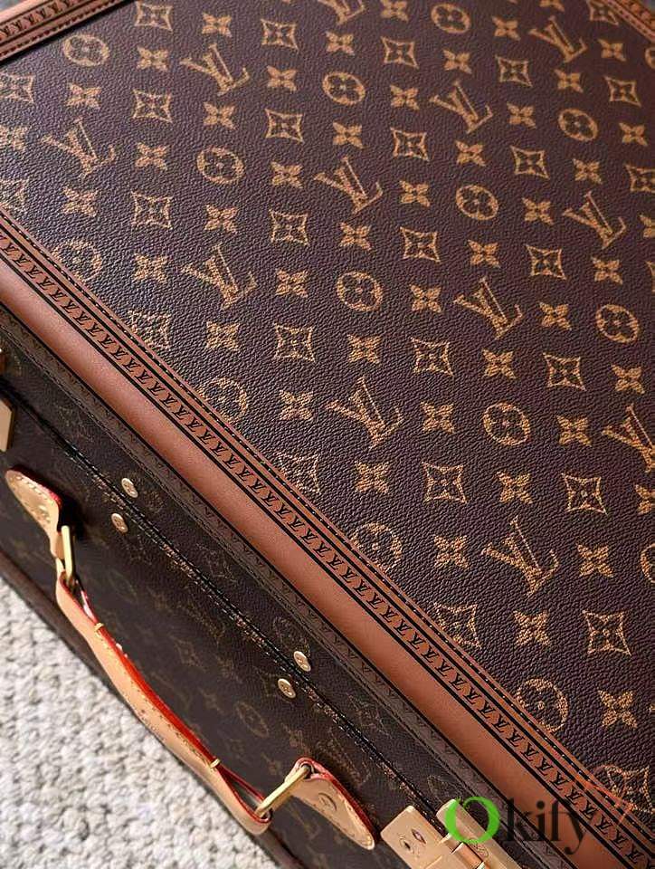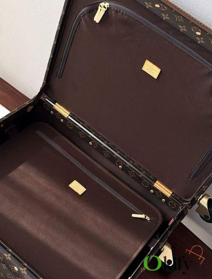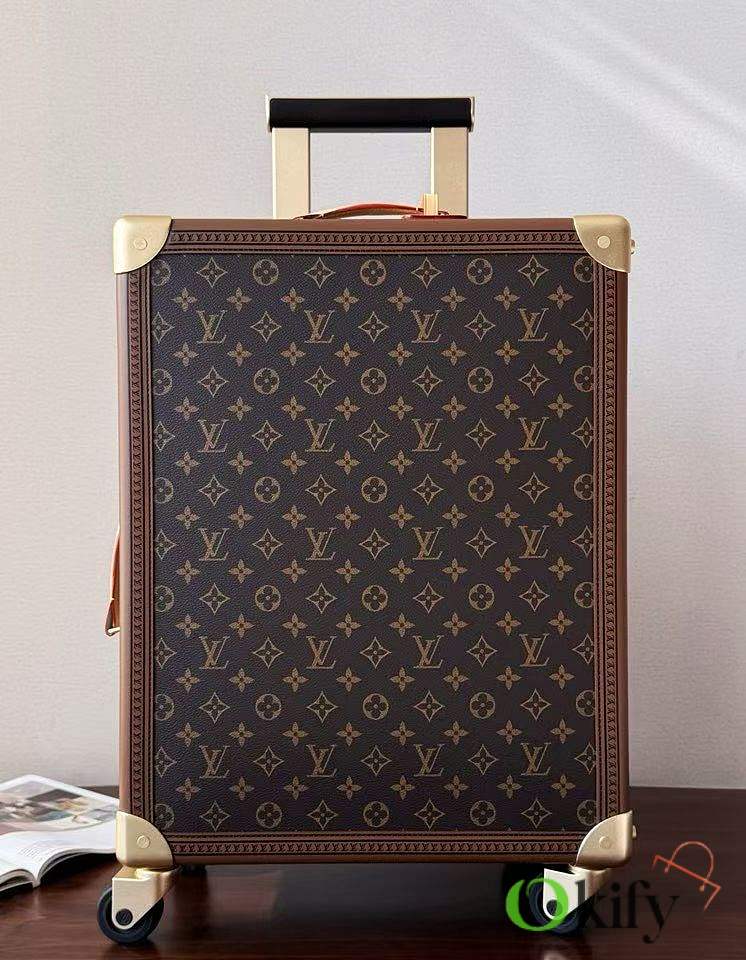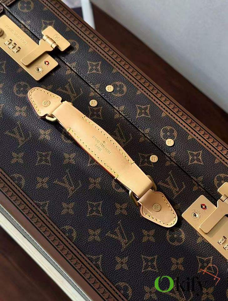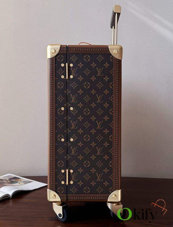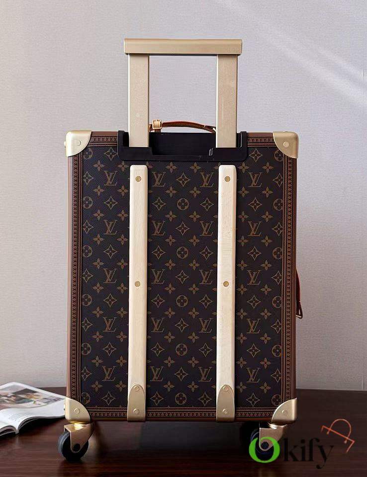 This suitcase is crafted from Monogram Eclipse coated canvas, complemented by leather trim and metal hardware. Reinforced corner protectors and a wooden slat on the back echo the brand's traditional hard-sided trunk elements. The main compartment features a zippered pocket and a removable divider.