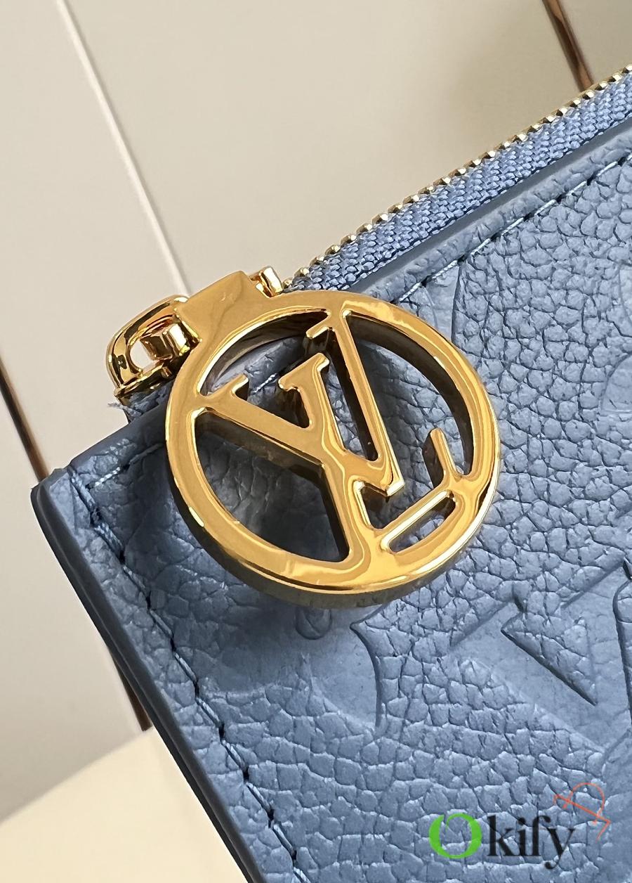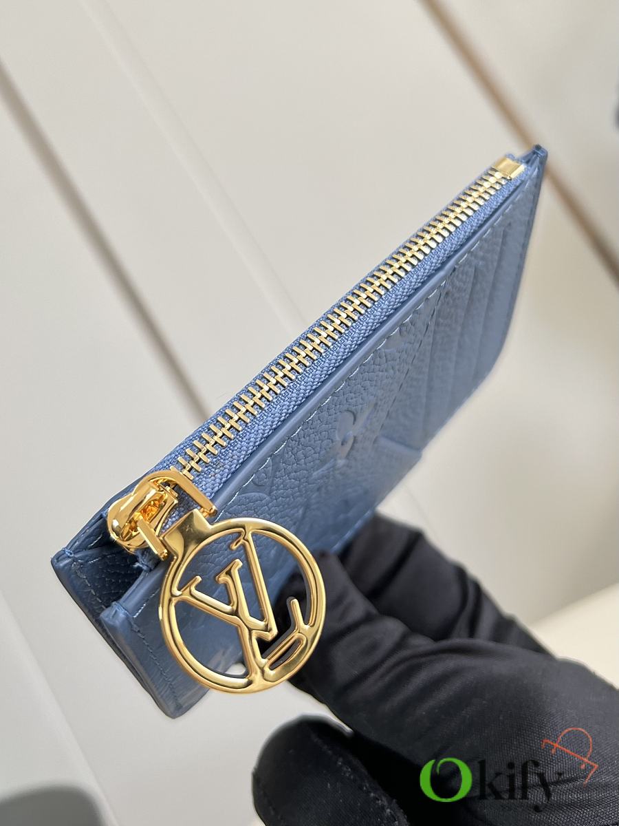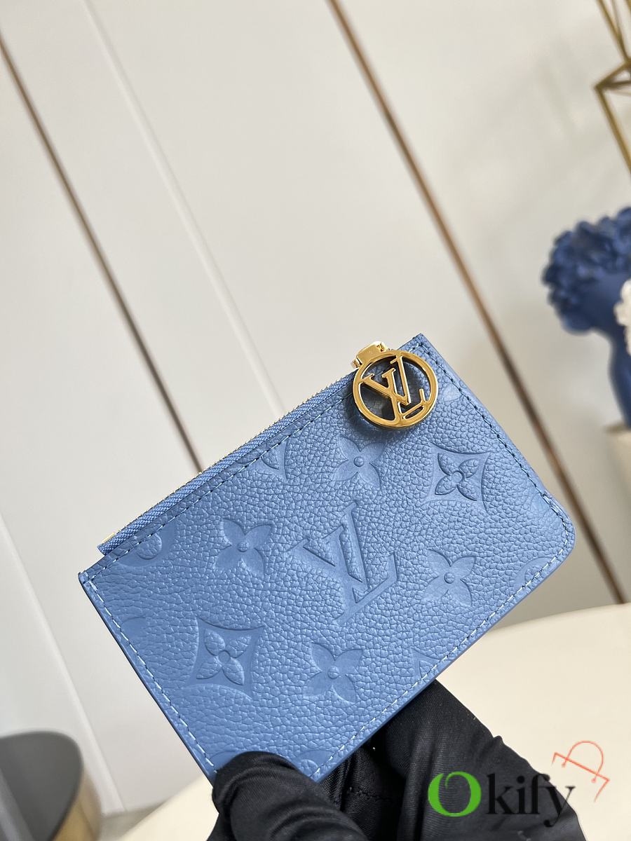 This Romy card holder reinterprets this season's blue denim hue, creating a timeless and classic everyday accessory. Crafted from iconic Monogram Empreinte leather, it features a gold zipper pull adorned with the LV Circle logo charm. This compact accessory offers three card slots, a zippered coin pocket, and a slip pocket.