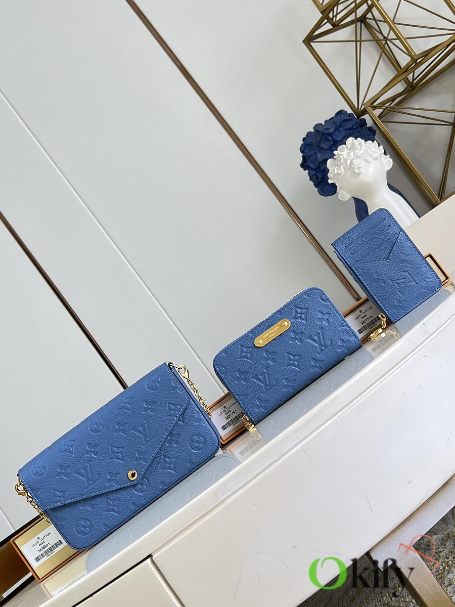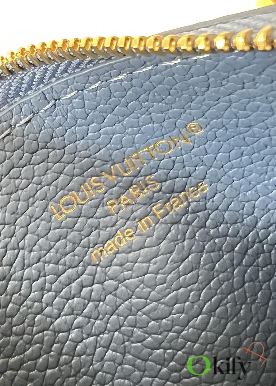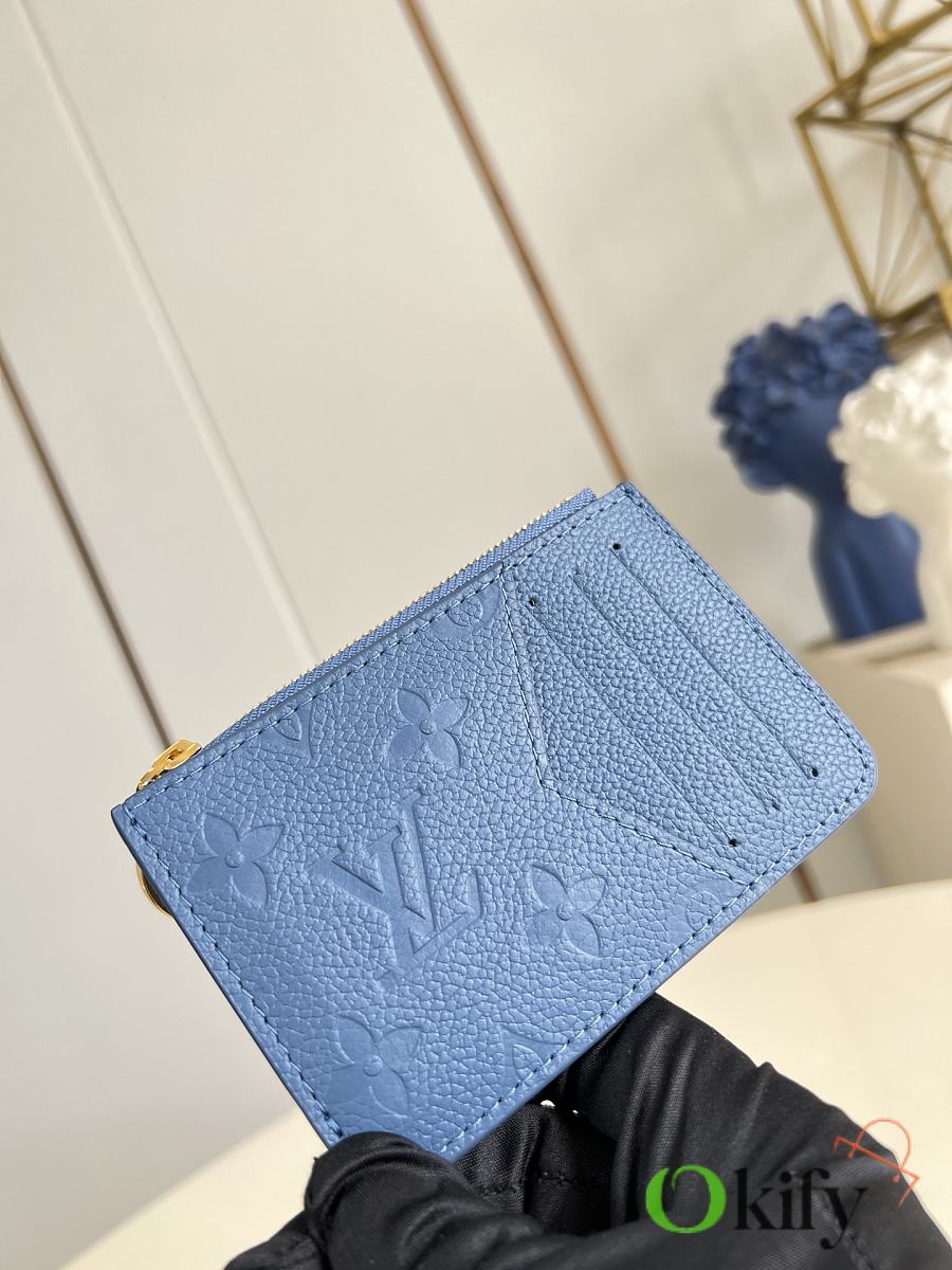 This Romy card holder reinterprets this season's blue denim hue, creating a timeless and classic everyday accessory. Crafted from iconic Monogram Empreinte leather, it features a gold zipper pull adorned with the LV Circle logo charm. This compact accessory offers three card slots, a zippered coin pocket, and a slip pocket.