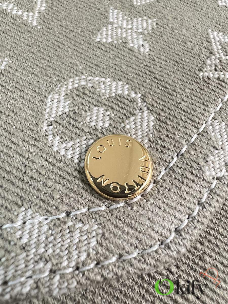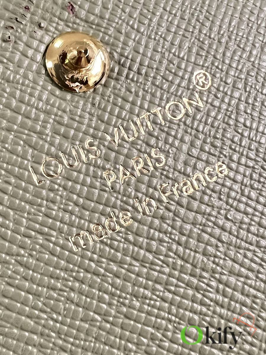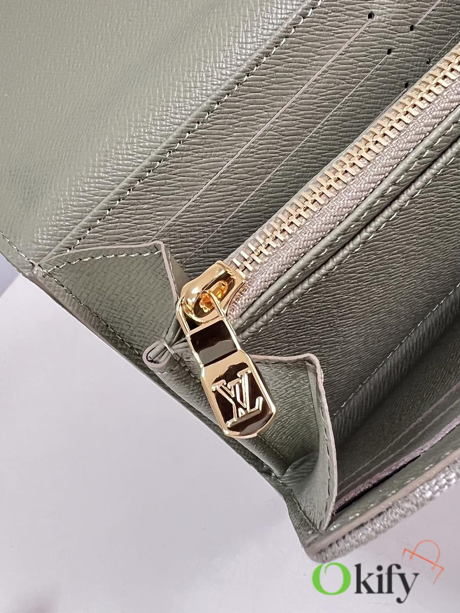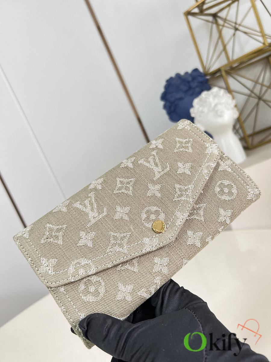 As one of Louis Vuitton's classic designs, the Sarah wallet combines Monogram denim canvas with a grained leather lining, recreating the elegance of an envelope design. The spacious interior features two large compartments, a central zippered coin pocket, and multiple card slots. It can securely hold many everyday essentials