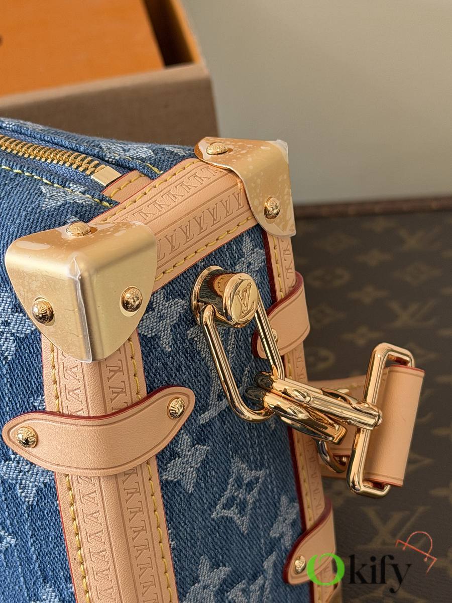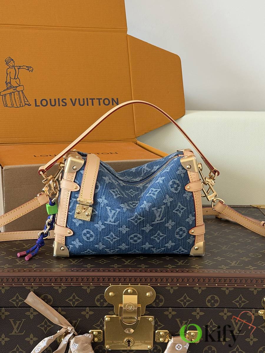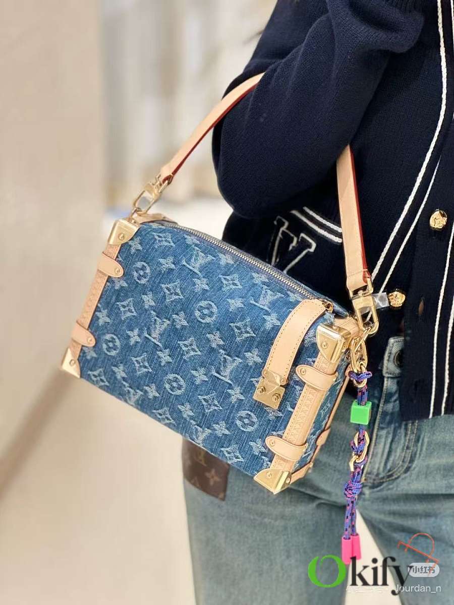 Nicolas Ghesquière revisits Louis Vuitton's trunk-making heritage to create this small Side Trunk handbag. The Monogram denim leather zipper pull creatively connects to the iconic S-lock clasp, drawing attention along with reinforced metal corners. Both the wide handle and thin leather shoulder strap are detachable.