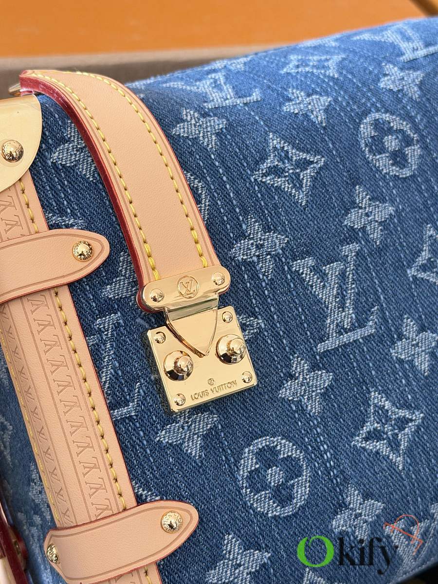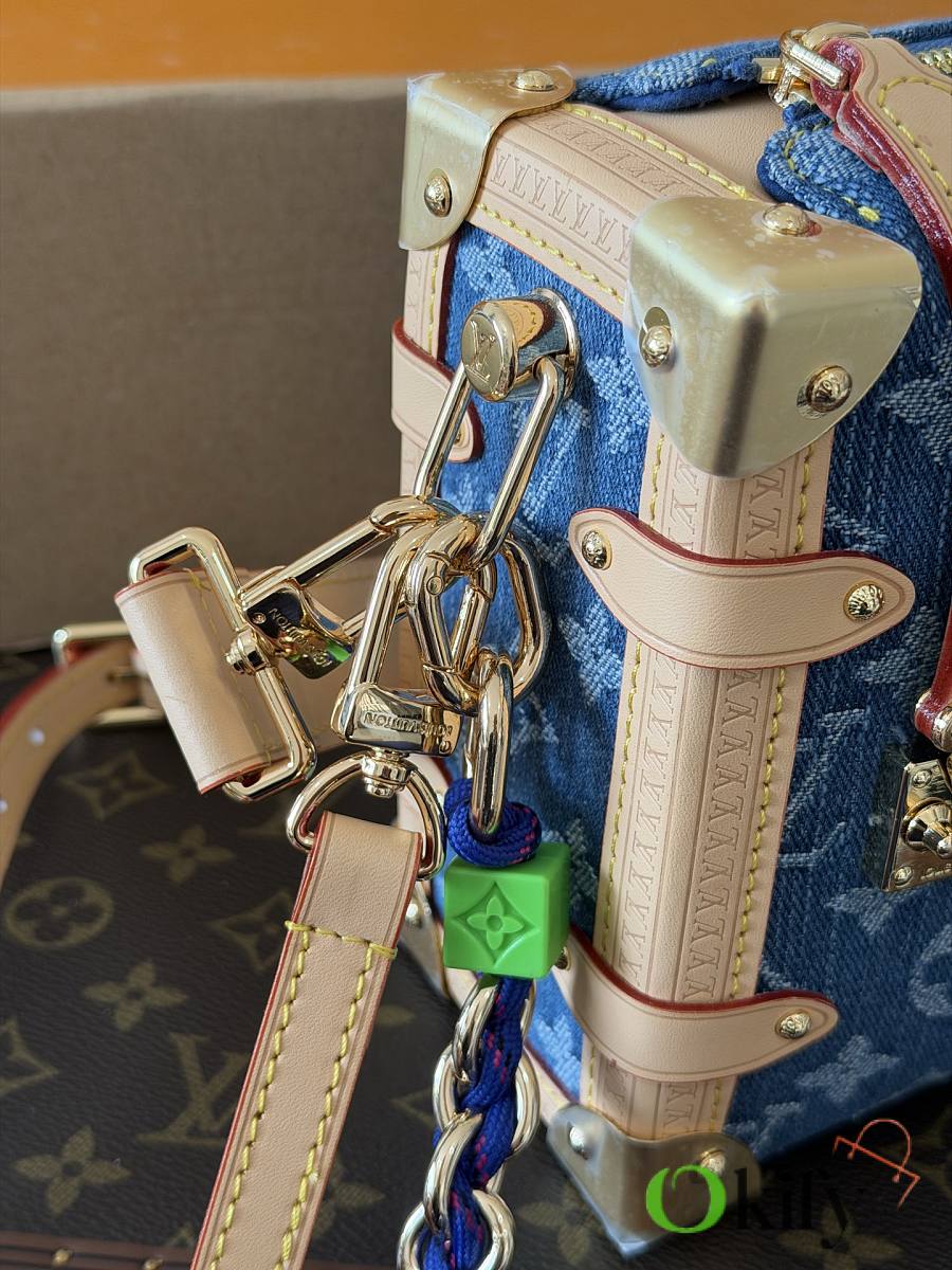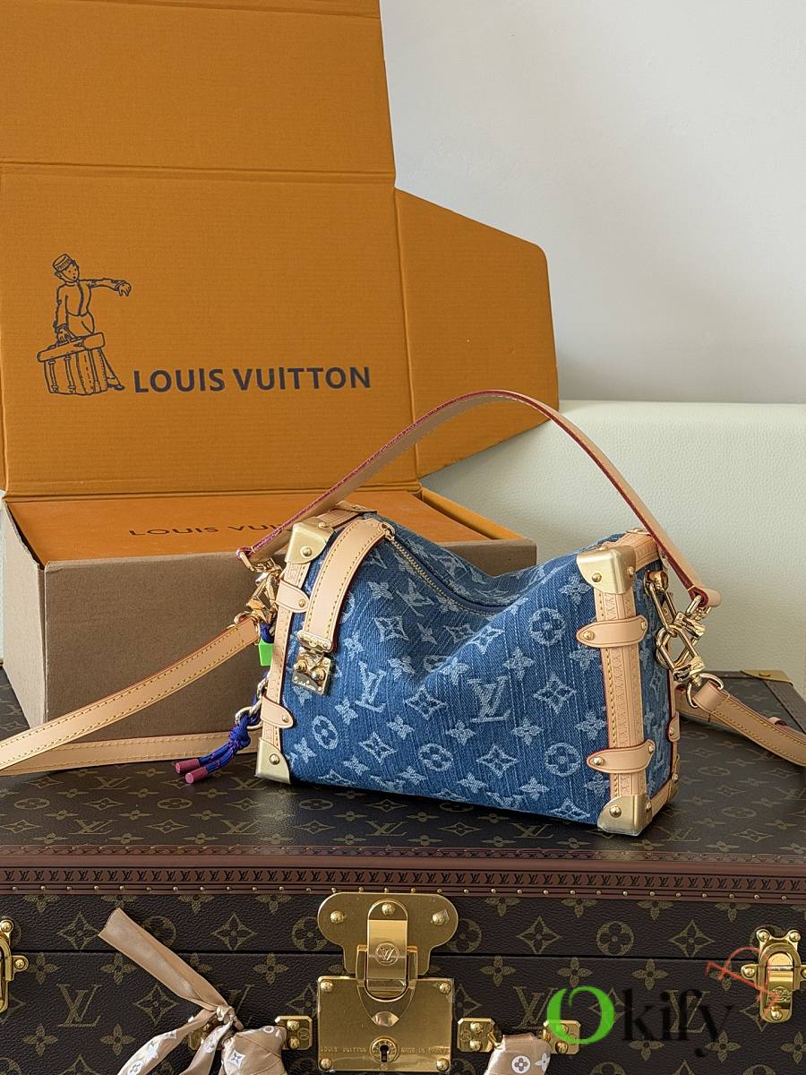 Nicolas Ghesquière revisits Louis Vuitton's trunk-making heritage to create this small Side Trunk handbag. The Monogram denim leather zipper pull creatively connects to the iconic S-lock clasp, drawing attention along with reinforced metal corners. Both the wide handle and thin leather shoulder strap are detachable.