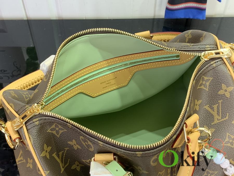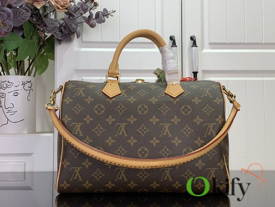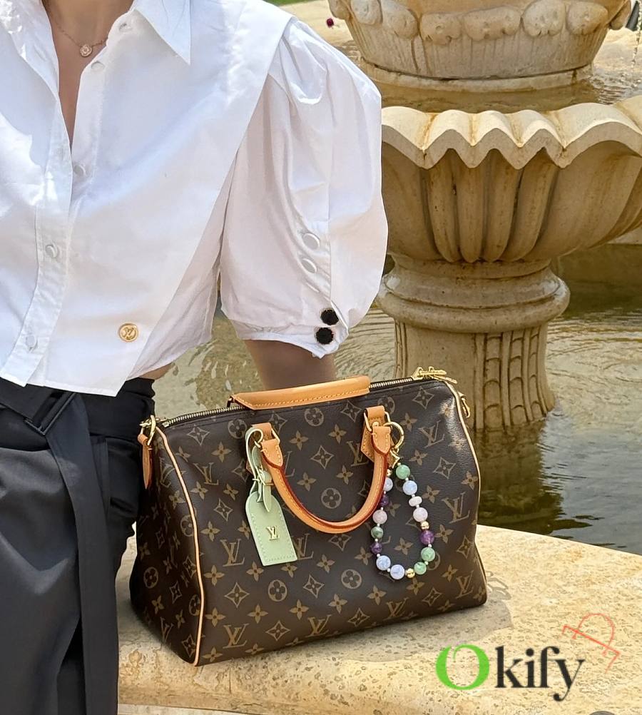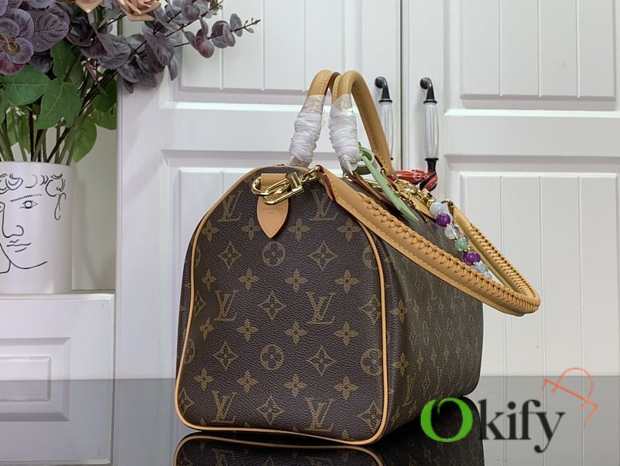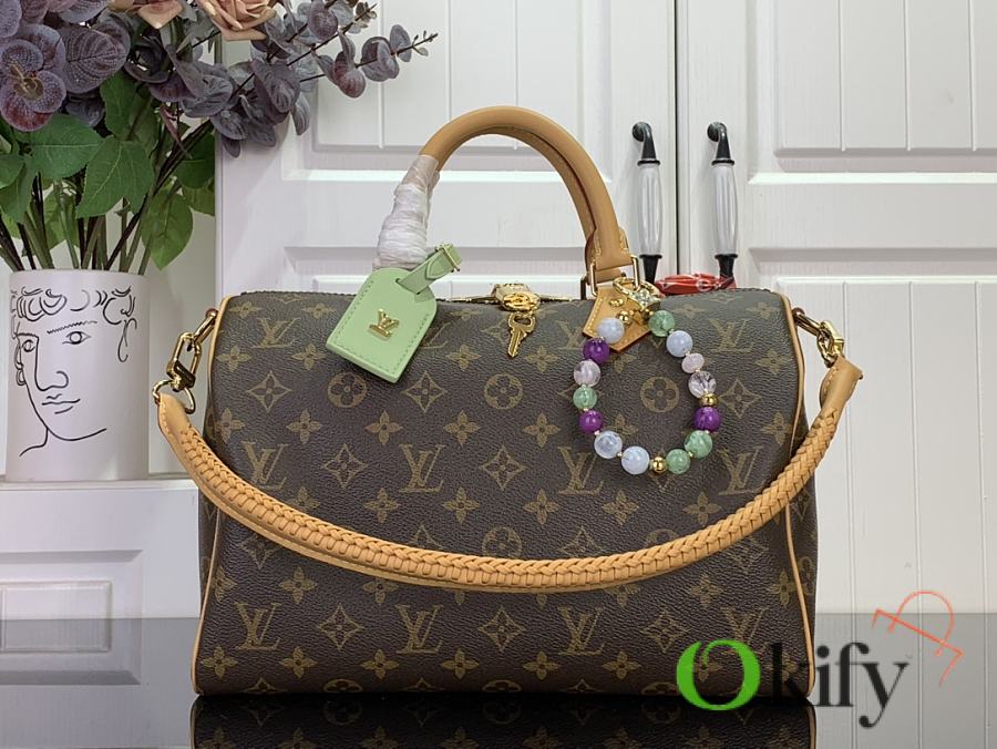 The Speedy Soft 30 Lucky handbag features Monogram canvas outlined with VVN leather trim, while detachable embellishments reminiscent of jewelry, a contrasting lining, and metal hardware accentuate its sophisticated details. Its spacious design easily accommodates a tablet and everyday essentials.
