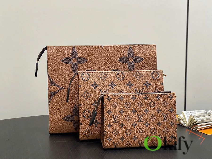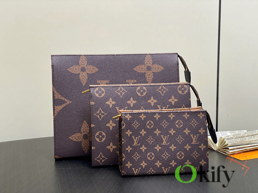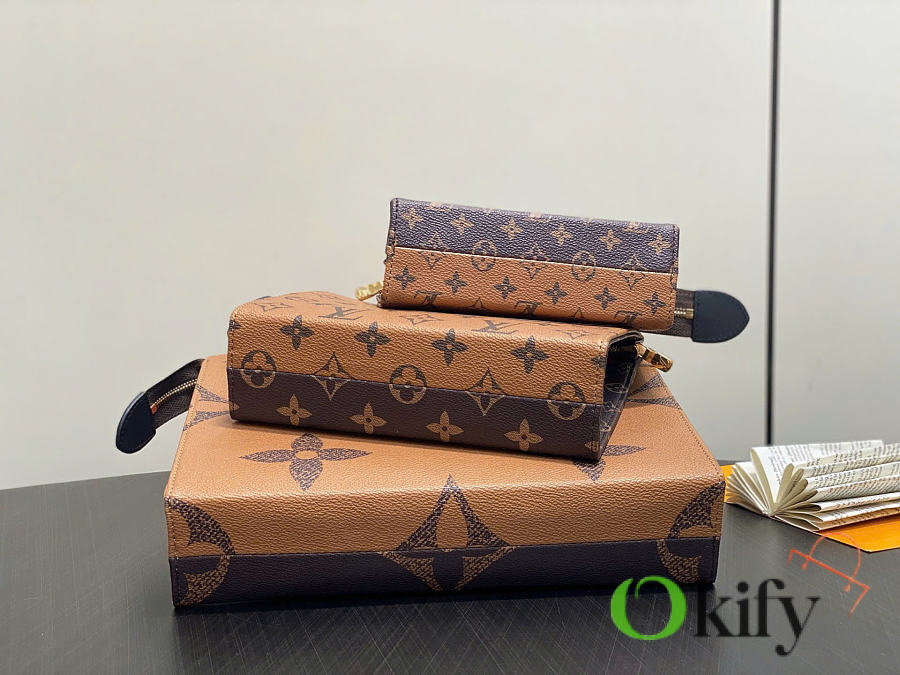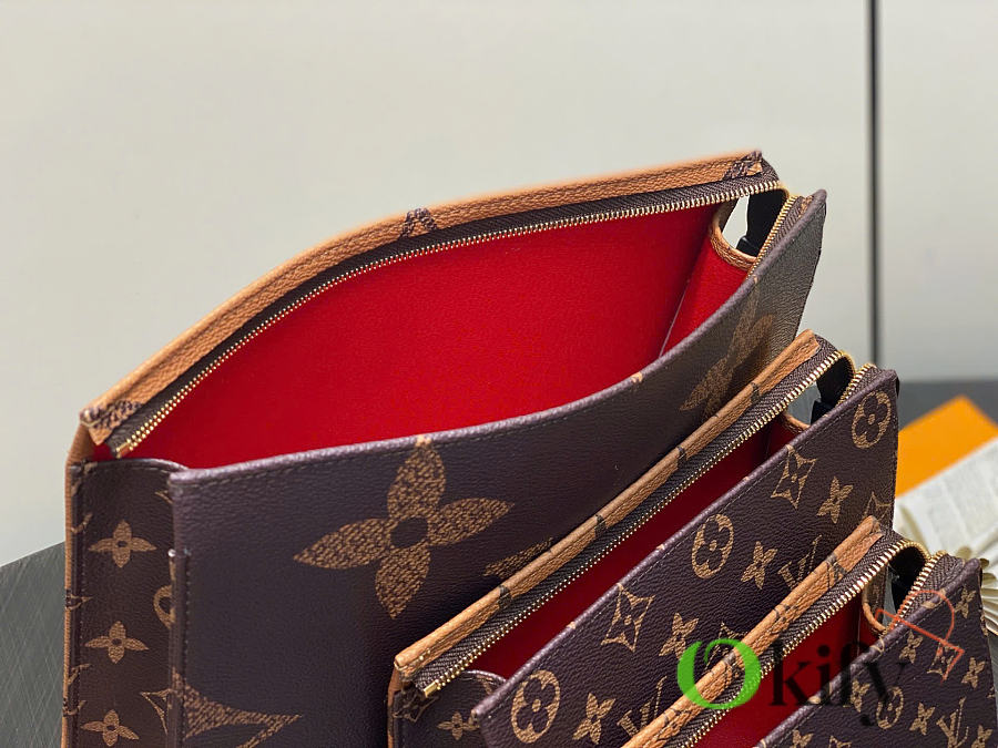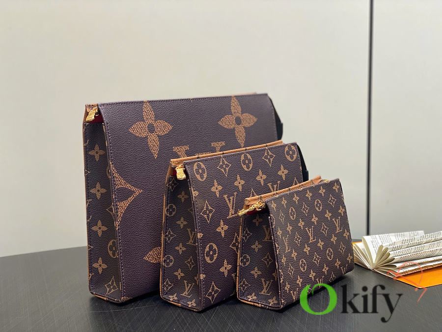 Monogram Yellow Floral Three-Piece Clutch/Handbag Trio Toilet Bag. This Trio toilet bag set is crafted from Monogram and Monogram Reverse canvas, showingcasing diverse interpretations of the Monogram pattern through different sizes, combining elegant style with functional considerations. Dimensions: 20 x 5.5 x 25 cm (H x W x Length)