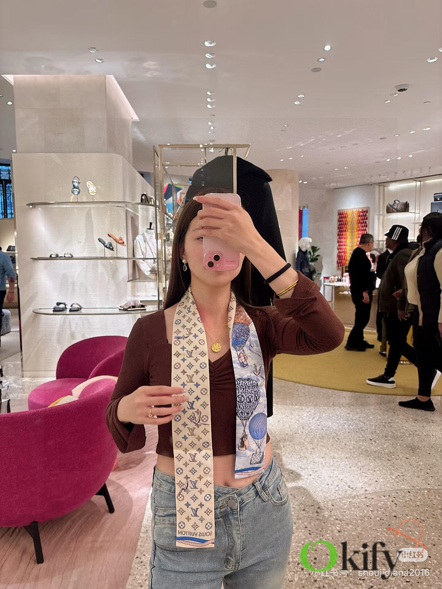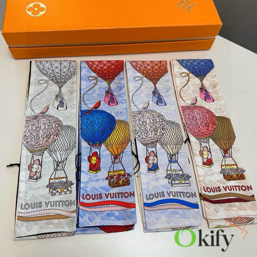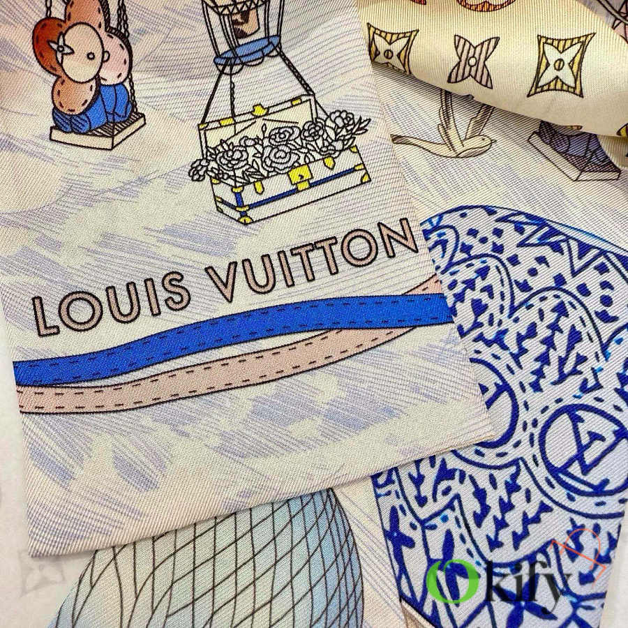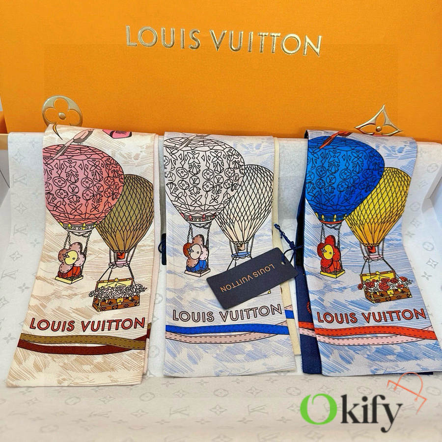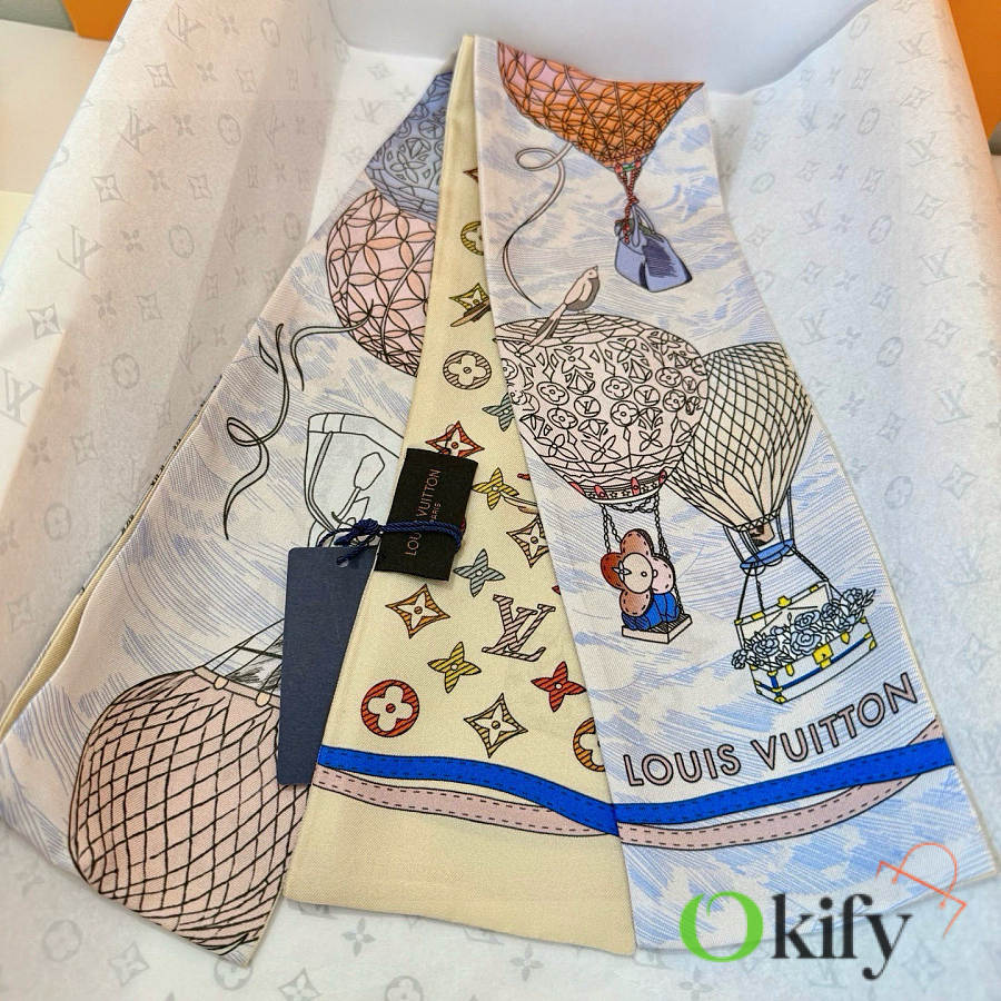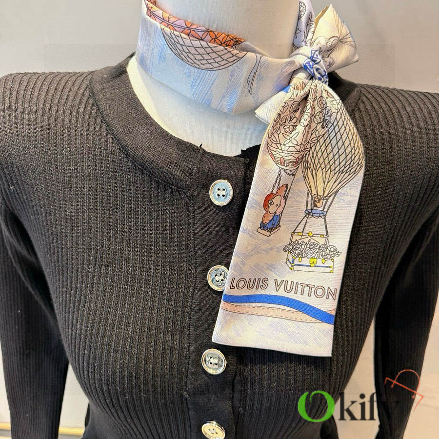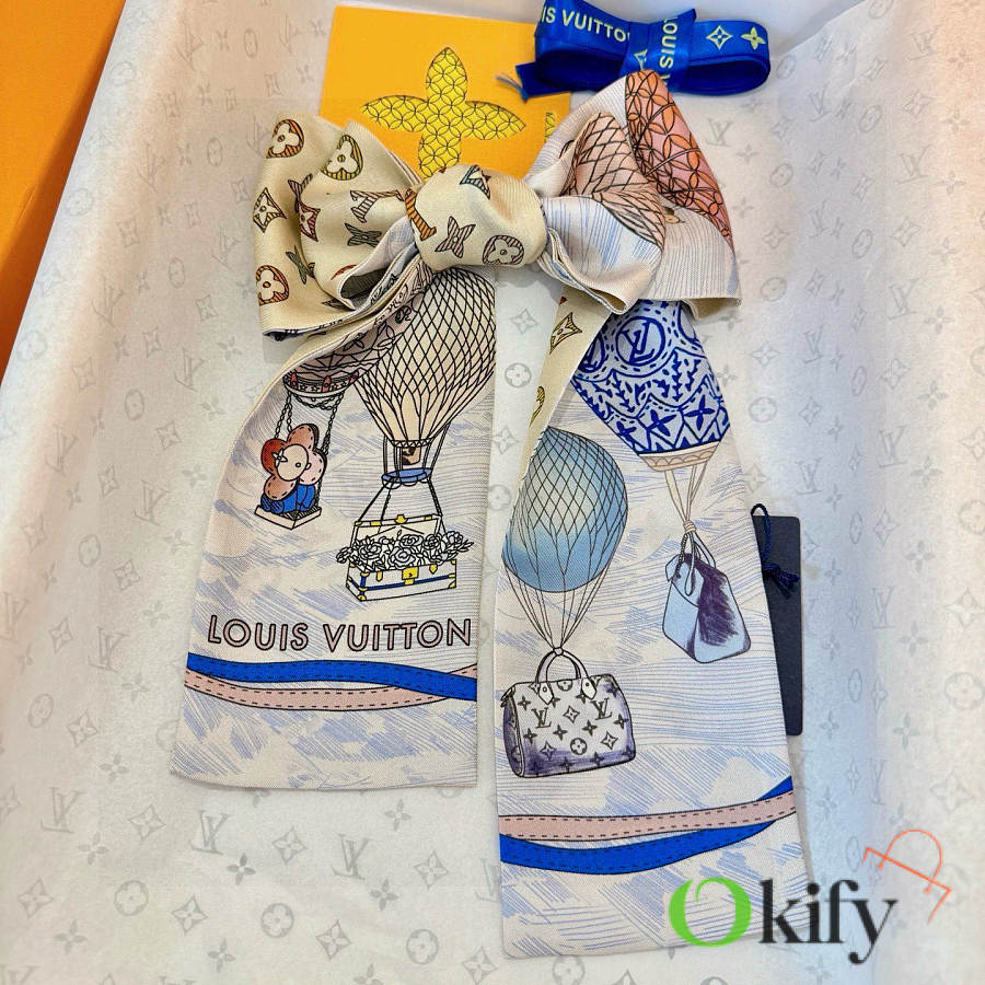 The Louis Vuitton Up and Away silk headband depicts the poetic scene of a hot air balloon carrying leather goods, reminiscent of Louis Vuitton's 2012 travel campaign. Flipping it reveals the classic Monogram pattern, a celebration of the wonders of travel.