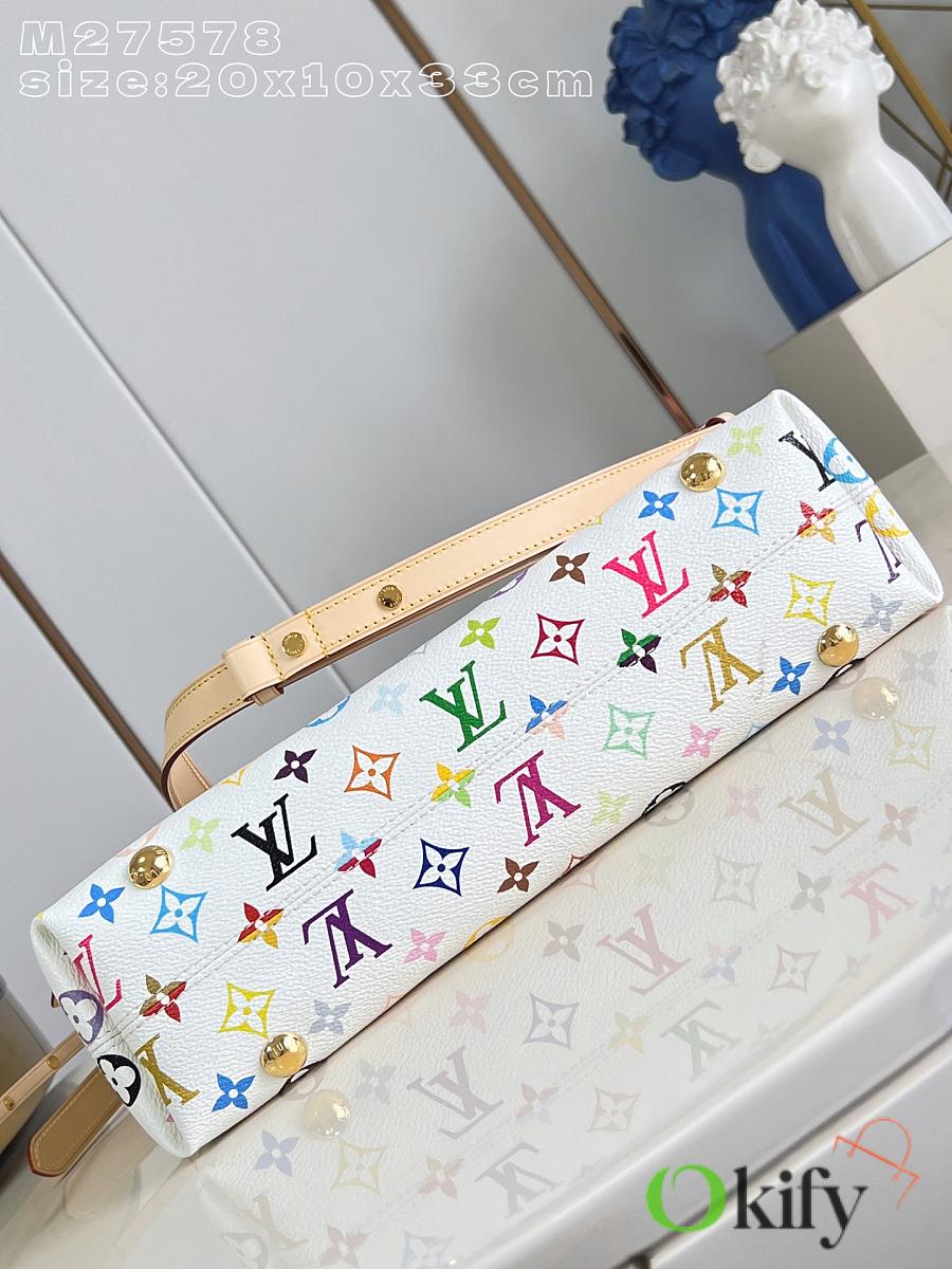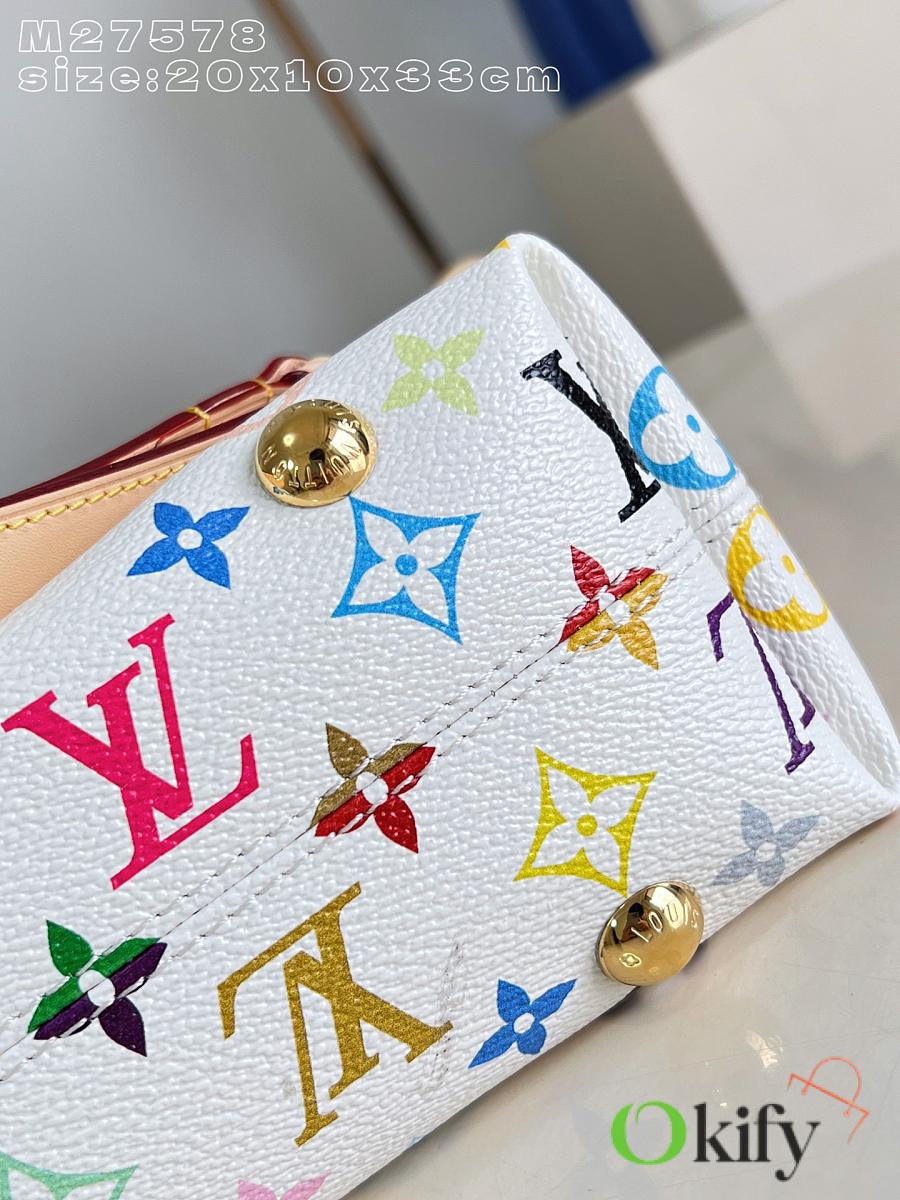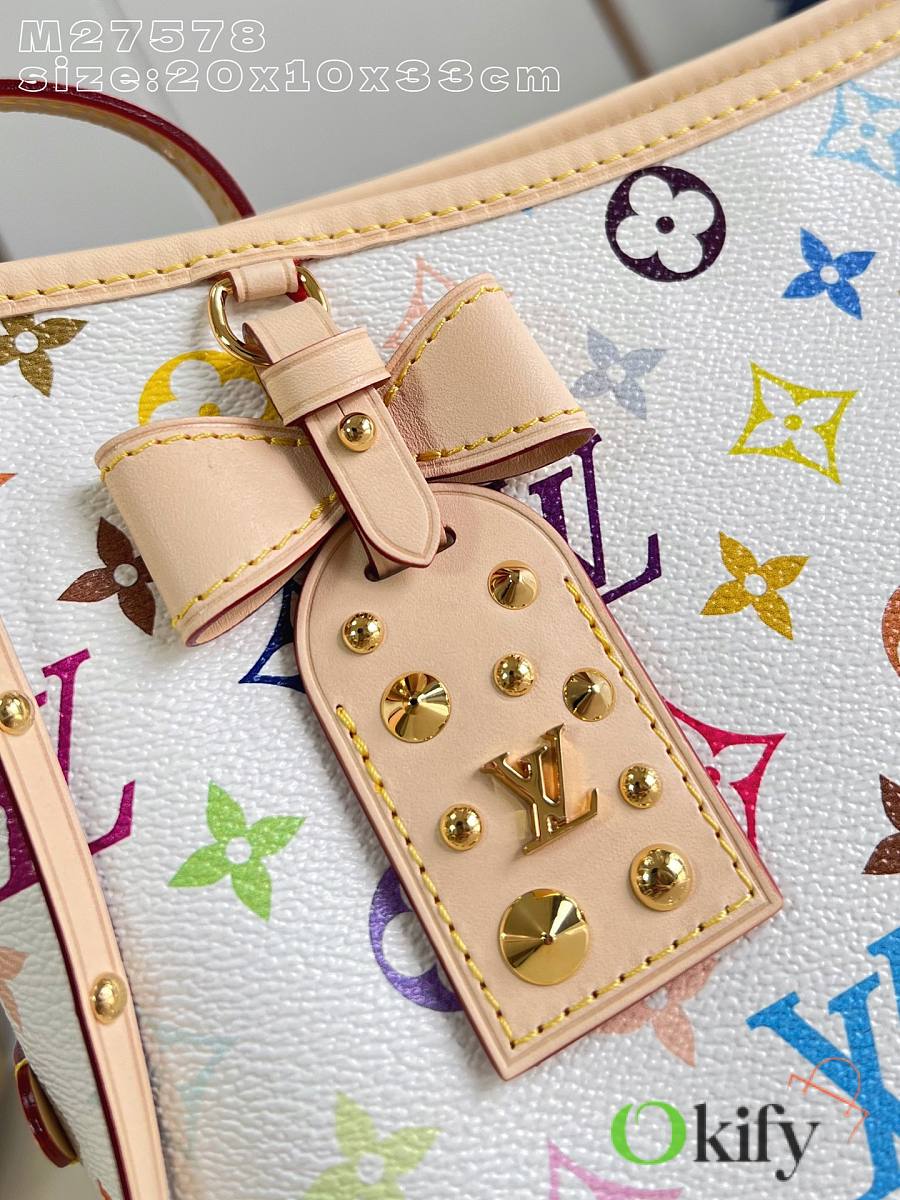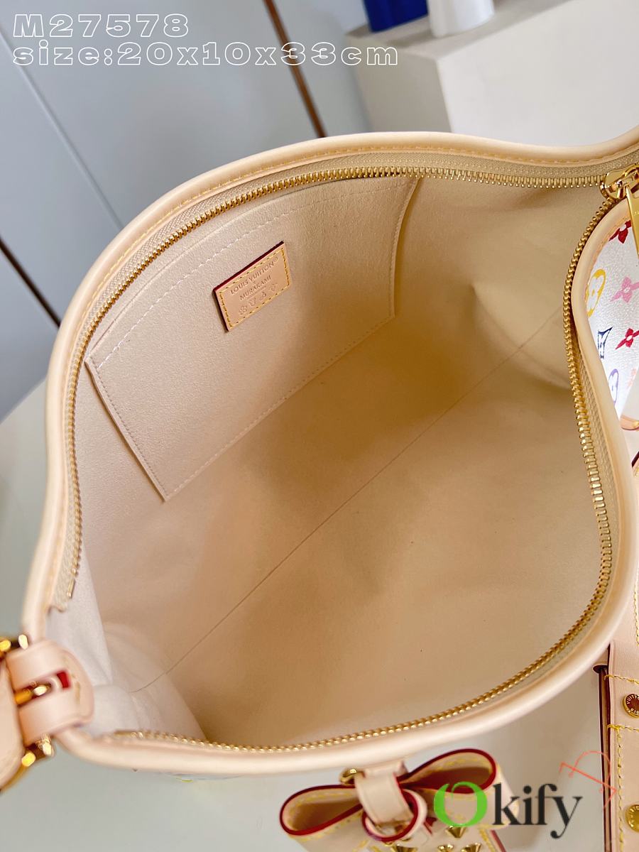 This LV x TM Carryall East West handbag is from the Louis Vuitton x Takashi Murakami reissue collection. It cleverly incorporates the bright colors of the Japanese artist into Monogram coated canvas. Calfskin trim outlines a fitted silhouette, while the nameplate embellishes with an elegant bow detail.