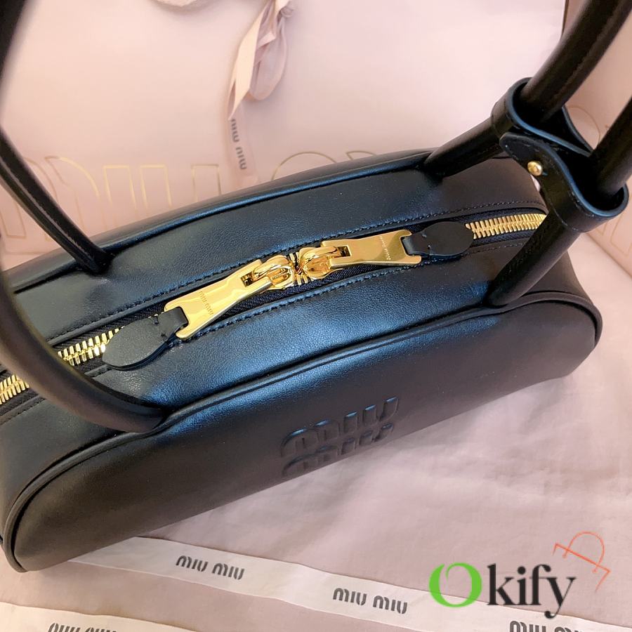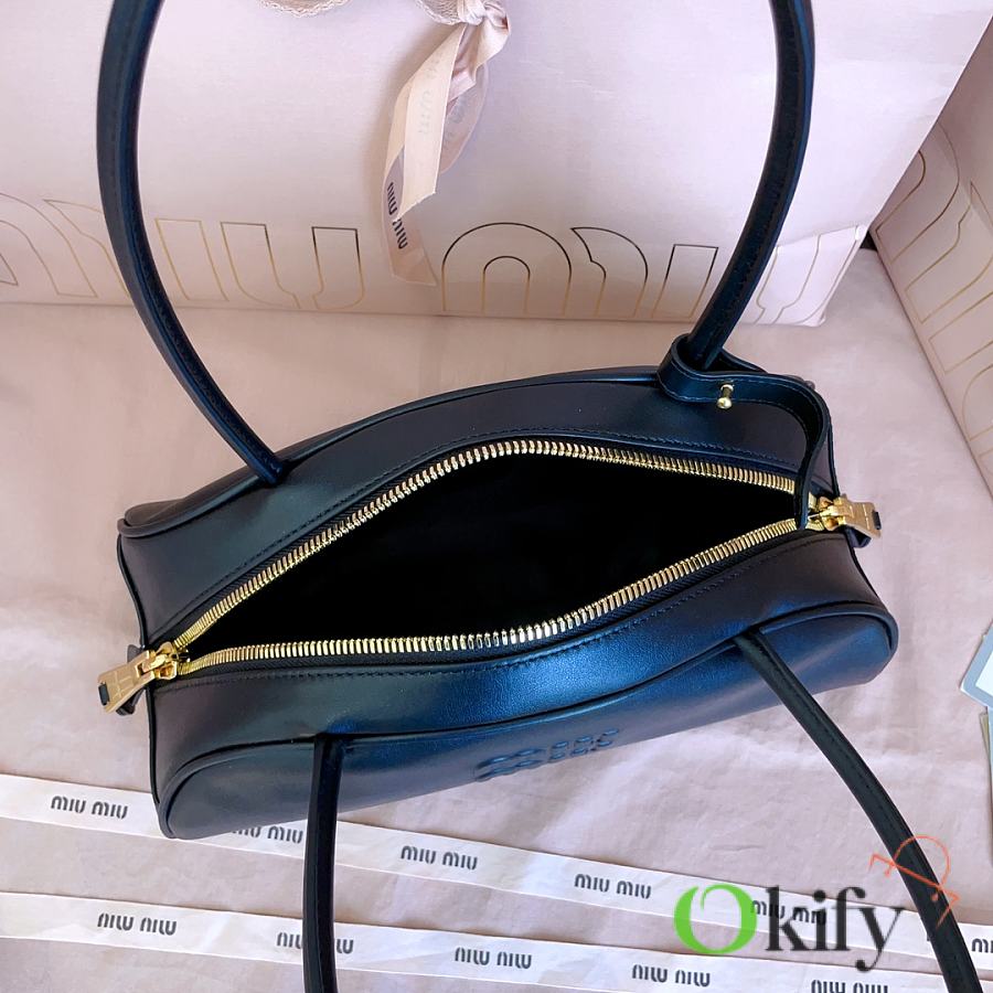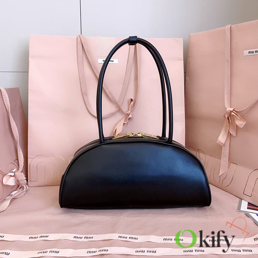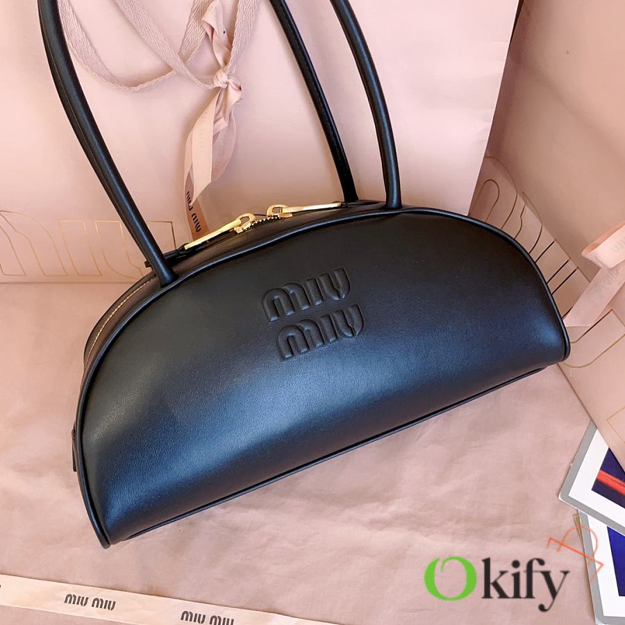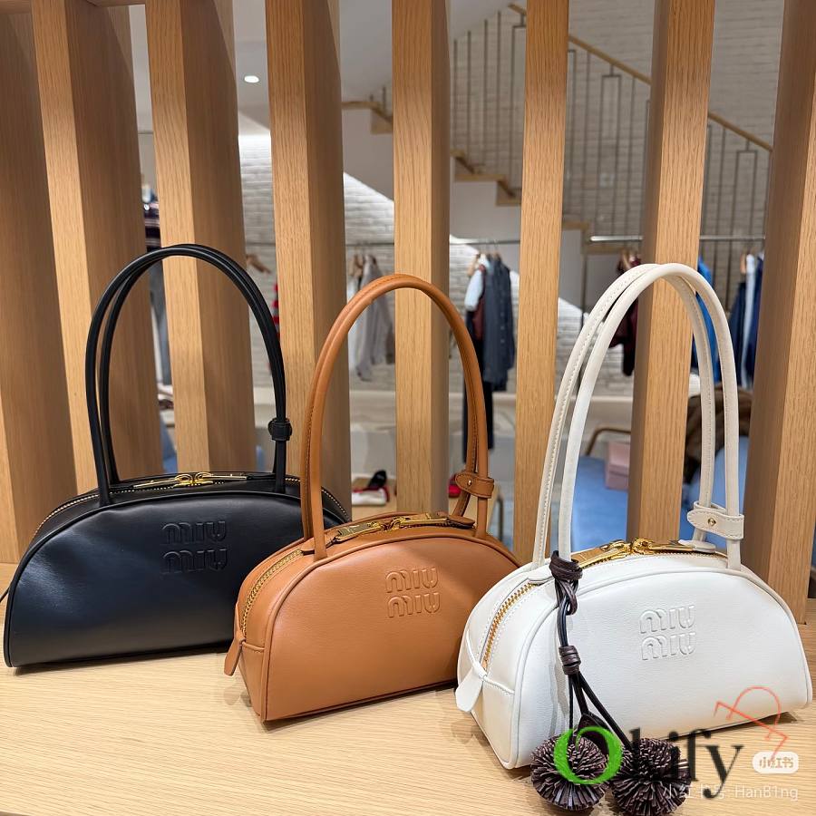Miu's new semi-circular bowling bag, crafted from top-grade imported calfskin. Its stylish semi-circular design reinterprets the new Beau handbag, featuring a refined, structured shape with rounded lines. Highly versatile, the extended handles are perfect for the currently popular underarm carrying style. It looks great with any outfit, including the iconic logo on the front, a cotton satin-lined zip pocket, and a slip pocket.
