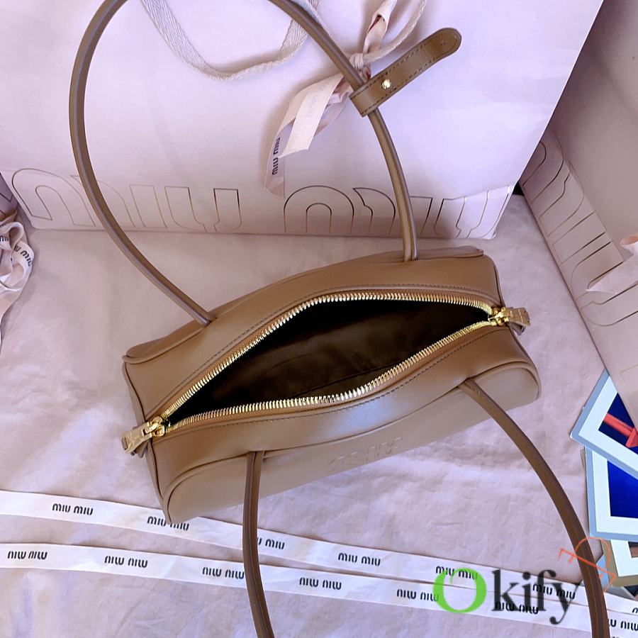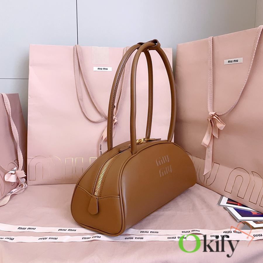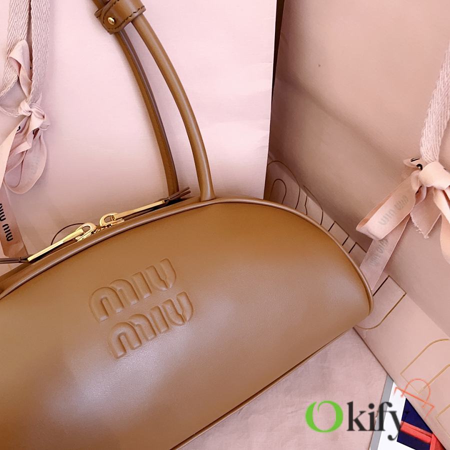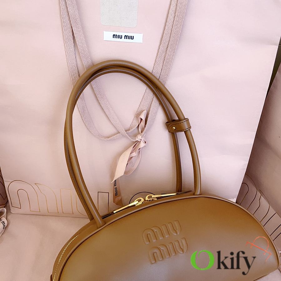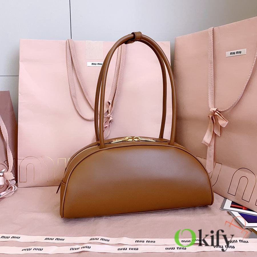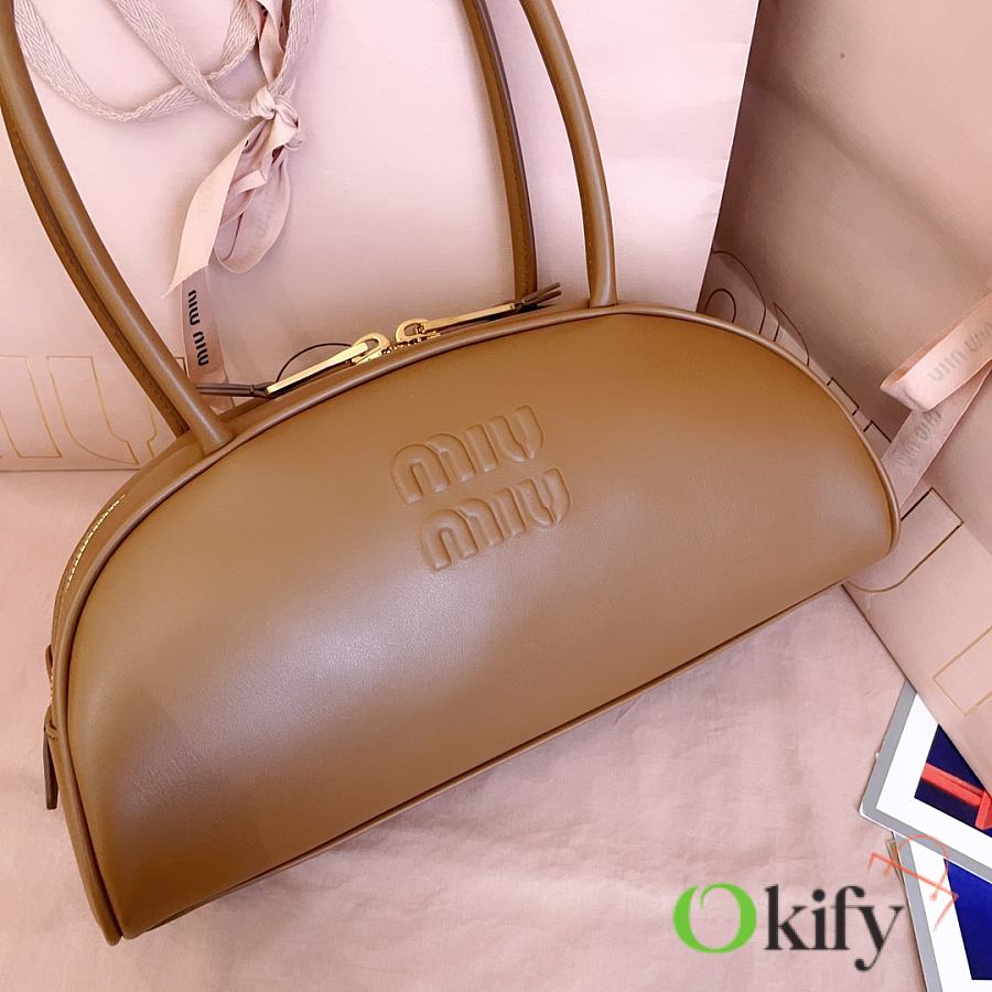 Miu's new semi-circular bowling bag, crafted from top-grade imported calfskin. Its stylish semi-circular design reinterprets the new Beau handbag, featuring a refined, structured shape with rounded lines. Highly versatile, the extended handles are perfect for the currently popular underarm carrying style. It looks great with any outfit, including the iconic logo on the front, a cotton satin-lined zip pocket, and a slip pocket.