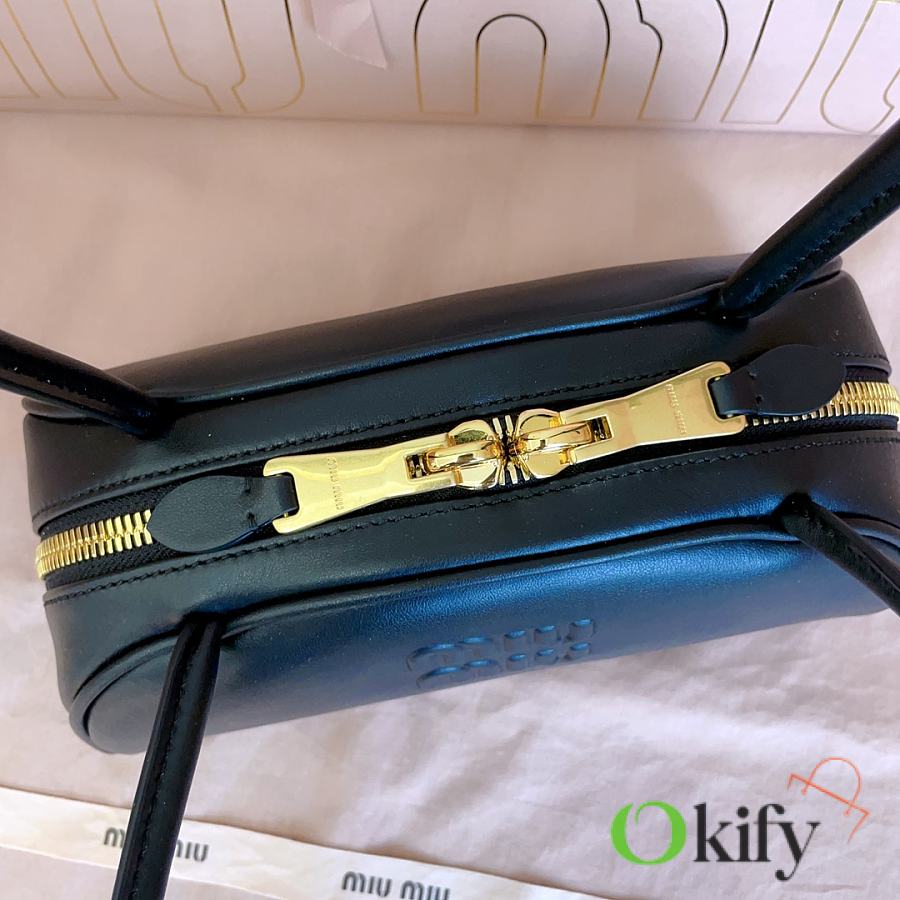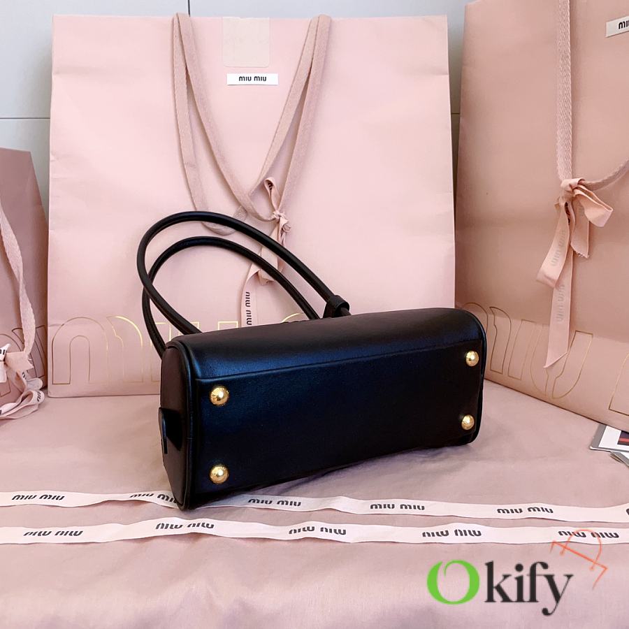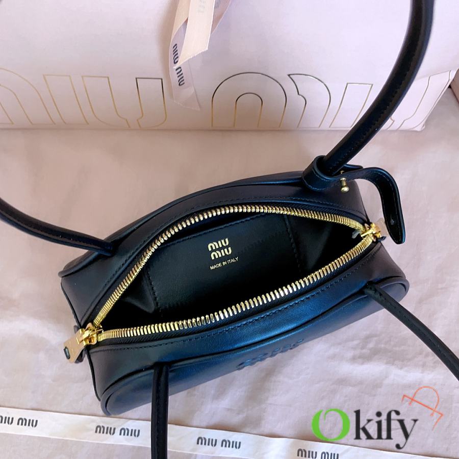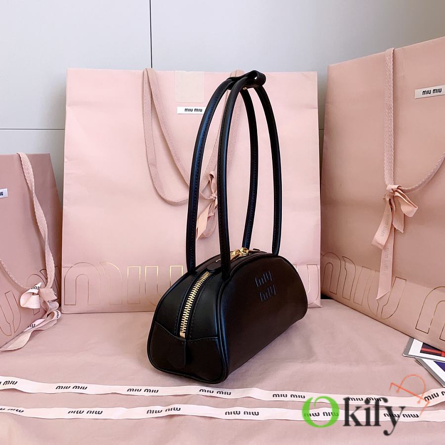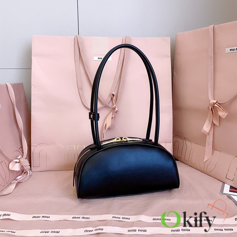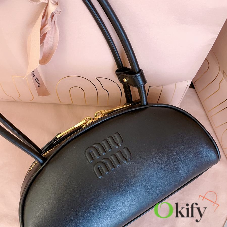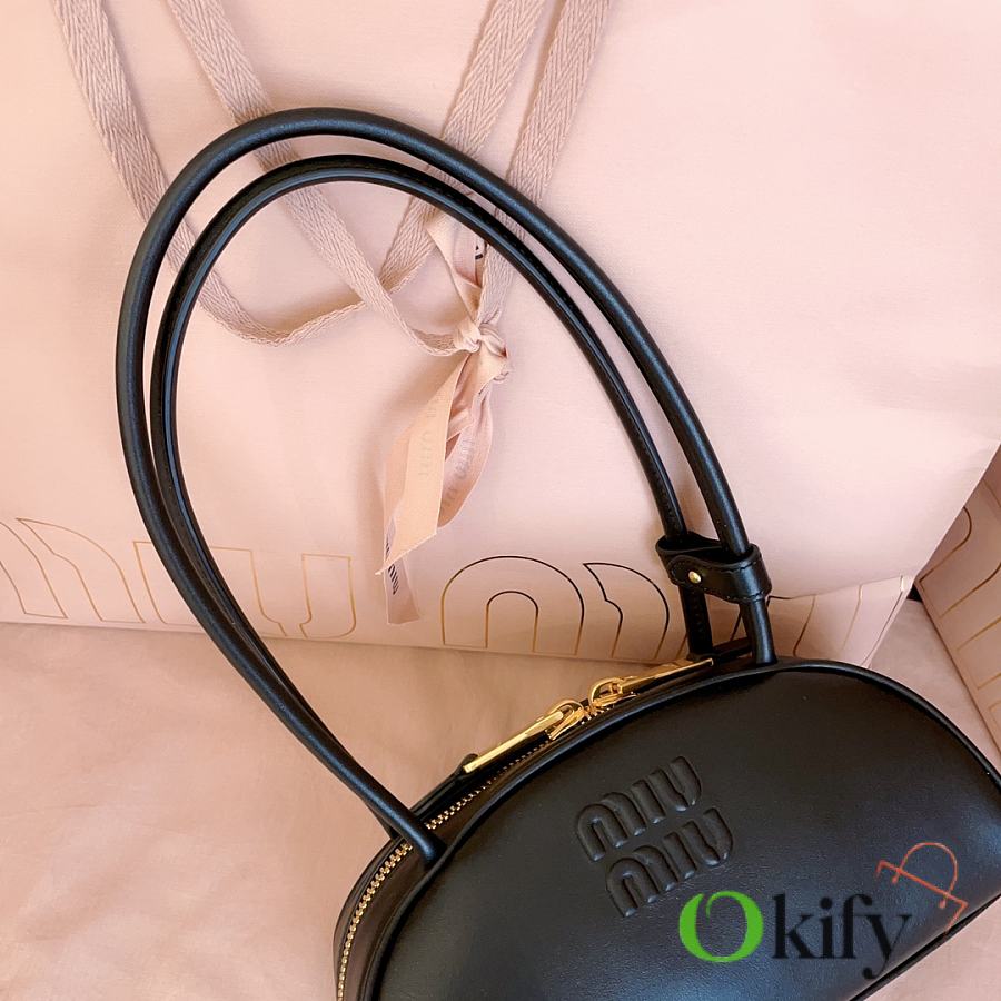 Miu's new semi-circular bowling bag, crafted from top-grade imported calfskin. Its stylish semi-circular design reinterprets the new Beau handbag, boasting a refined, structured shape with rounded lines and a highly versatile silhouette. The extended handles are perfect for the currently popular underarm carrying style, making it suitable for everyday wear. It features the iconic logo on the front, a cotton satin-lined zip pocket, and a slip pocket.