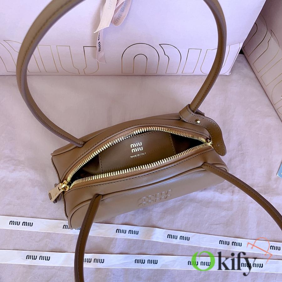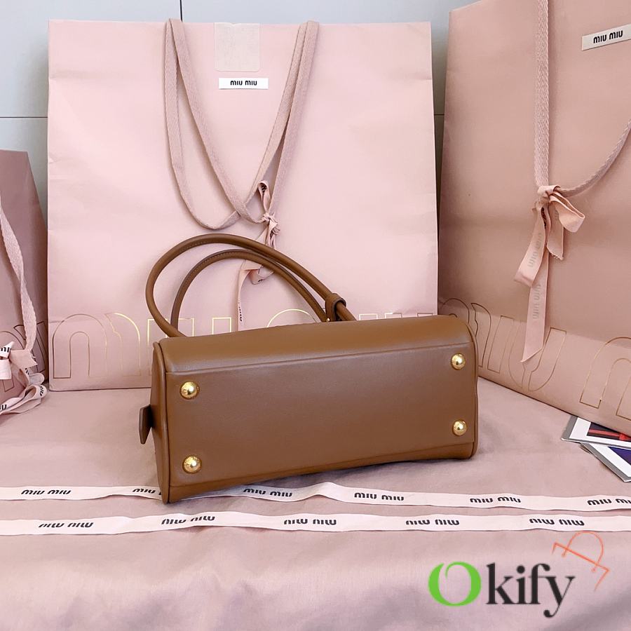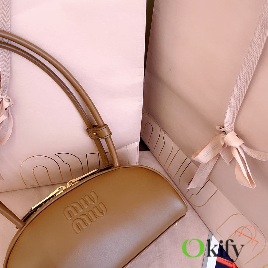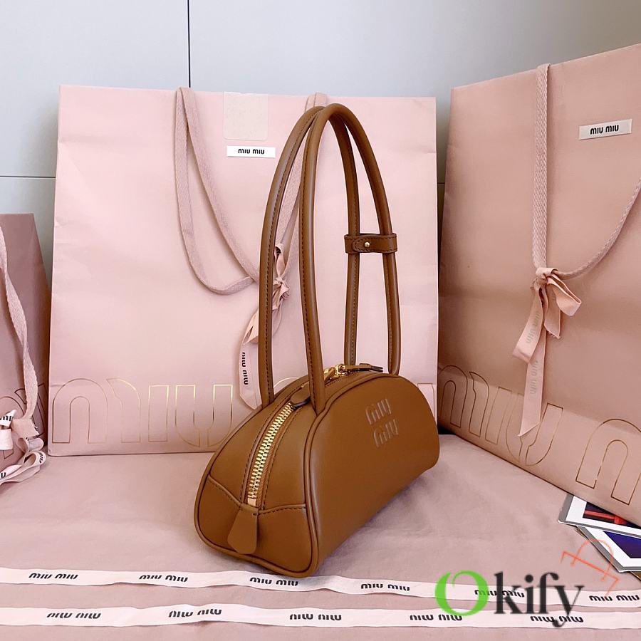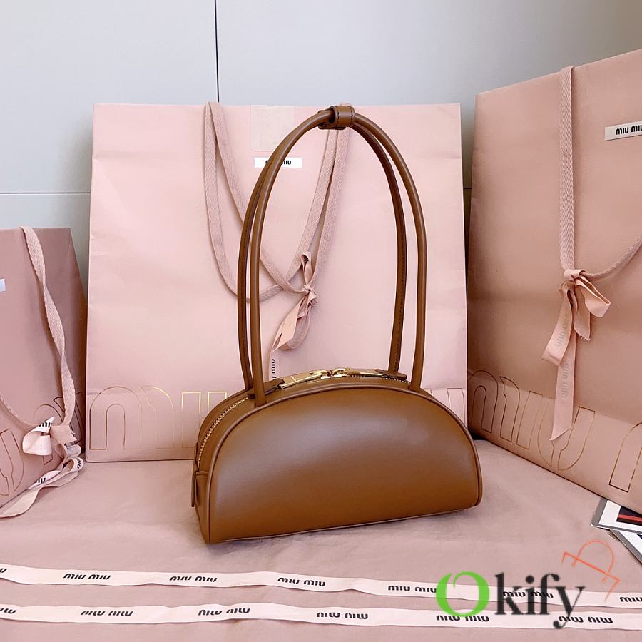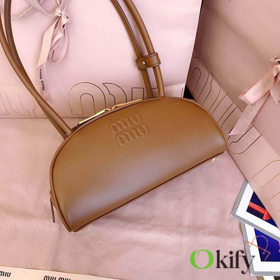 Miu's new semi-circular bowling bag, crafted from top-grade imported calfskin. Its stylish semi-circular design reinterprets the new Beau handbag, boasting a refined, structured shape with rounded lines and a highly versatile silhouette. The extended handles are perfect for the currently popular underarm carrying style, making it suitable for everyday wear. It features the iconic logo on the front, a cotton satin-lined zip pocket, and a slip pocket.