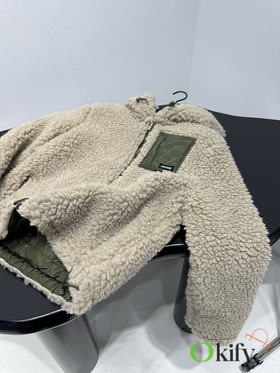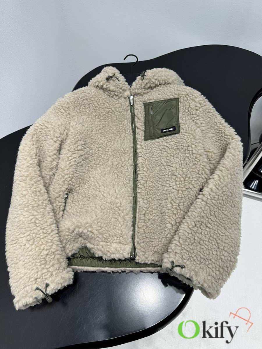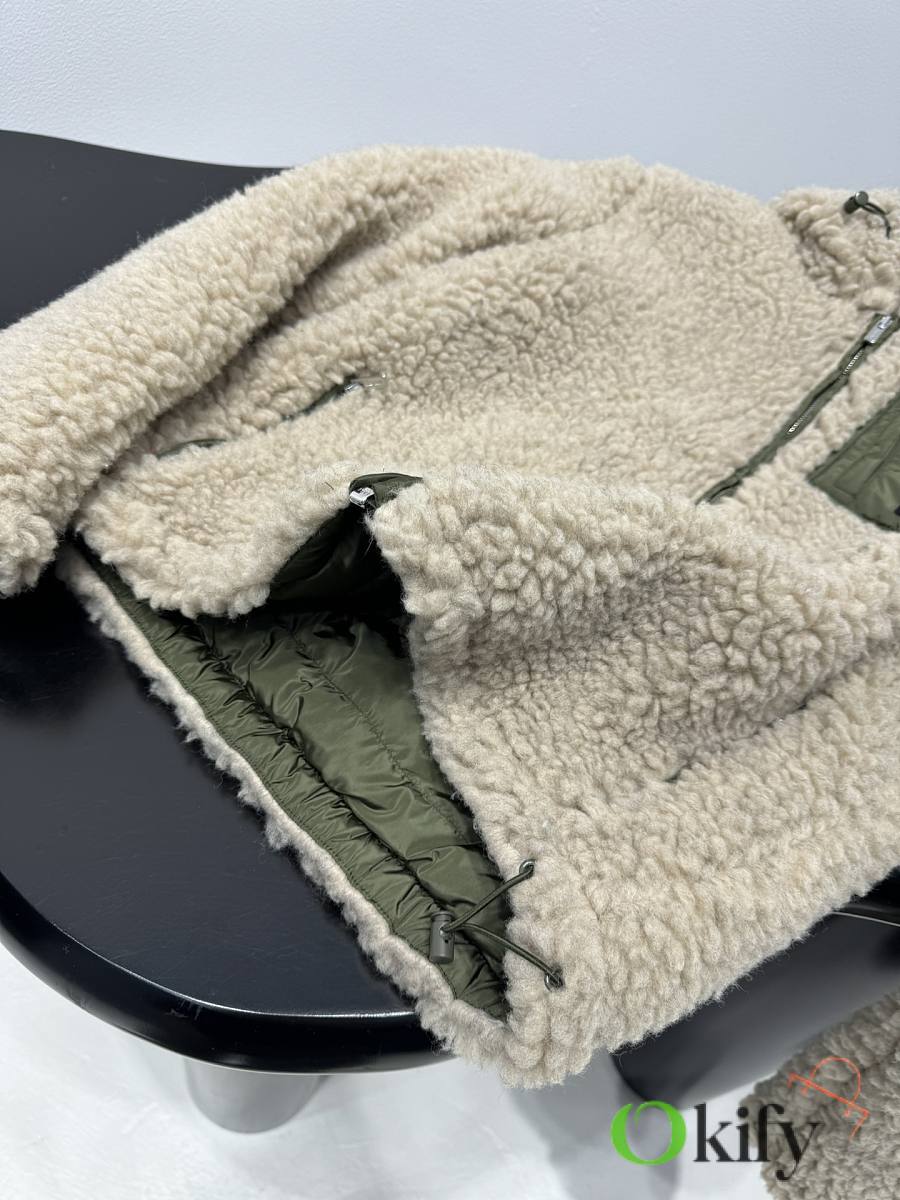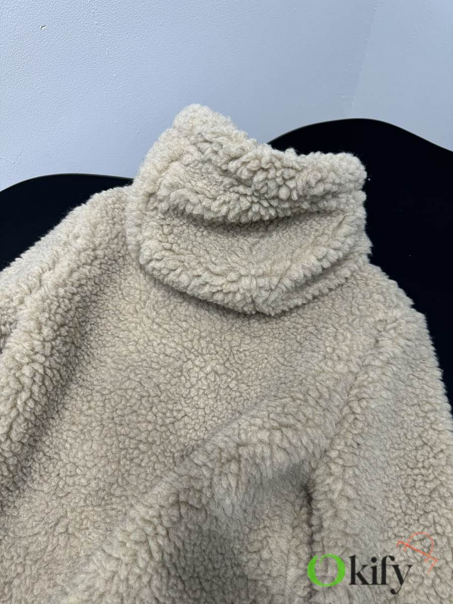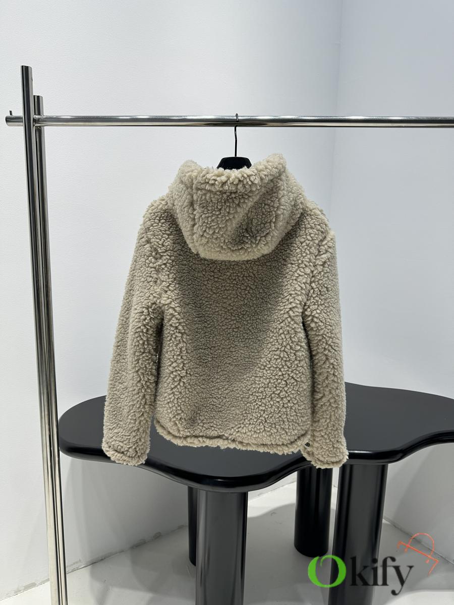 Beige Teddy Fleece Knit Fabric Embroidered with the brand logo Adjustable drawstring cuffs and hem Down filling Nylon fabric lining Hooded zipper closure Unisex