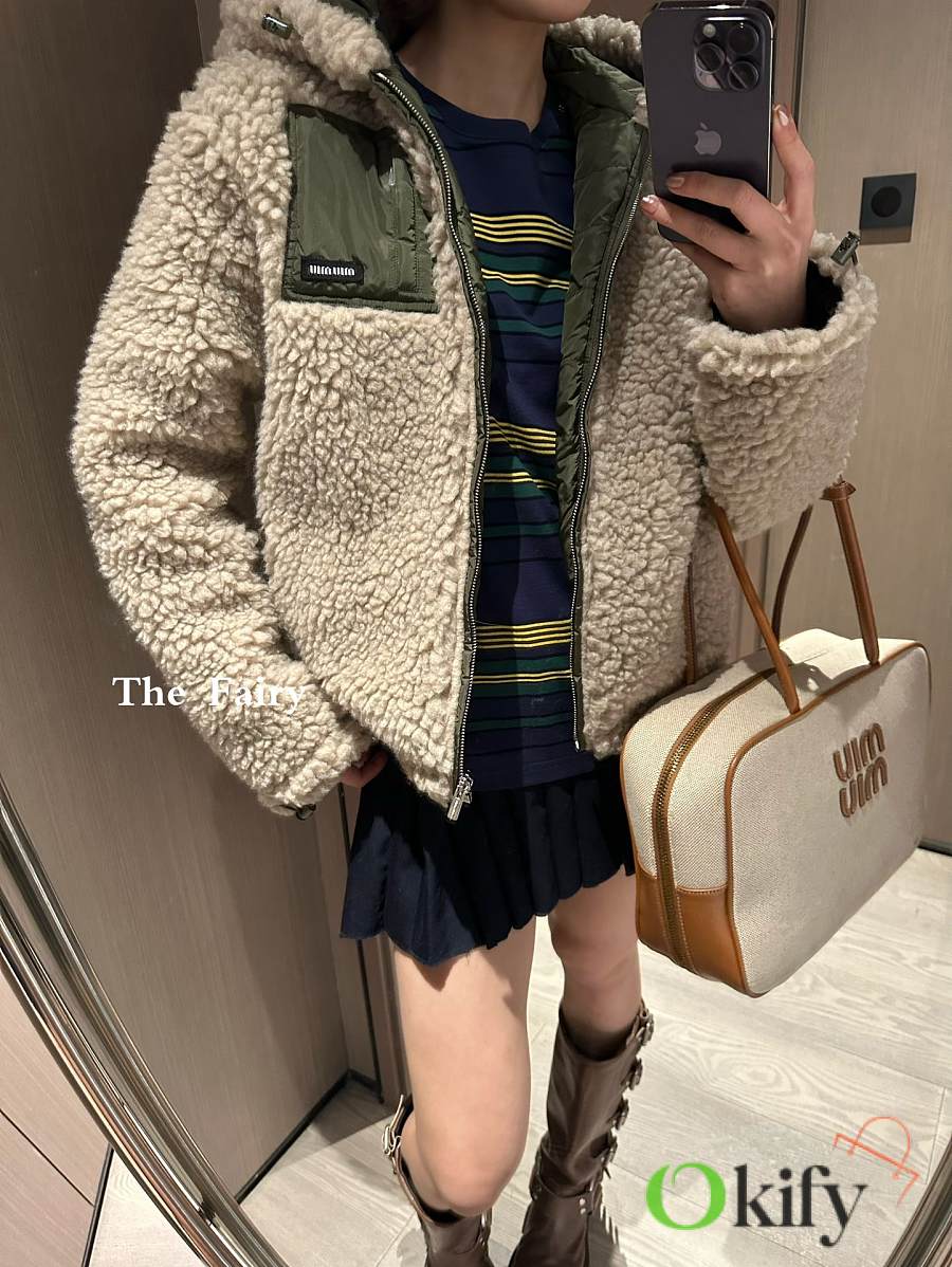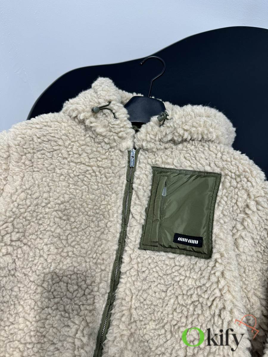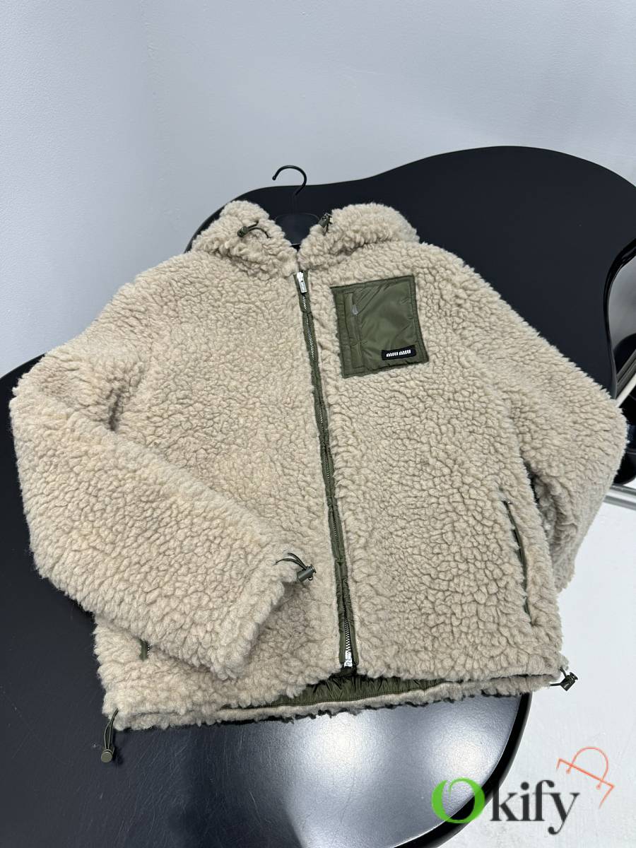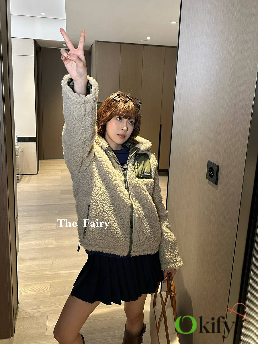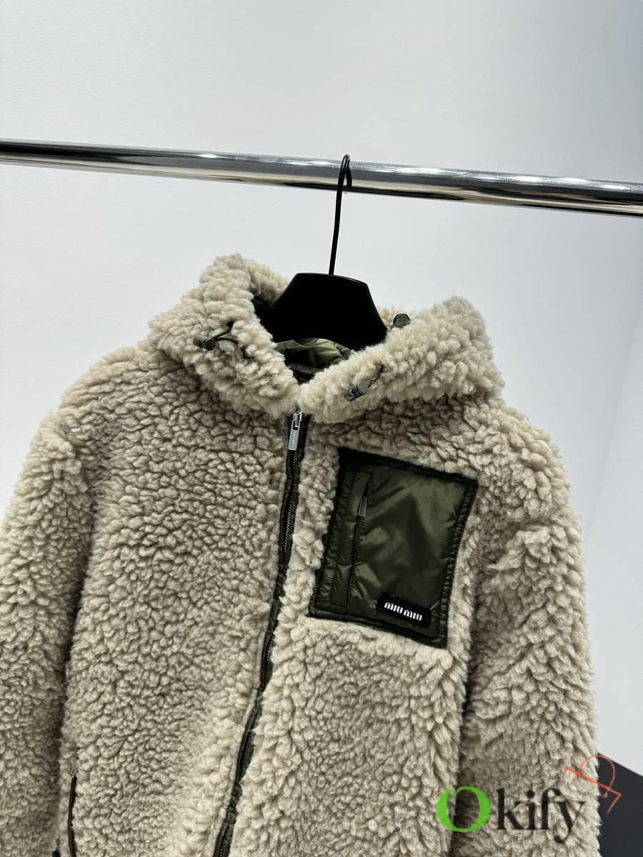 Beige Teddy Fleece Knit Fabric Embroidered with the brand logo Adjustable drawstring cuffs and hem Down filling Nylon fabric lining Hooded zipper closure Unisex