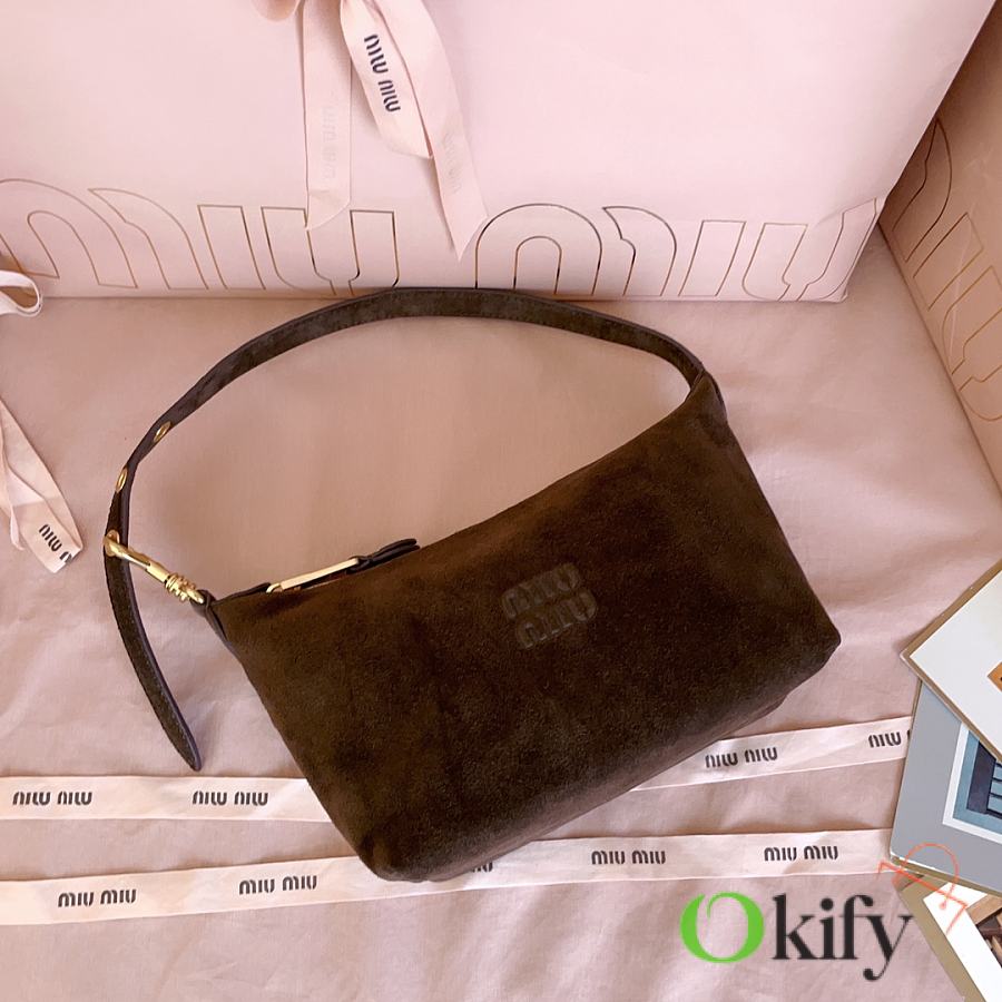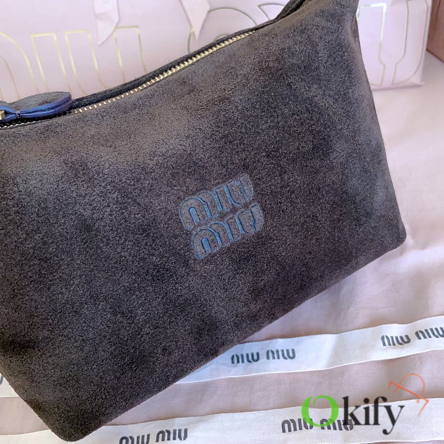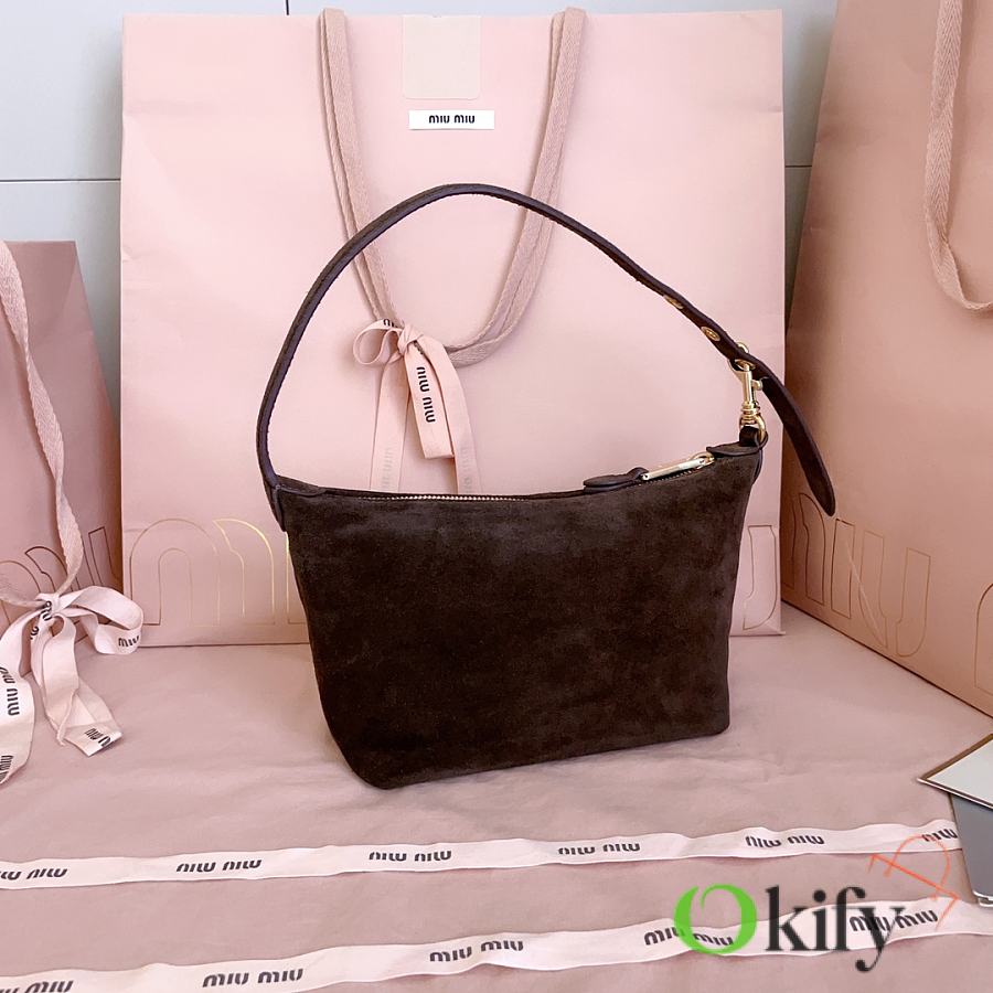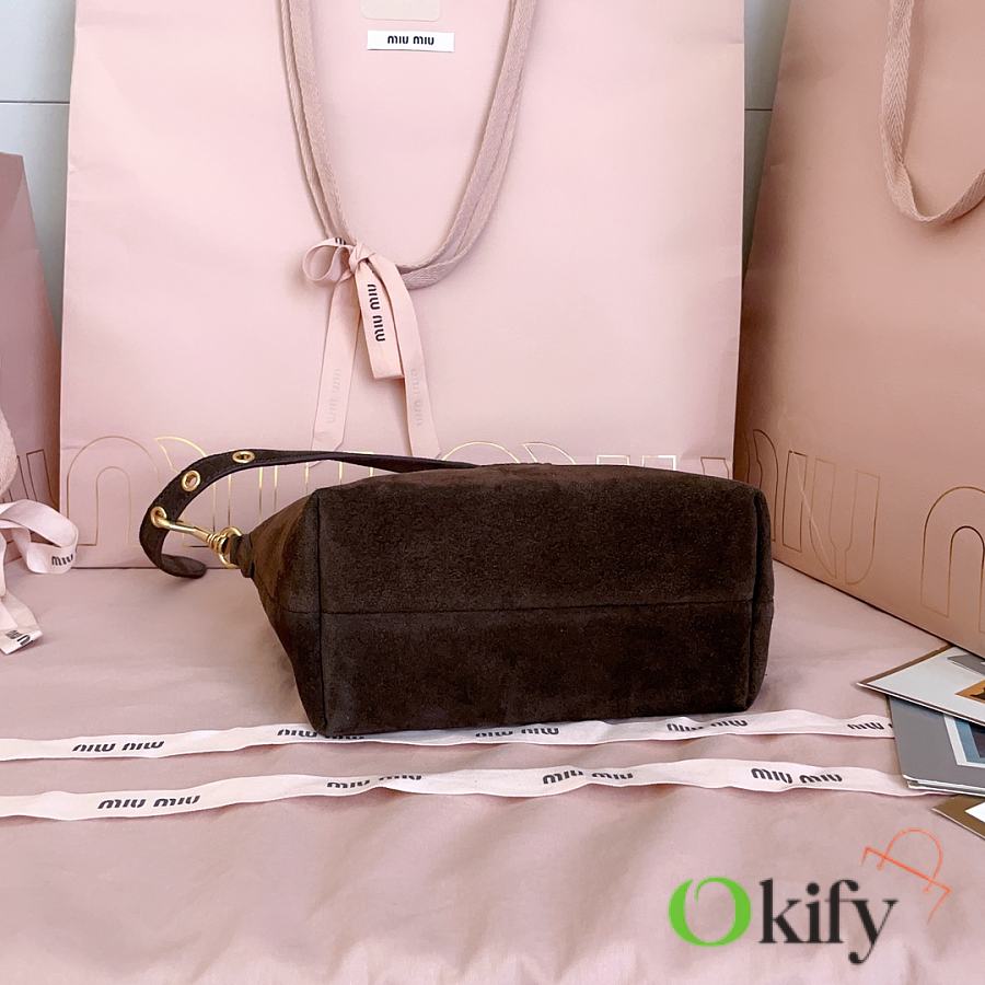 Made with trendy suede leather, featuring the iconic Miu logo embossed on the front, cotton lining, ultra-lightweight, spacious, versatile, and suitable for all seasons. Dimensions: bottom length 19cm, opening width 25.5cm, height 14cm, bottom width 10cm.