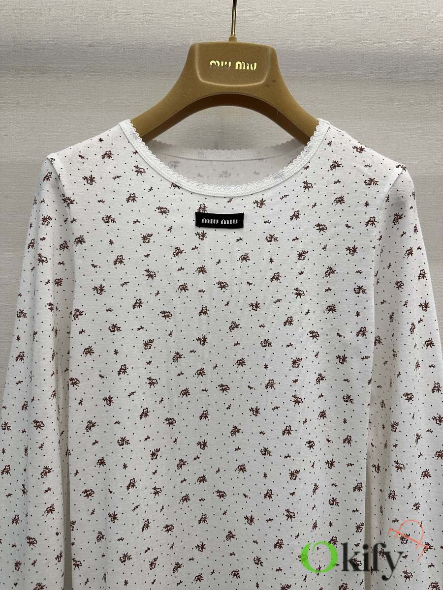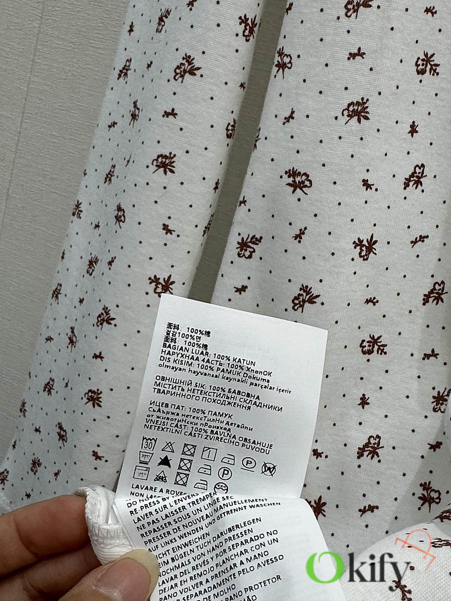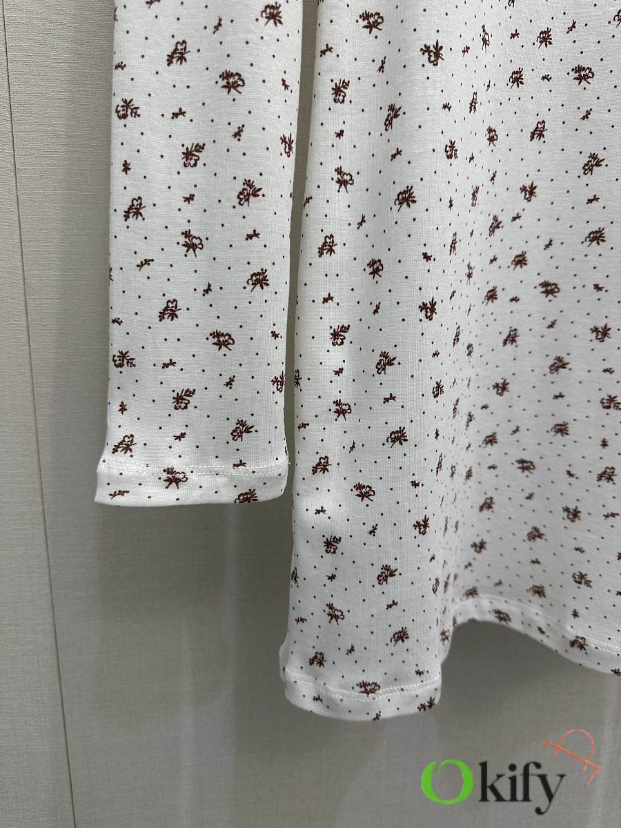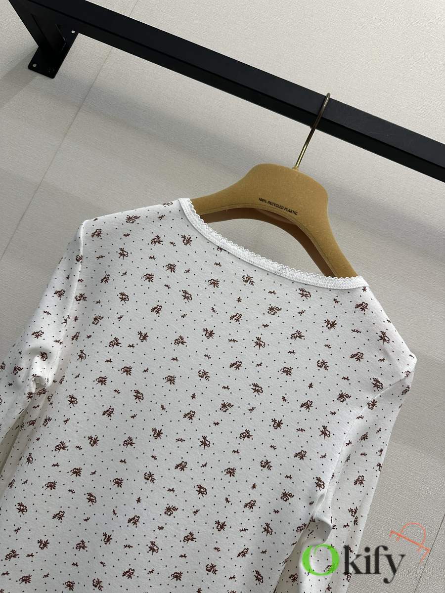 The creamy white base is accented with mini brown floral prints; the delicate pattern exudes a soft and cute girlish charm. The fitted silhouette naturally flatters the figure, while the neckline is adorned with a mini brand logo ribbon, subtly revealing a sweet and cool vibe. The lace trim at the neckline adds a touch of femininity