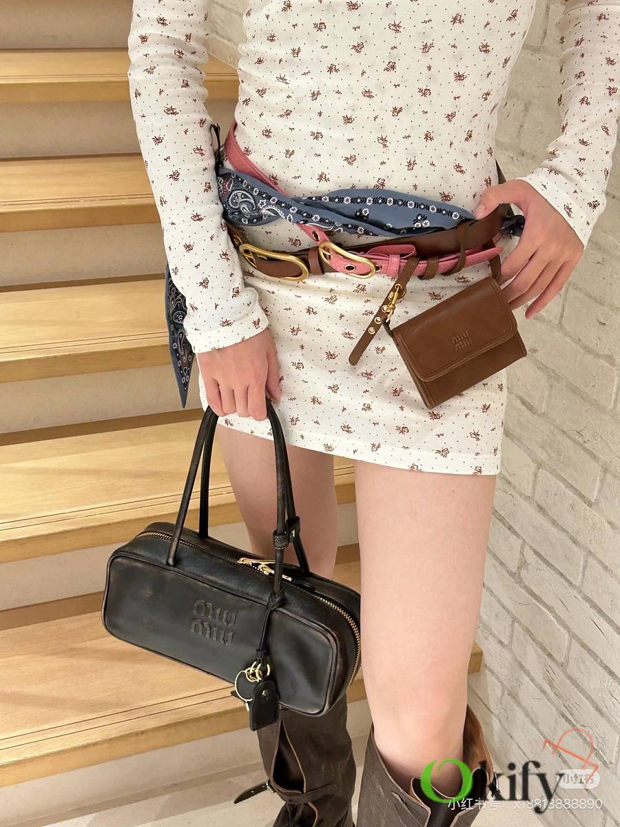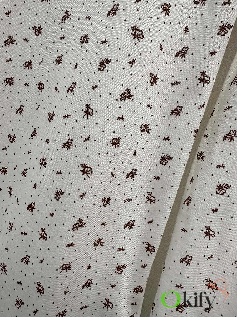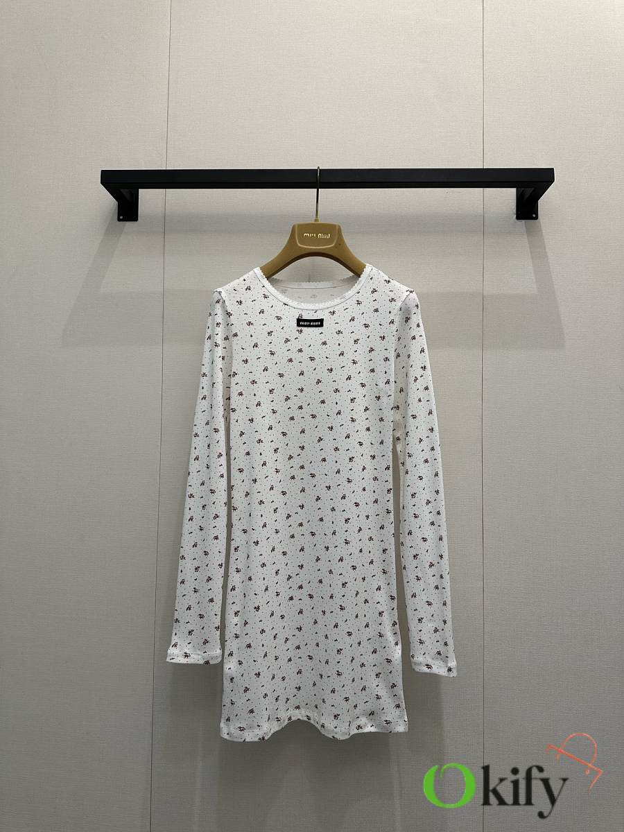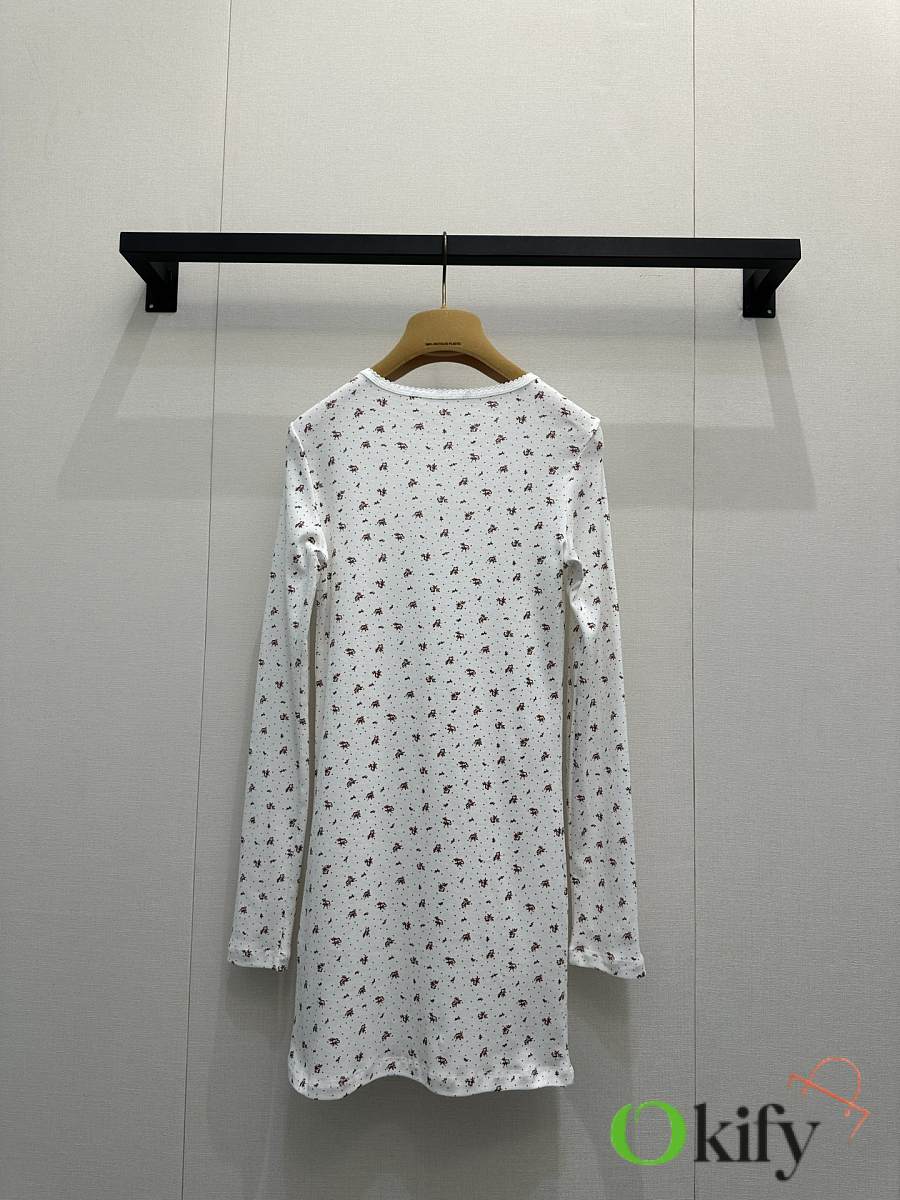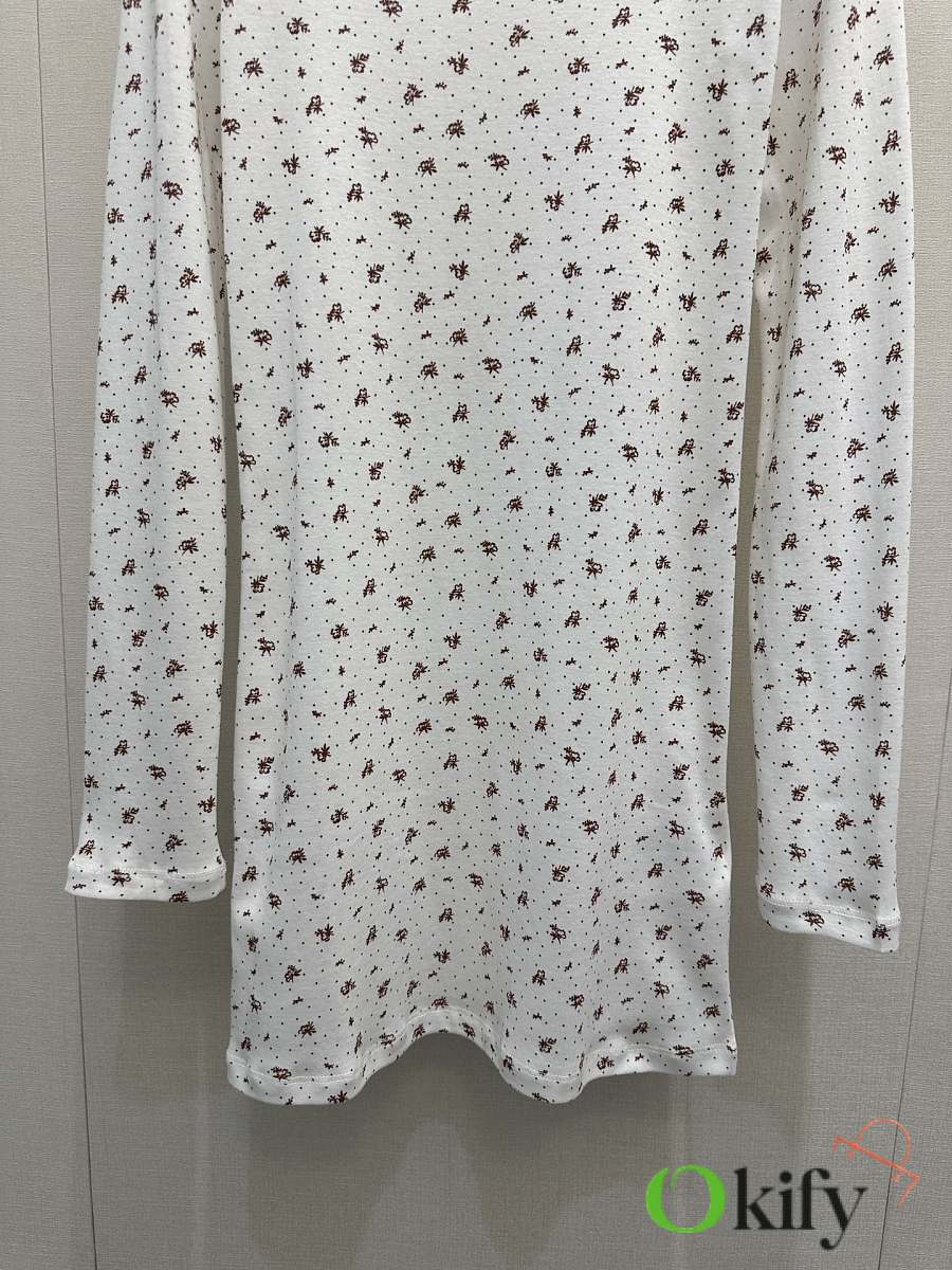 The creamy white base is accented with mini brown floral prints; the delicate pattern exudes a soft and cute girlish charm. The fitted silhouette naturally flatters the figure, while the neckline is adorned with a mini brand logo ribbon, subtly revealing a sweet and cool vibe. The lace trim at the neckline adds a touch of femininity