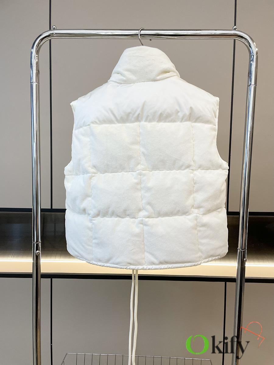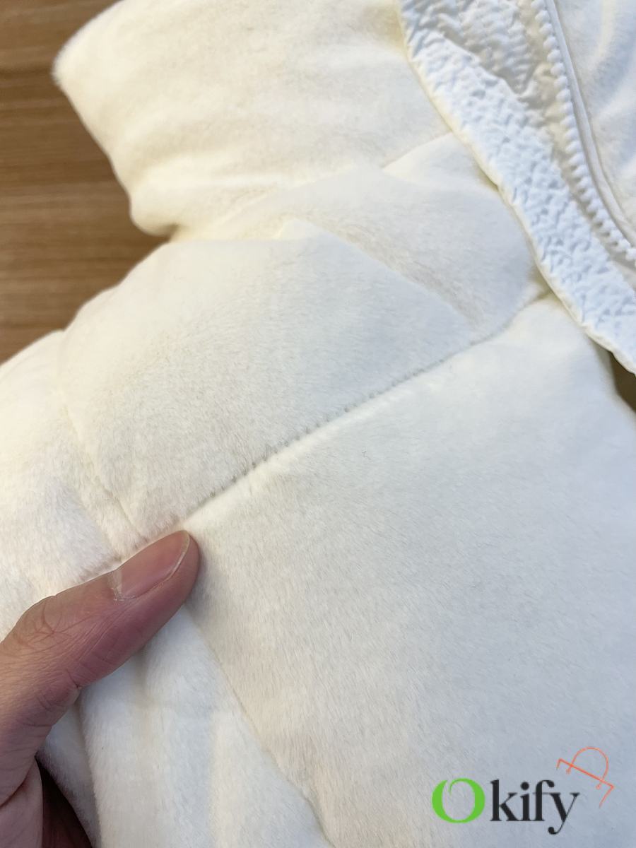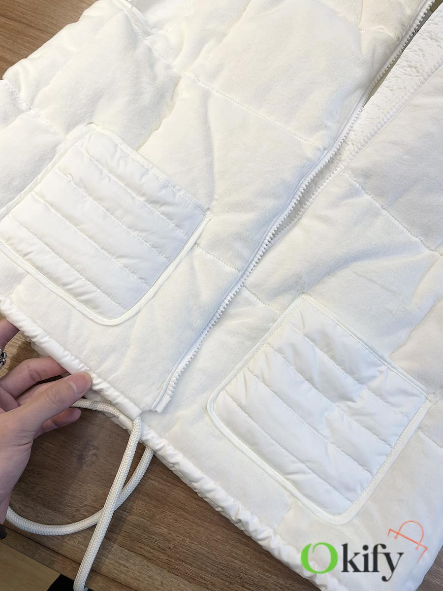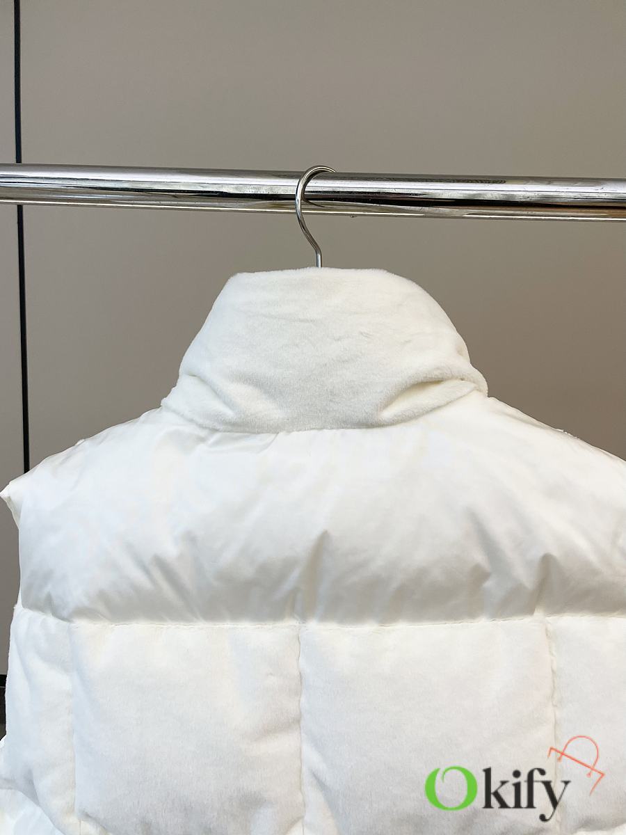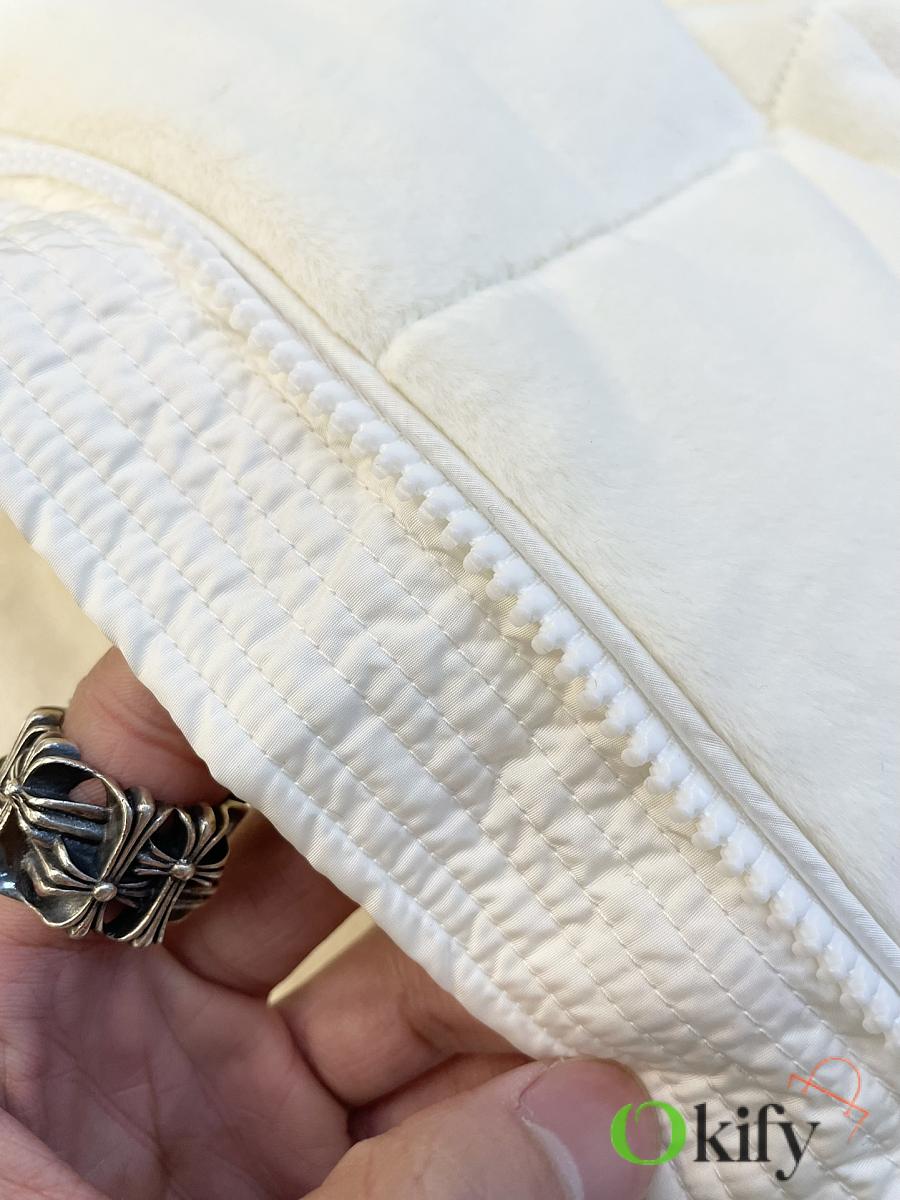Stand-up collar design for wind protection and warmth; logo badge embellishment for a simple yet sophisticated look . Made from soft teddy fleece fabric, paying homage to the playful texture that swept the 1960s. The vest has a soft, fluffy feel, with a cloud-like, cuddly texture that perfectly captures the autumn/winter vibe. Clean and gentle, it looks amazing on ! Fluffy and adorable— the classic puffer jacket design is so sophisticated and stylish! Filled with 90% down (standard quality), lightweight, warm, and comfortable. Custom-made hardware accessories included. The short cut elongates the figure, making it slimming and versatile