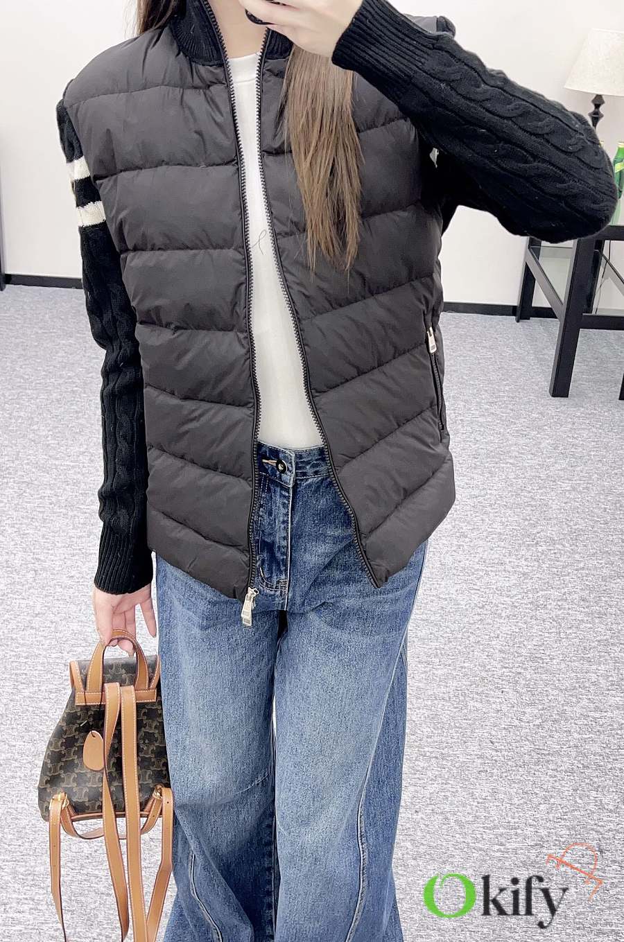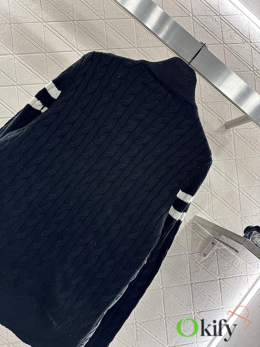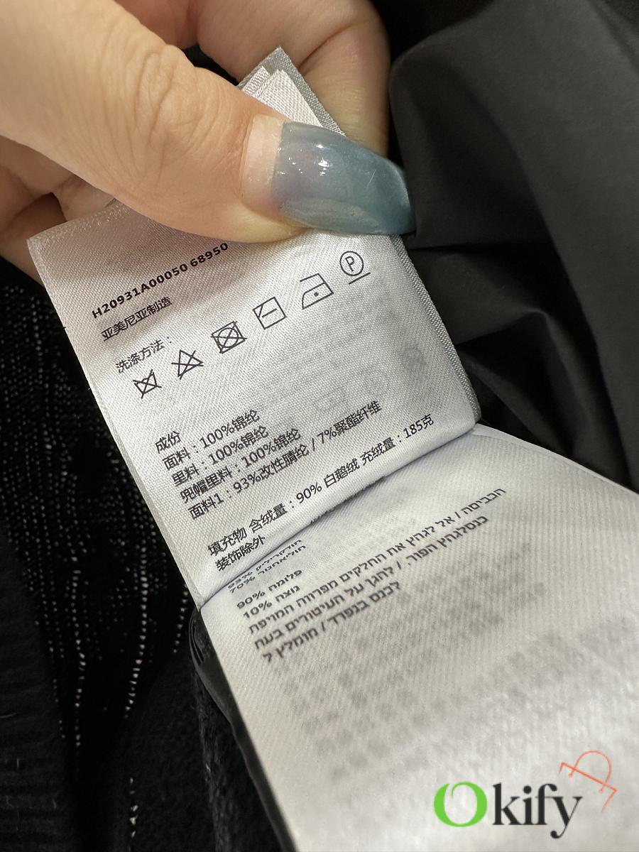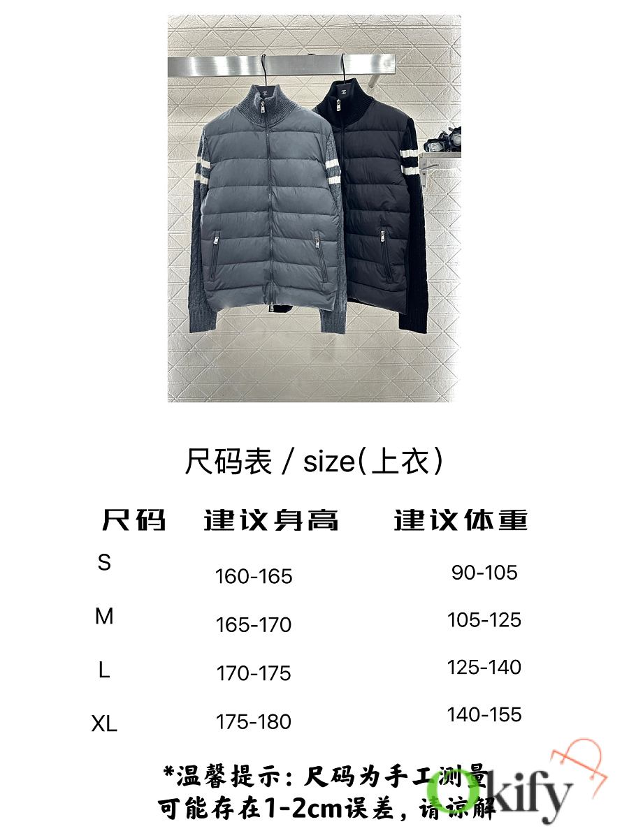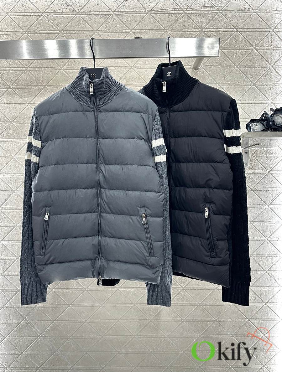 The back panel and sleeves are made of twill cotton, while the front is made of nylon. The craftsmanship is replicated, but the materials have been upgraded, featuring a plush texture and windproof properties for added warmth. The inner lining is filled with white goose down, making the entire garment lightweight and warm. It features a zippered stand-up collar, classic rectangular embossed detailing on the torso for versatile styling, and knitted plain knit fabric on the arms with contrasting striped horizontal stripes. The fabric is highly elastic and provides a snug fit for added warmth. The zipper and buckle are adorned with the iconic logo, showcasing a subtle yet sophisticated feel. Exquisite details successfully break away from monotony, combining warmth and style. Customized fabrics and trims, please ensure you choose the correct version. Down filling standard: National Standard 90% down. Filling material: High-quality white goose down