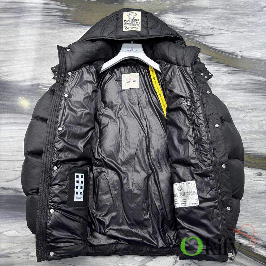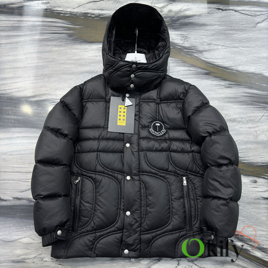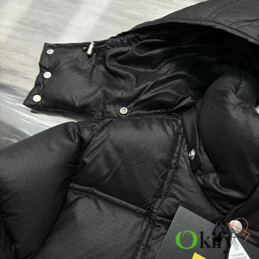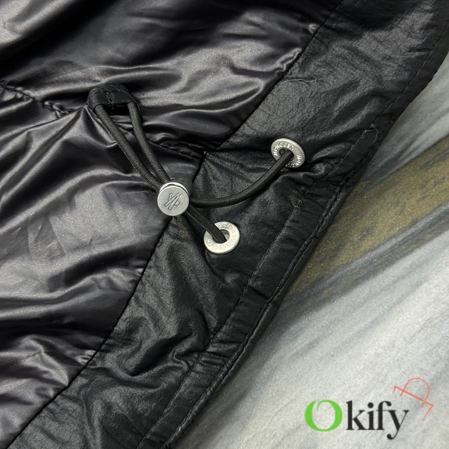 Material: Nylon Feature: Warmth Fit: Loose, Medium Length, Cropped Collar, Removable Hood Content: 100% Nylon Collar: 100% Nylon Shell: 100% Nylon Lining: 100% Nylon Hood Lining: Nylon Style: Quilted Down Jacket with Zippered Sleeves, Regular Sleeve Length