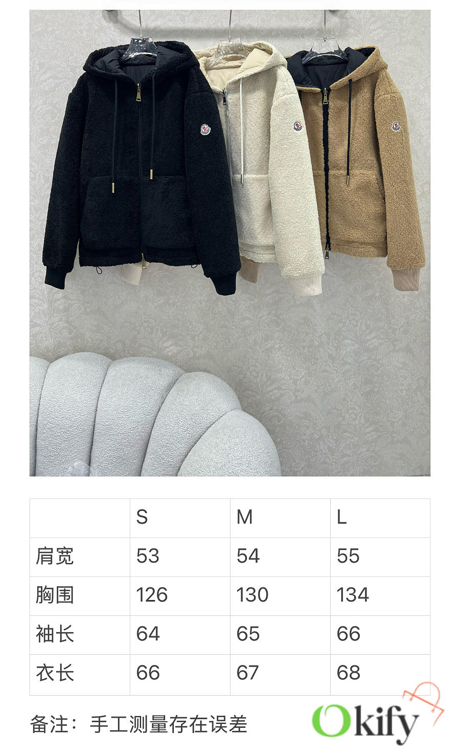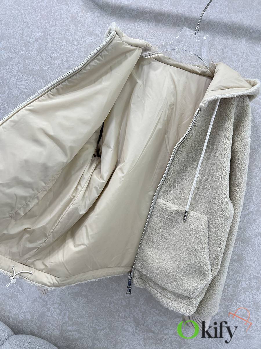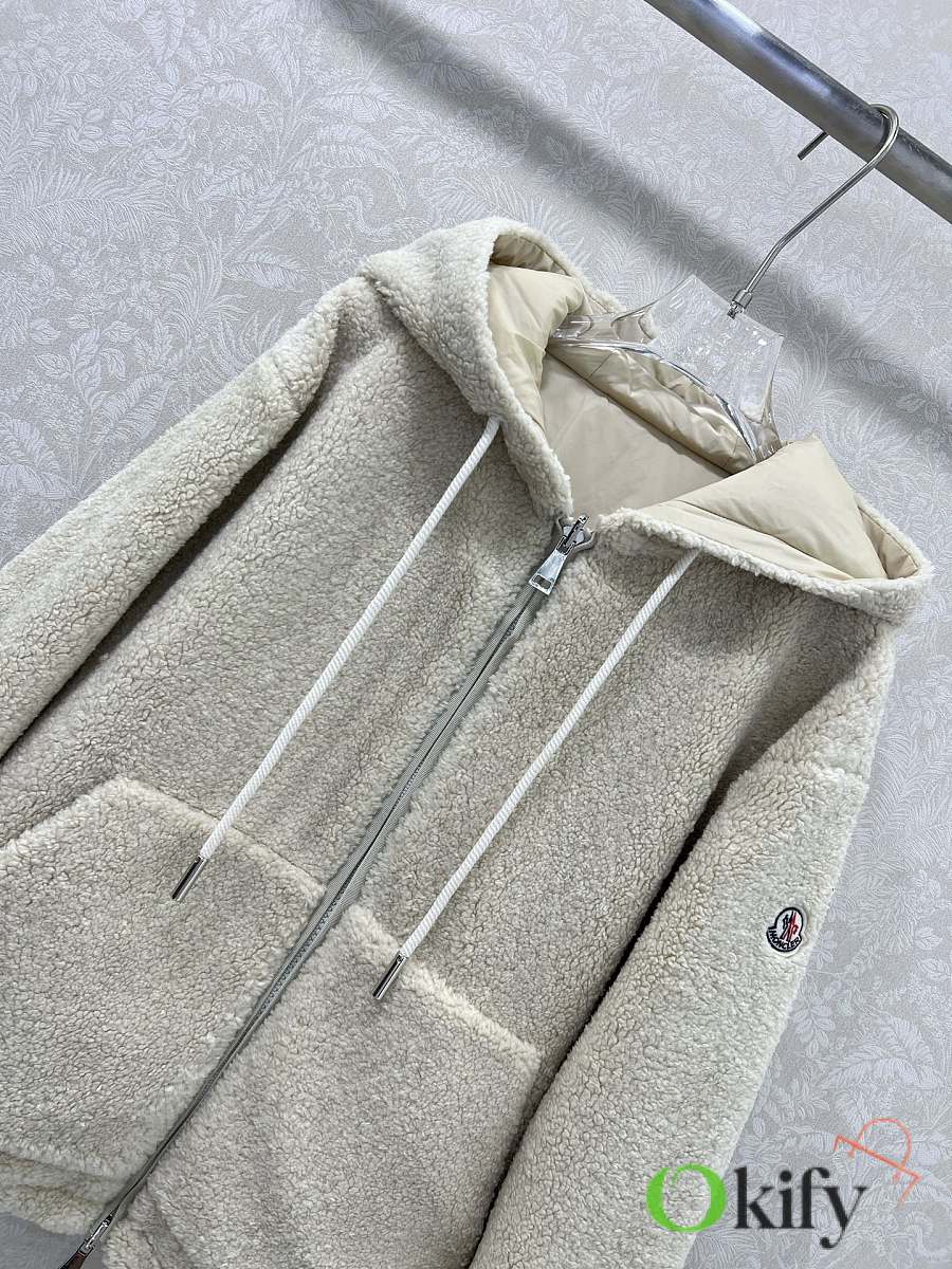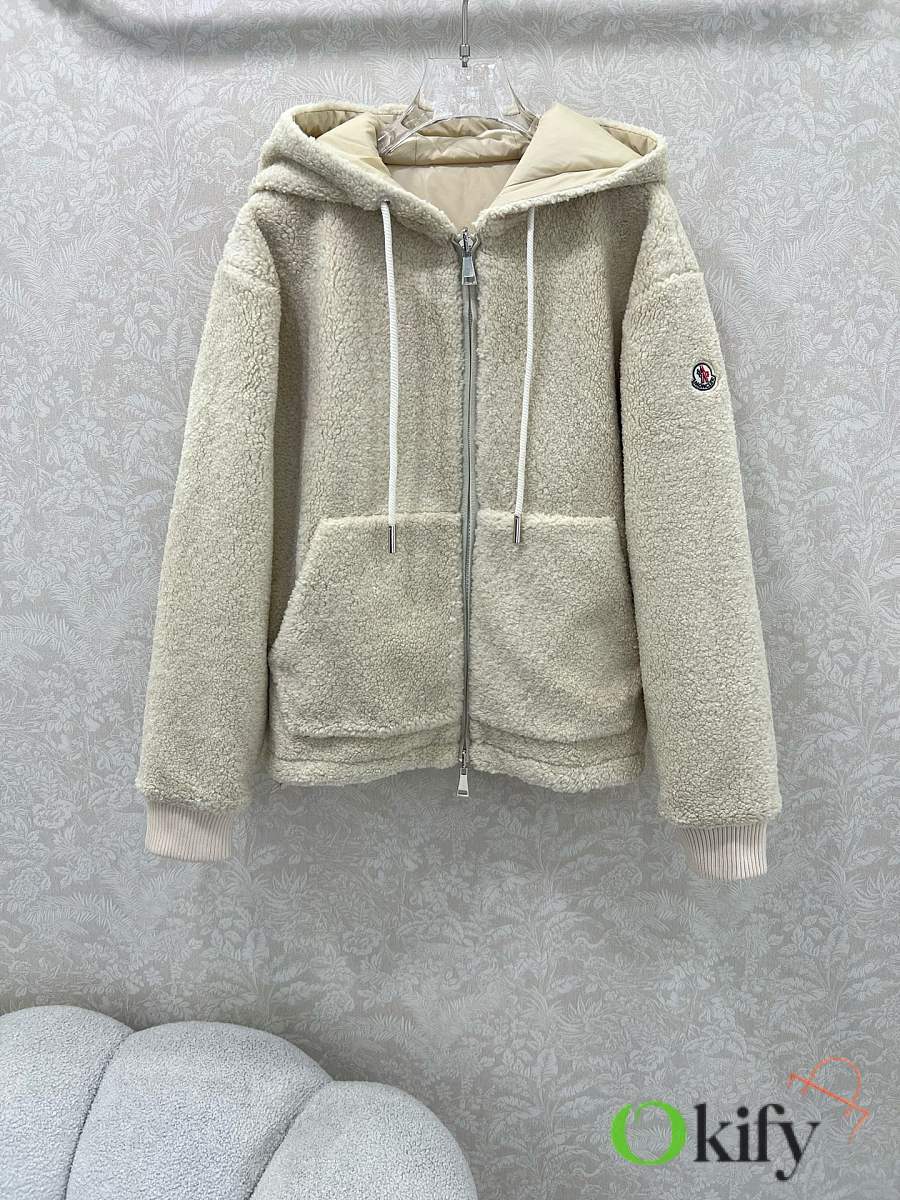 Moncle's new reversible hooded Teddy lambskin jacket, made of waterproof nylon with ample fleece, offers windproof protection and is easy to put on and take off. The hooded plush zipper jacket comes in three stylish and versatile colors. One side is made of grainy lambskin, with a thick, warm drawstring and a signature metal stamped logo at the end and a badge on the outside of the arm, highlighting the brand's style and adding a touch of luxury. The other side is made of smooth, skin-friendly nylon with elastic drawstrings at the cuffs, making it suitable for a variety of wear occasions and personal styles. The regular loose fit is fashionable and inclusive, making it a versatile and versatile item for fall and winter. It has a high-quality texture and is a warm winter jacket you won't regret buying