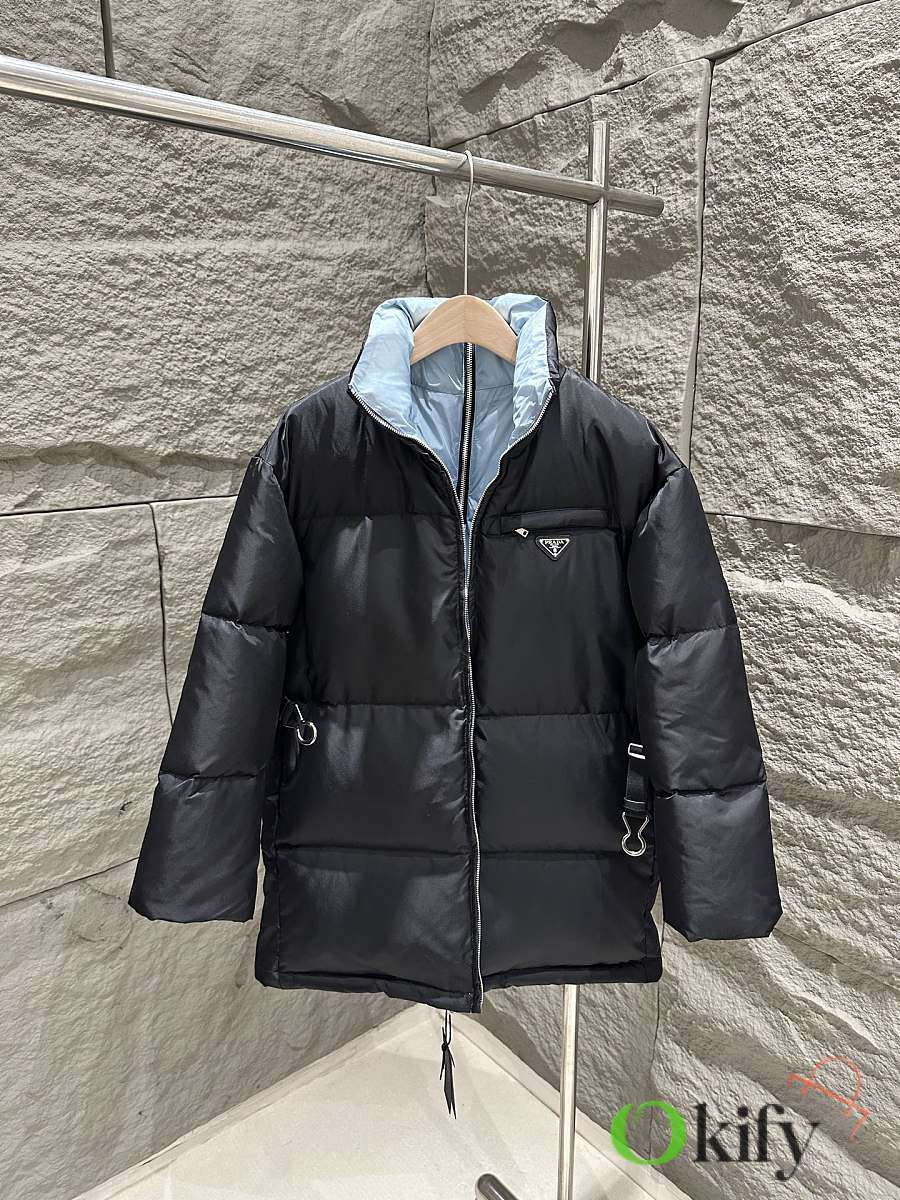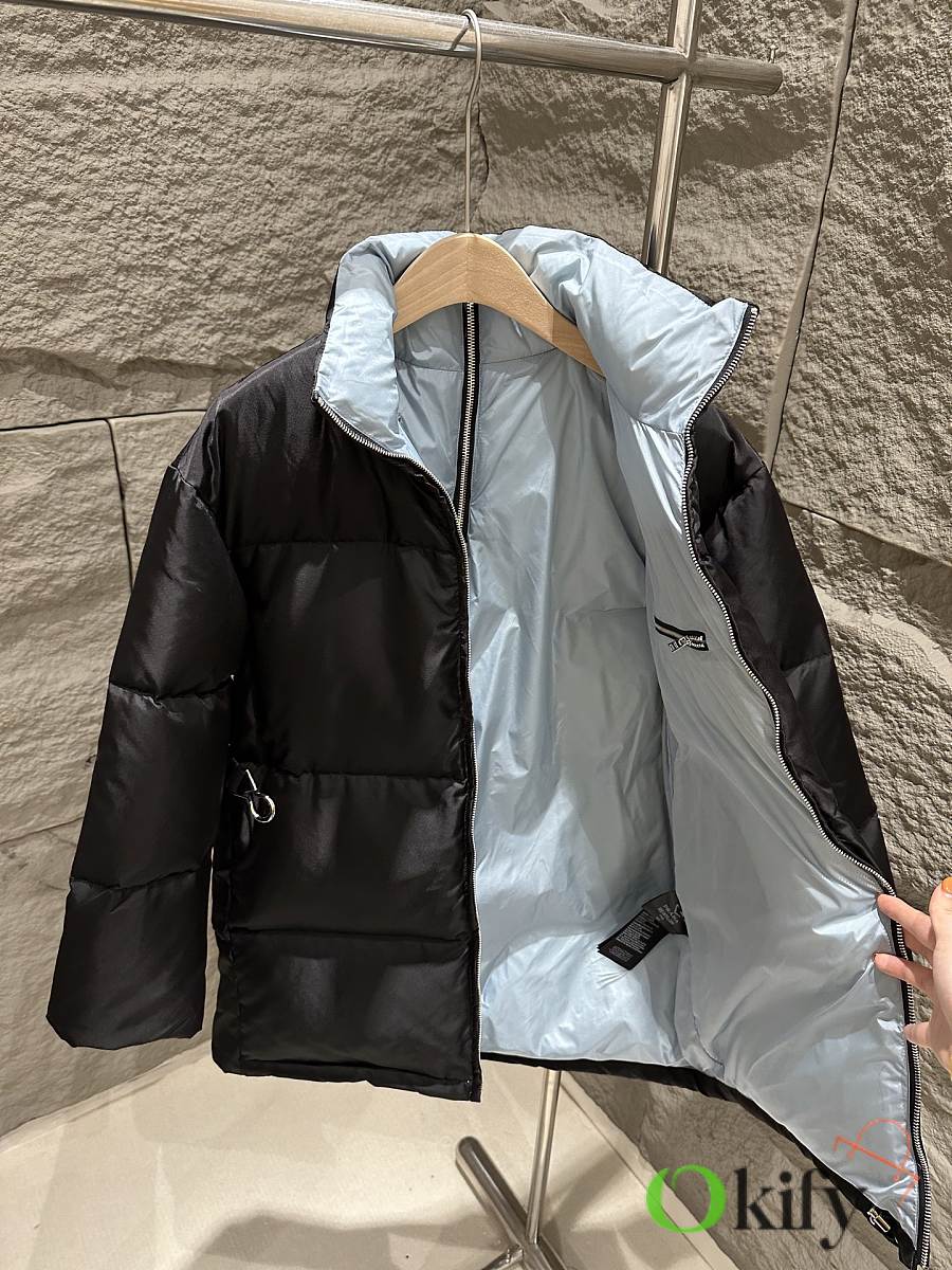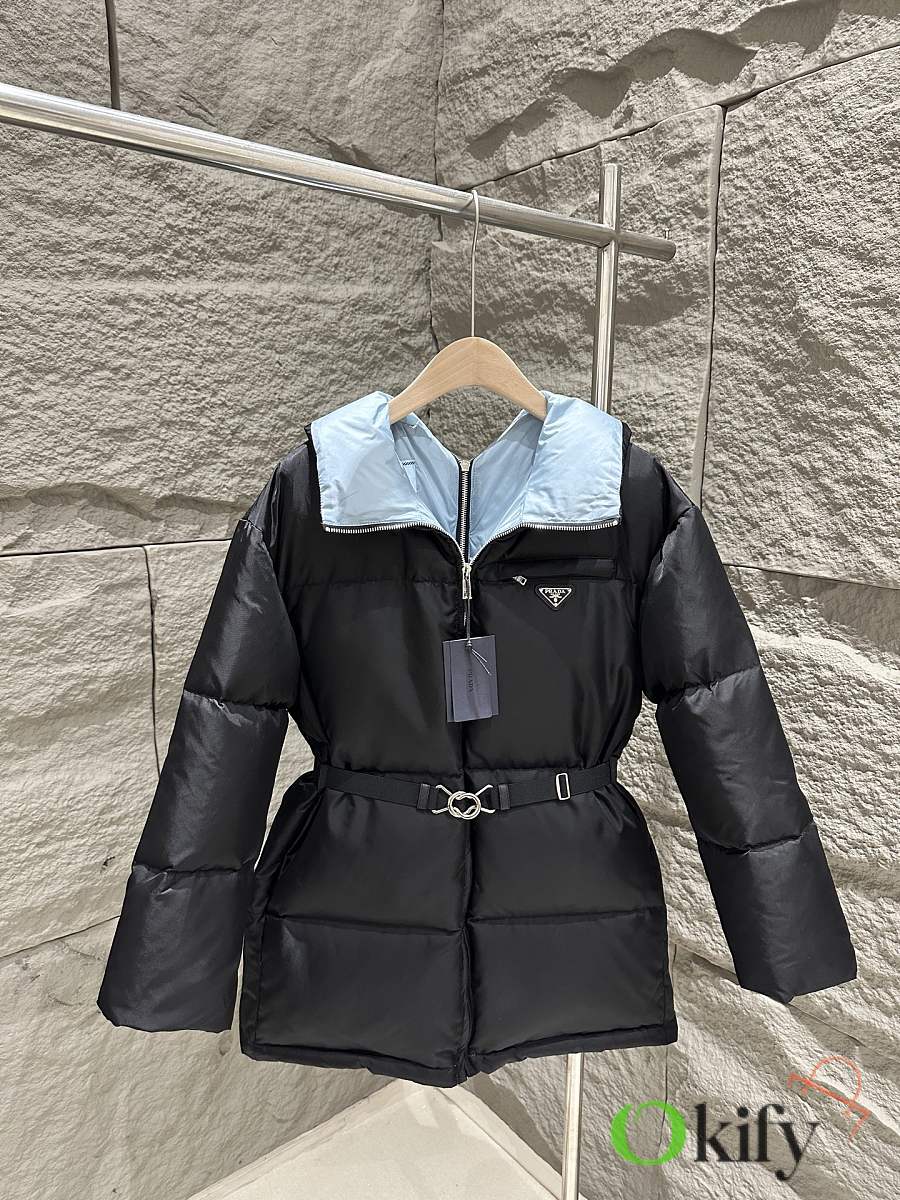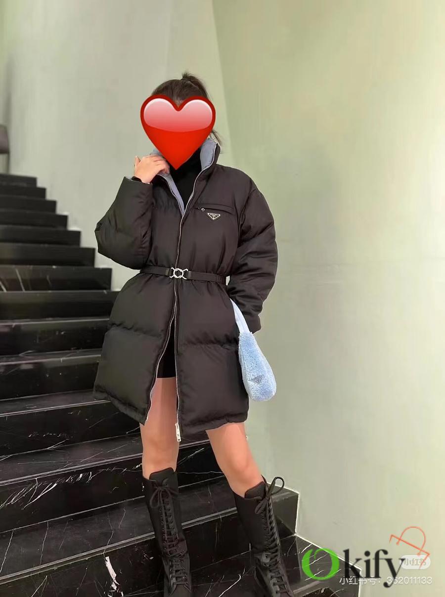 The classic black recycled nylon fabric from P brand is paired with a sky-blue lining for a striking color contrast, adding depth and dimension. The stand-up collar and half-open back zipper complete the design, maximizing style. A detachable elastic belt allows for both a fitted and relaxed fit, flattering your figure and unlocking more styling possibilities. The triangular logo badge on the chest ensures high brand recognition, and the mid-length design is practical and versatile, suitable for both work and leisure.