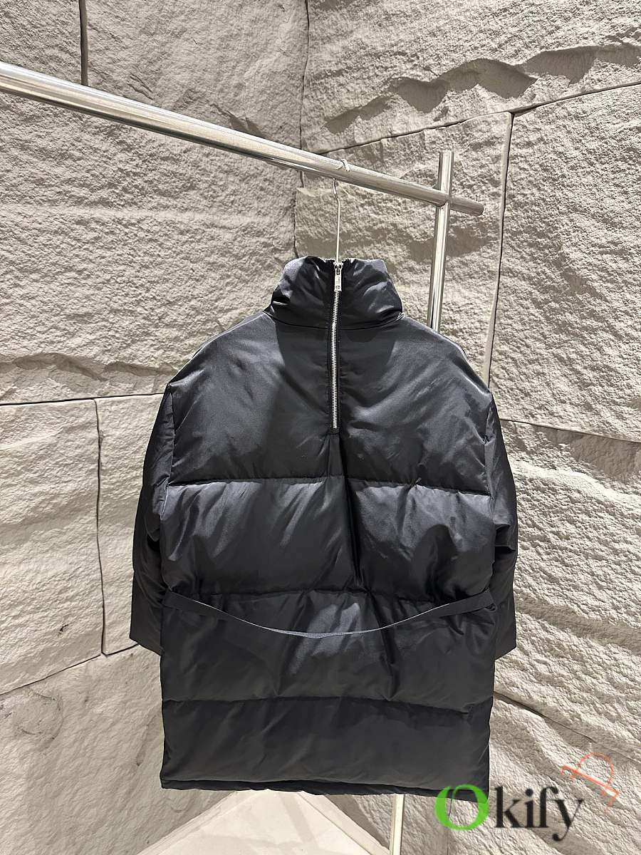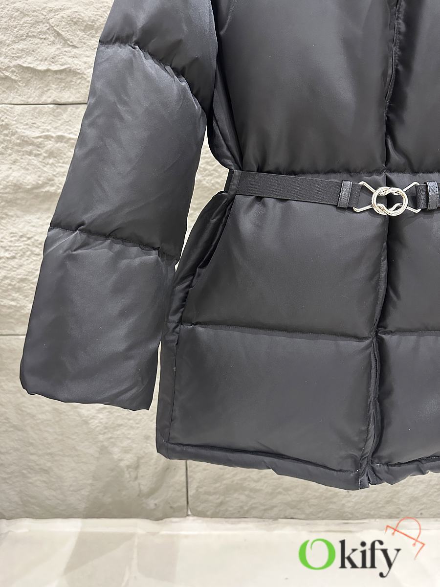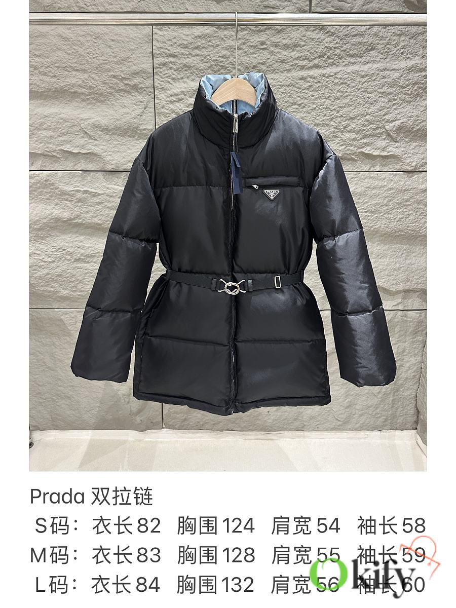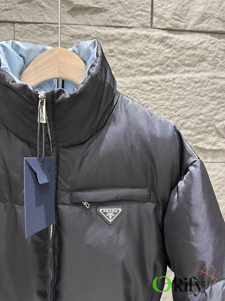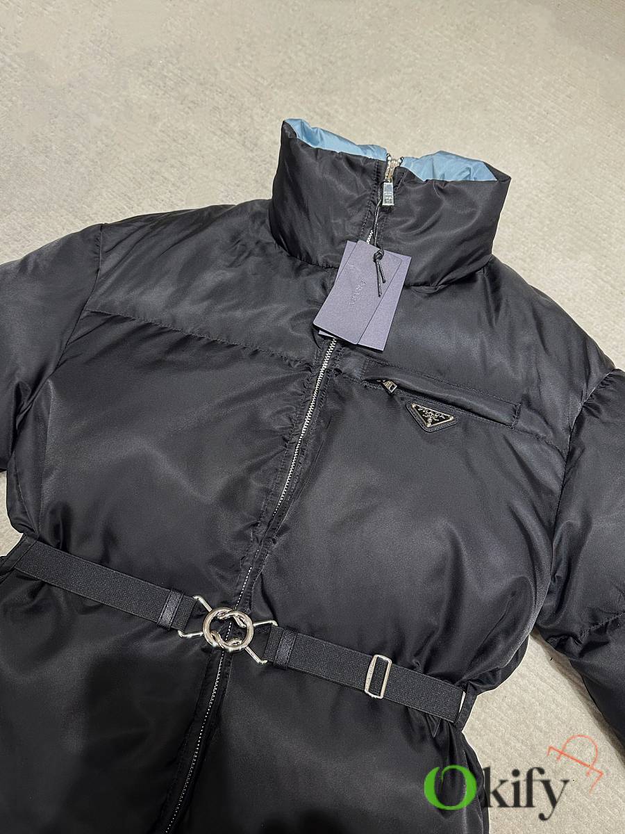The classic black recycled nylon fabric from P brand is paired with a sky-blue lining for a striking color contrast, adding depth and dimension. The stand-up collar and half-open back zipper complete the design, maximizing style. A detachable elastic belt allows for both a fitted and relaxed fit, flattering your figure and unlocking more styling possibilities. The triangular logo badge on the chest ensures high brand recognition, and the mid-length design is practical and versatile, suitable for both work and leisure.
