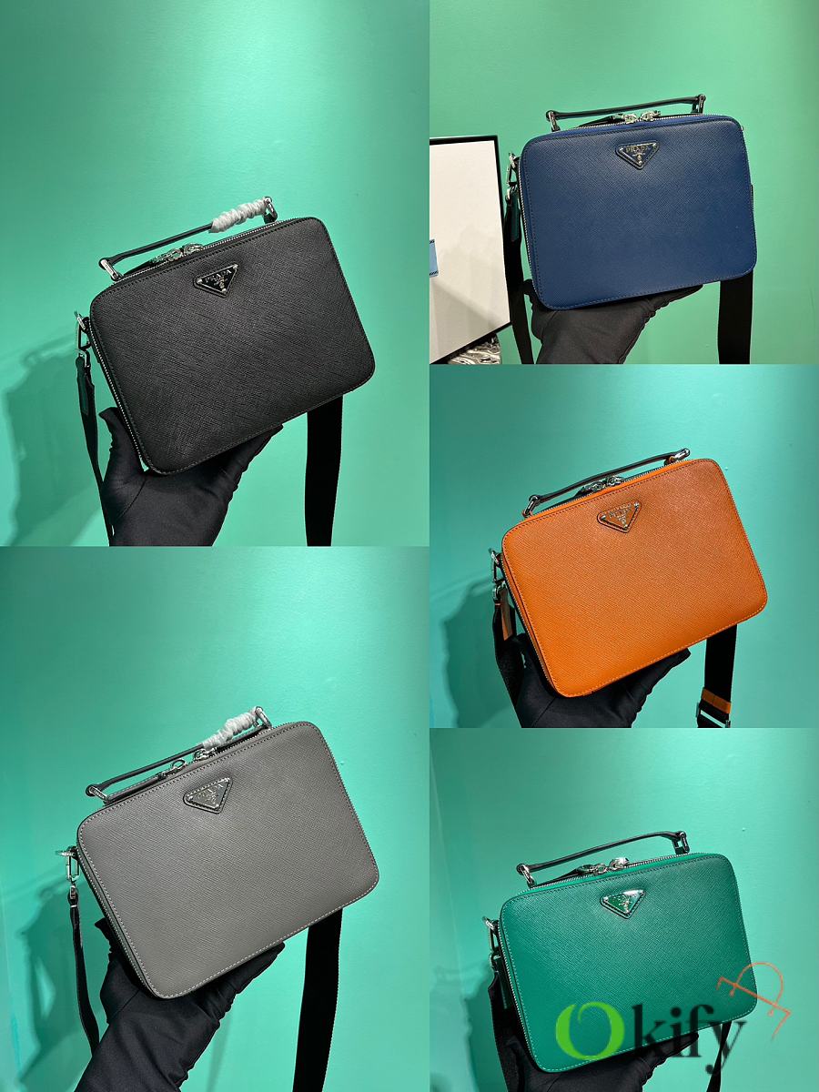 P men's new shoulder bag Saffiano leather material, metal hardware, leather shoulder strap, leather top handle, internal logo plate, enameled triangle logo on the outside, zipper closure