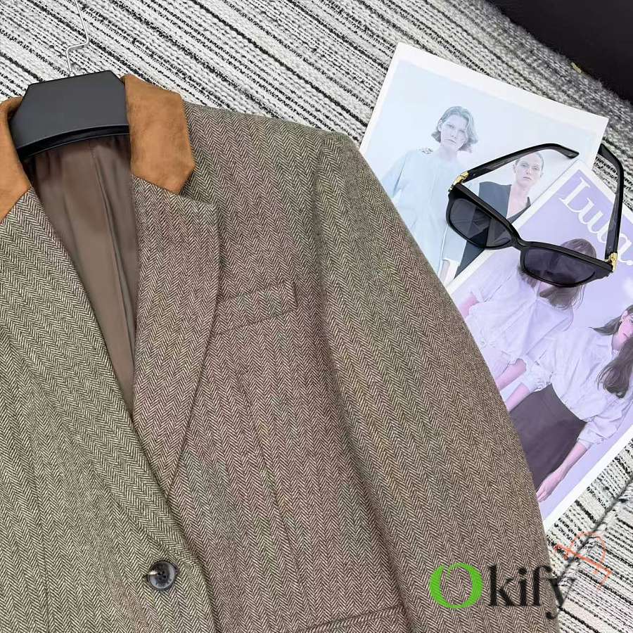 color-blocked leather lapel herringbone suit jacket with a triangular logo on the back
