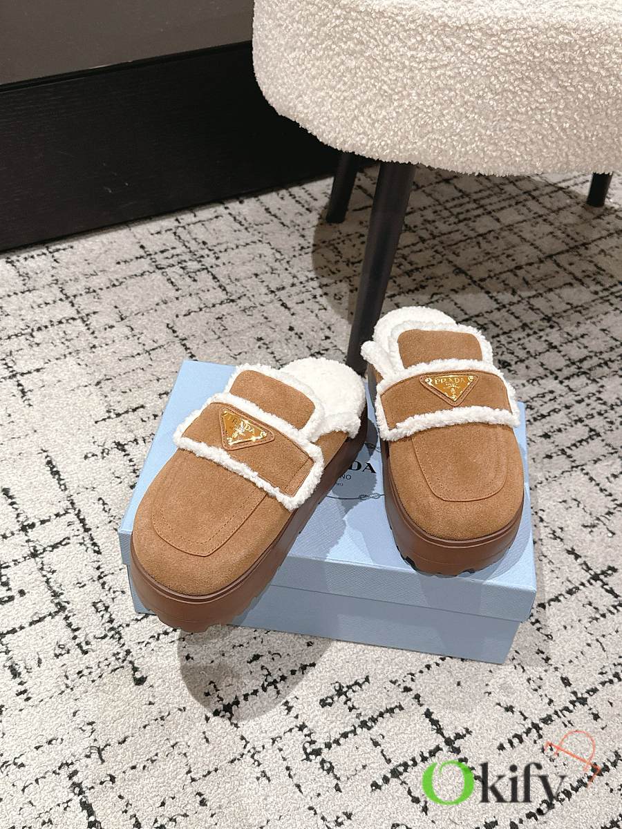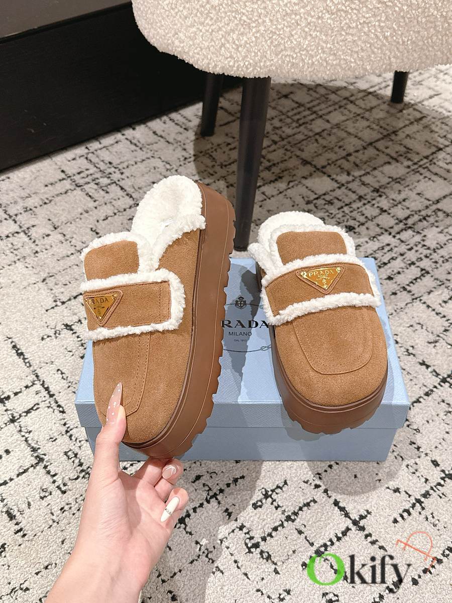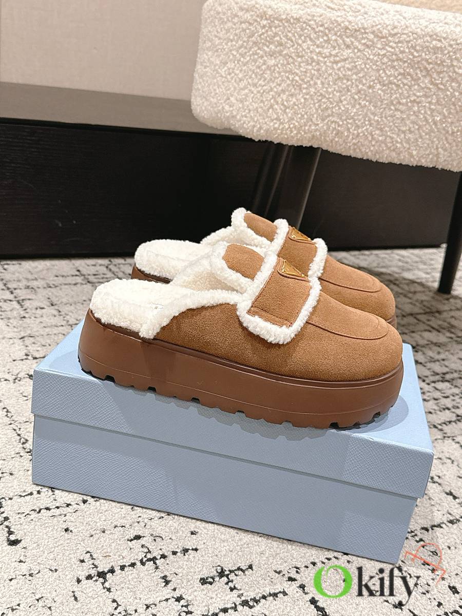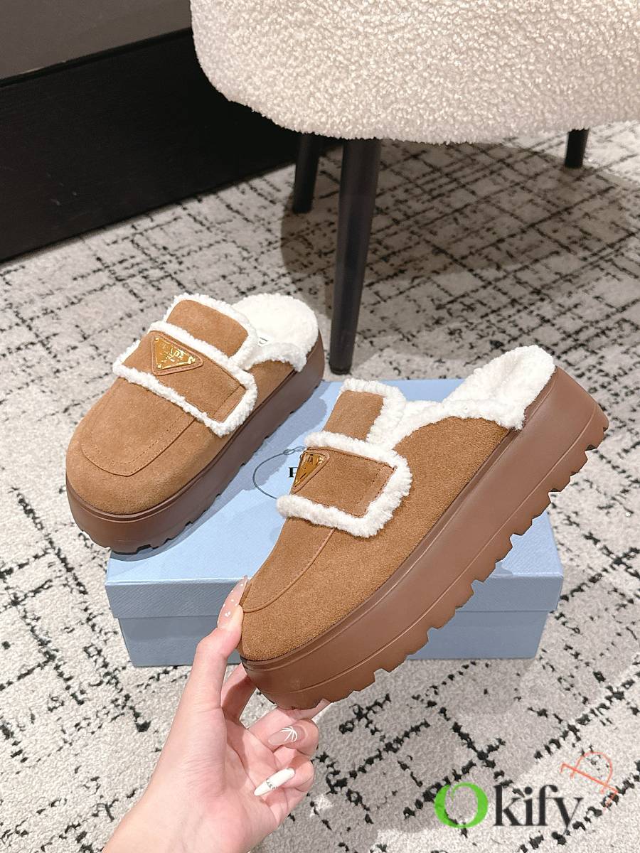 Okify Prada Brown Wool Women Slippers With Thick Soles And Covered Toe 1