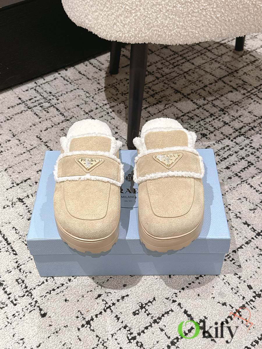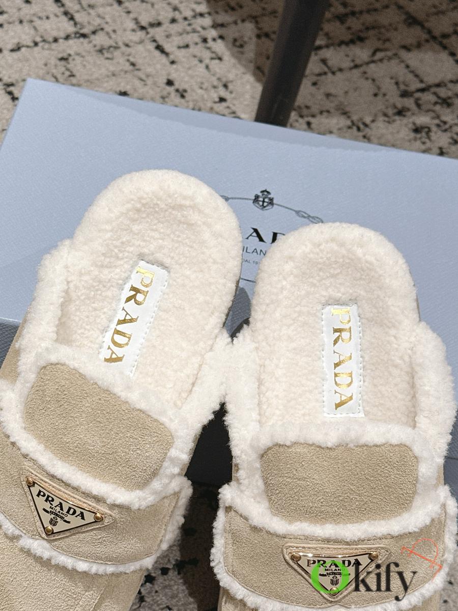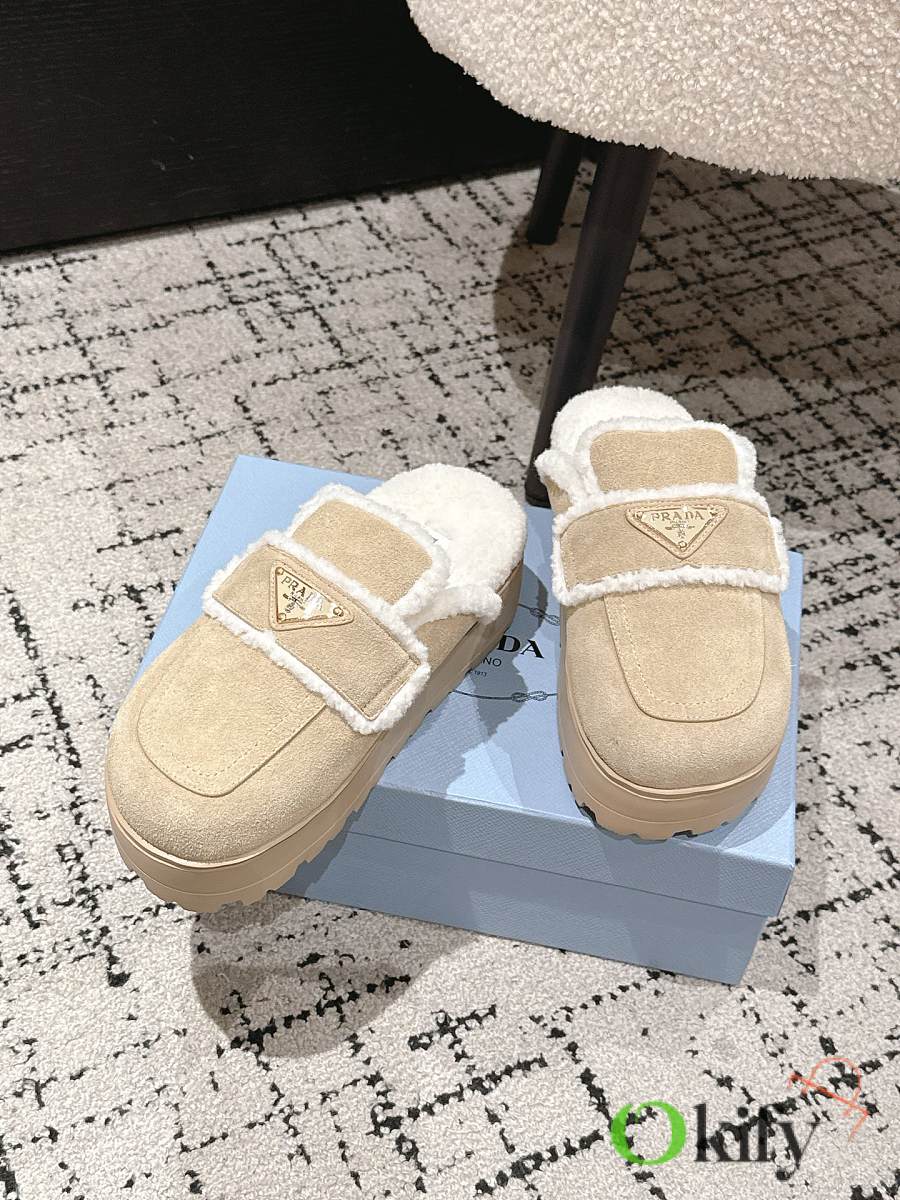 Okify Prada Cream Wool Women Slippers With Thick Soles And Covered Toe 1