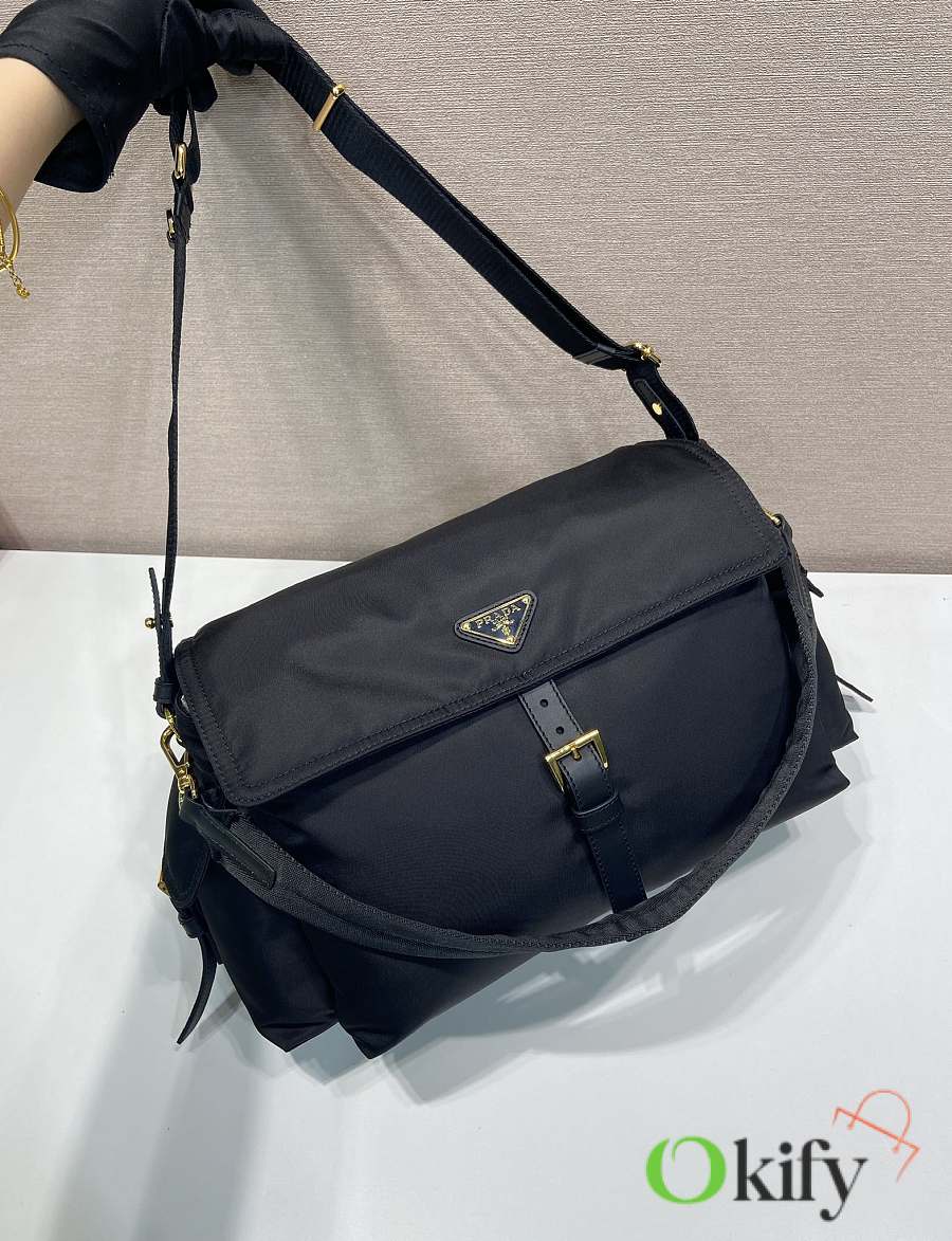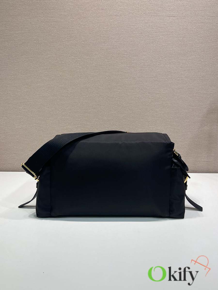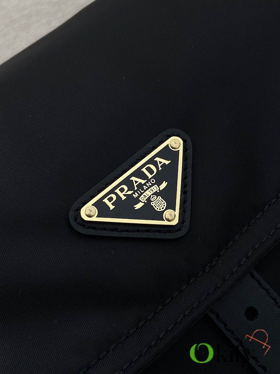 This handbag perfectly blends sophistication and functionality. Made from recycled nylon, it features a soft silhouette and multiple pockets. The lightweight and practical design combines sporty and versatile elements, adorned with an enamel triangular metal logo and leather details. It comes with two detachable shoulder straps, is spacious, and simply perfect. Another timeless and popular style, the large size is unisex.