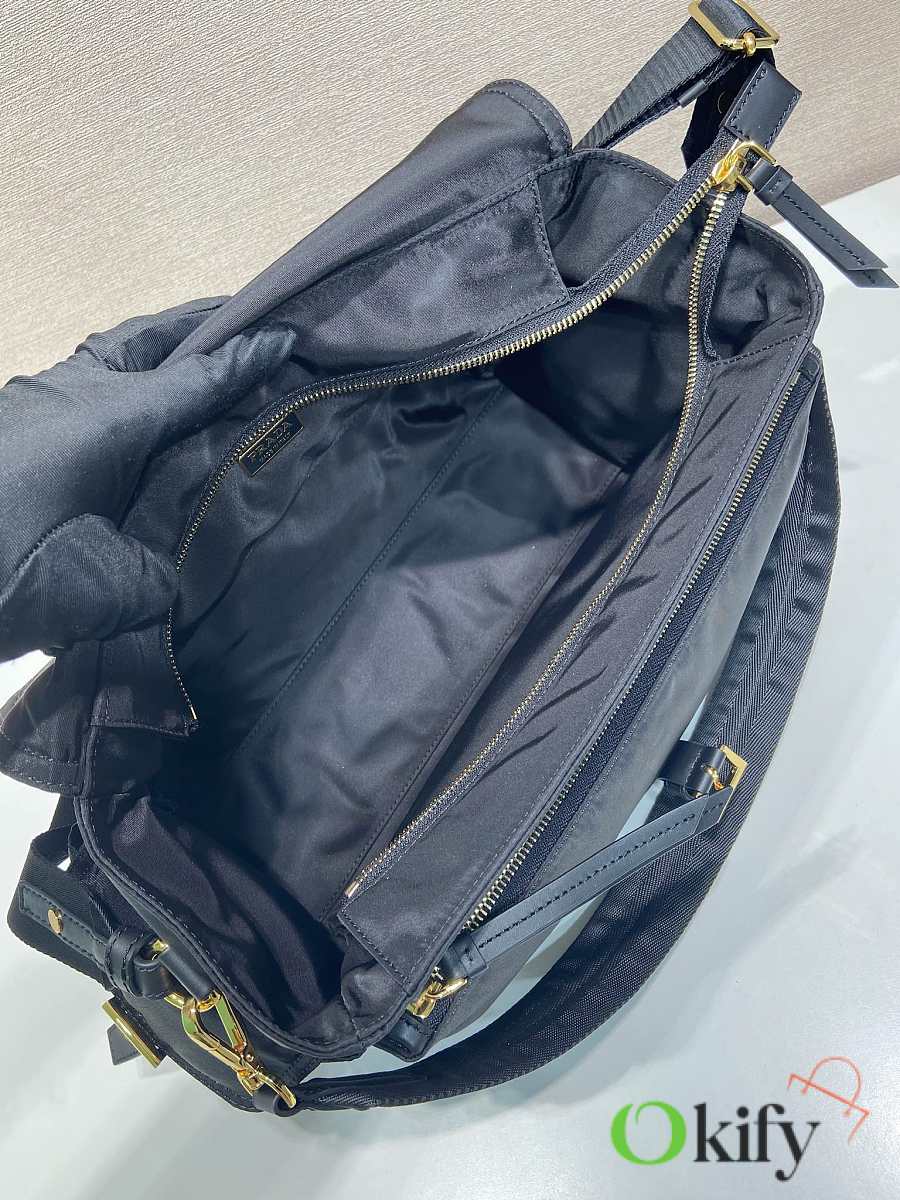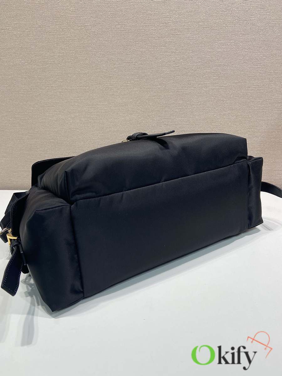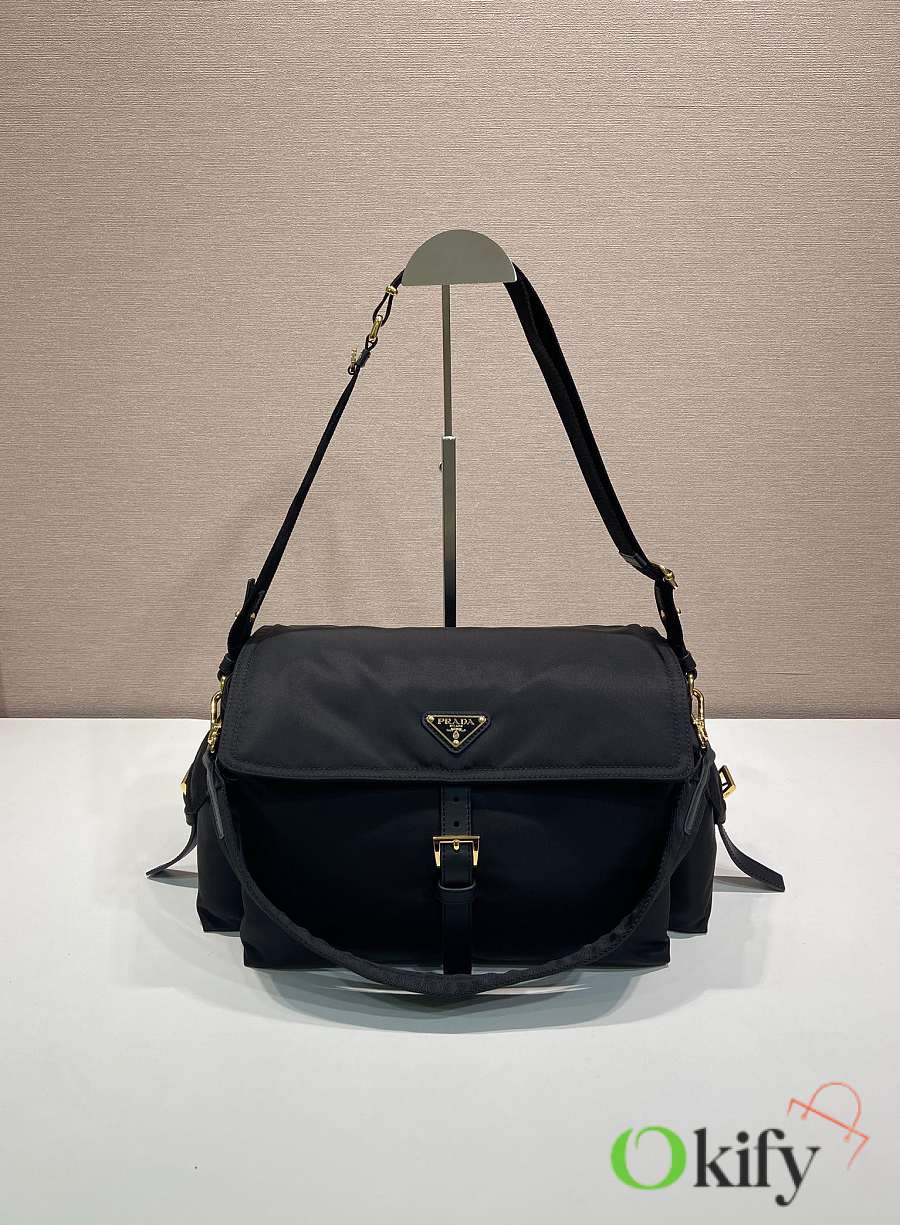 This handbag perfectly blends sophistication and functionality. Made from recycled nylon, it features a soft silhouette and multiple pockets. The lightweight and practical design combines sporty and versatile elements, adorned with an enamel triangular metal logo and leather details. It comes with two detachable shoulder straps, is spacious, and simply perfect. Another timeless and popular style, the large size is unisex.
