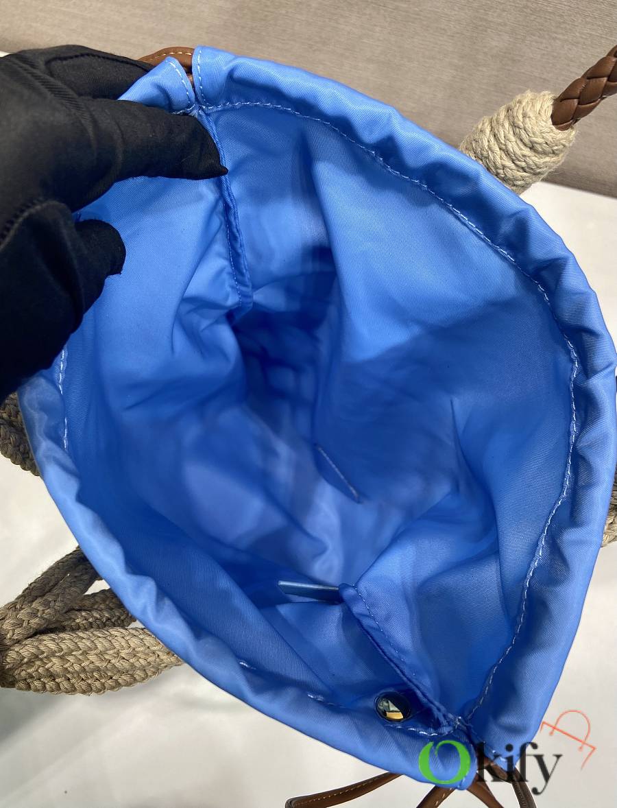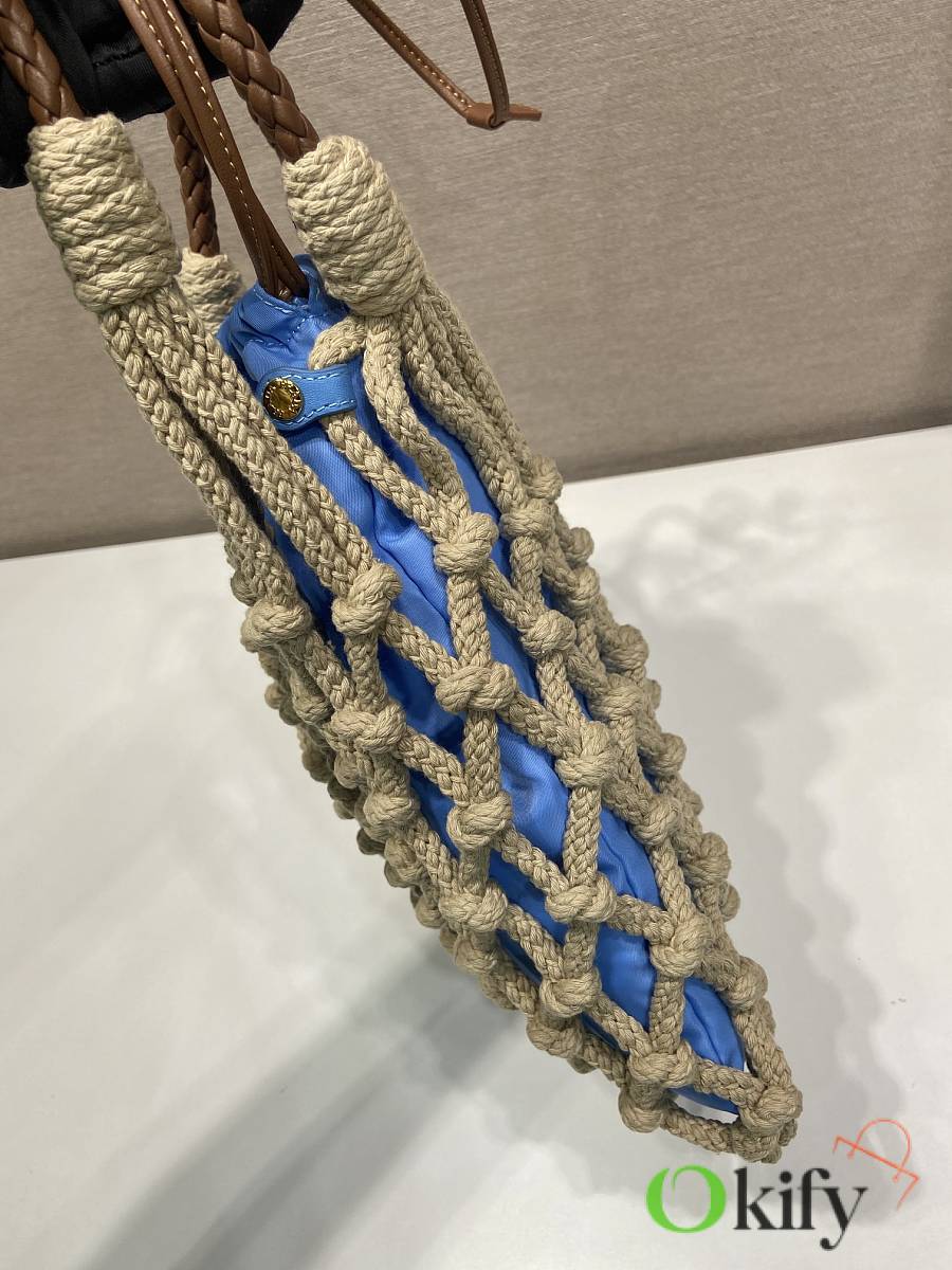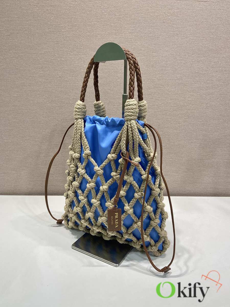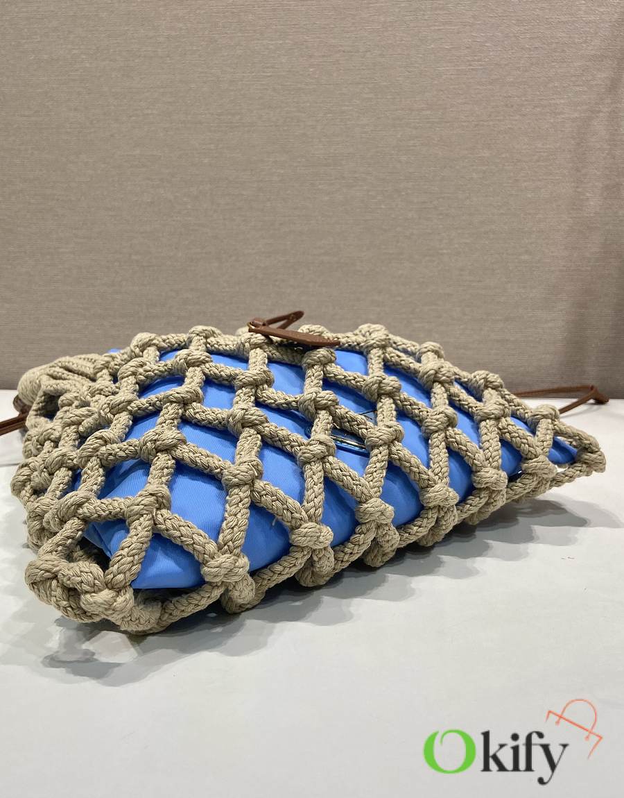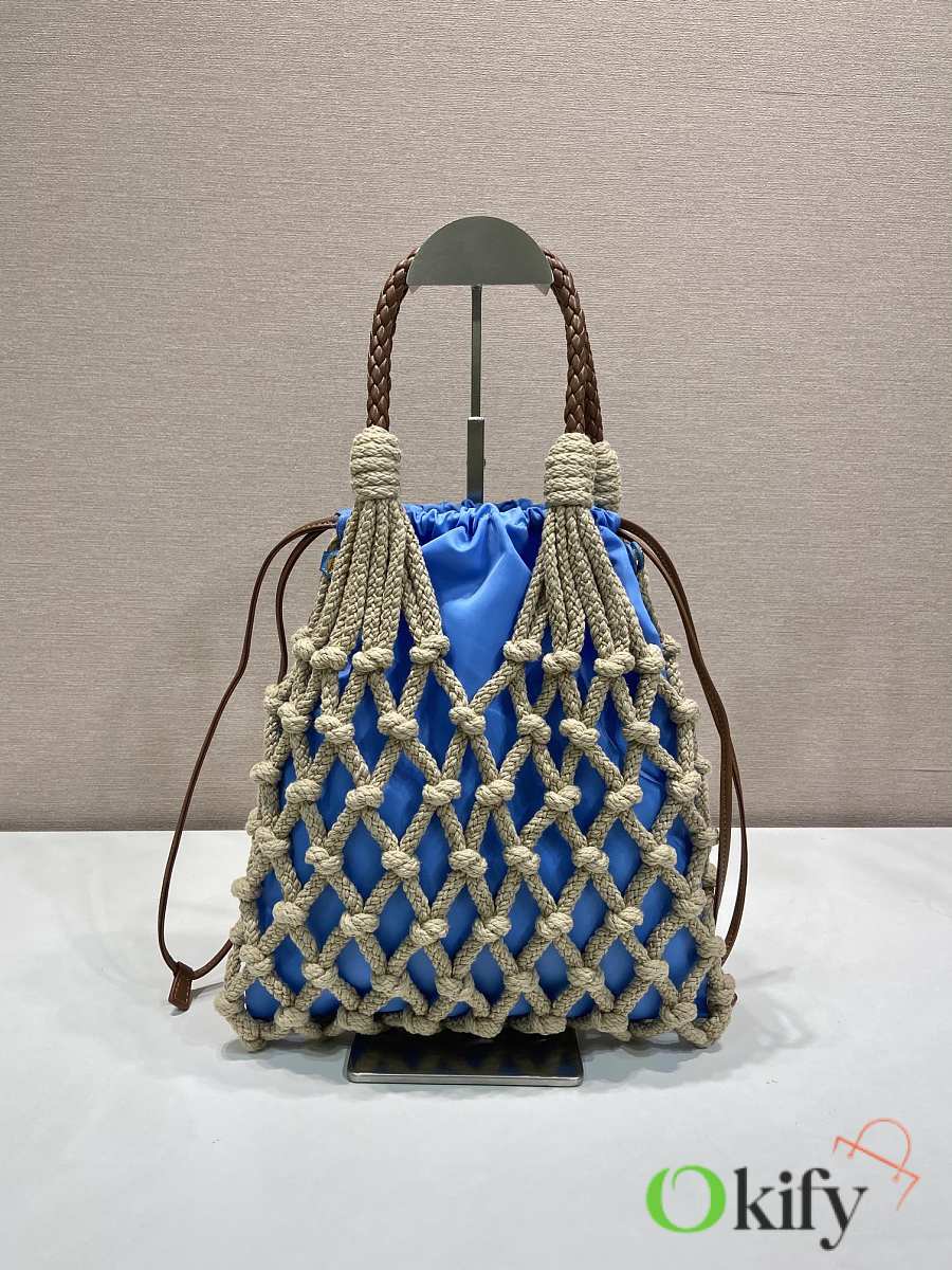 This handcrafted corded bag features a macramé design, crafted from pure hand-woven nylon fabric, embodying a fresh elegance and a genuine sense of freedom. It boasts a woven leather handle, a detachable leather pendant and metal hardware, a detachable drawstring, and a spacious, stylish two-in-one design. Grab yours now!
