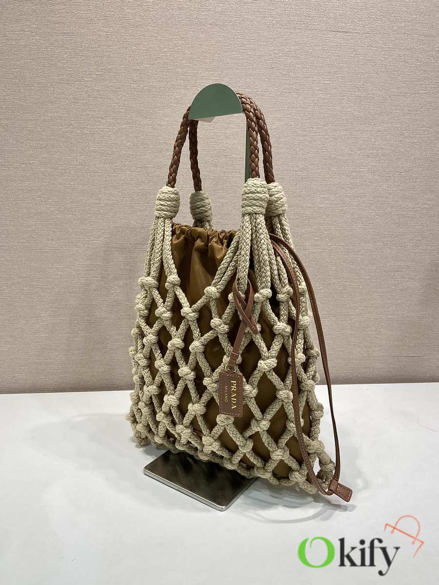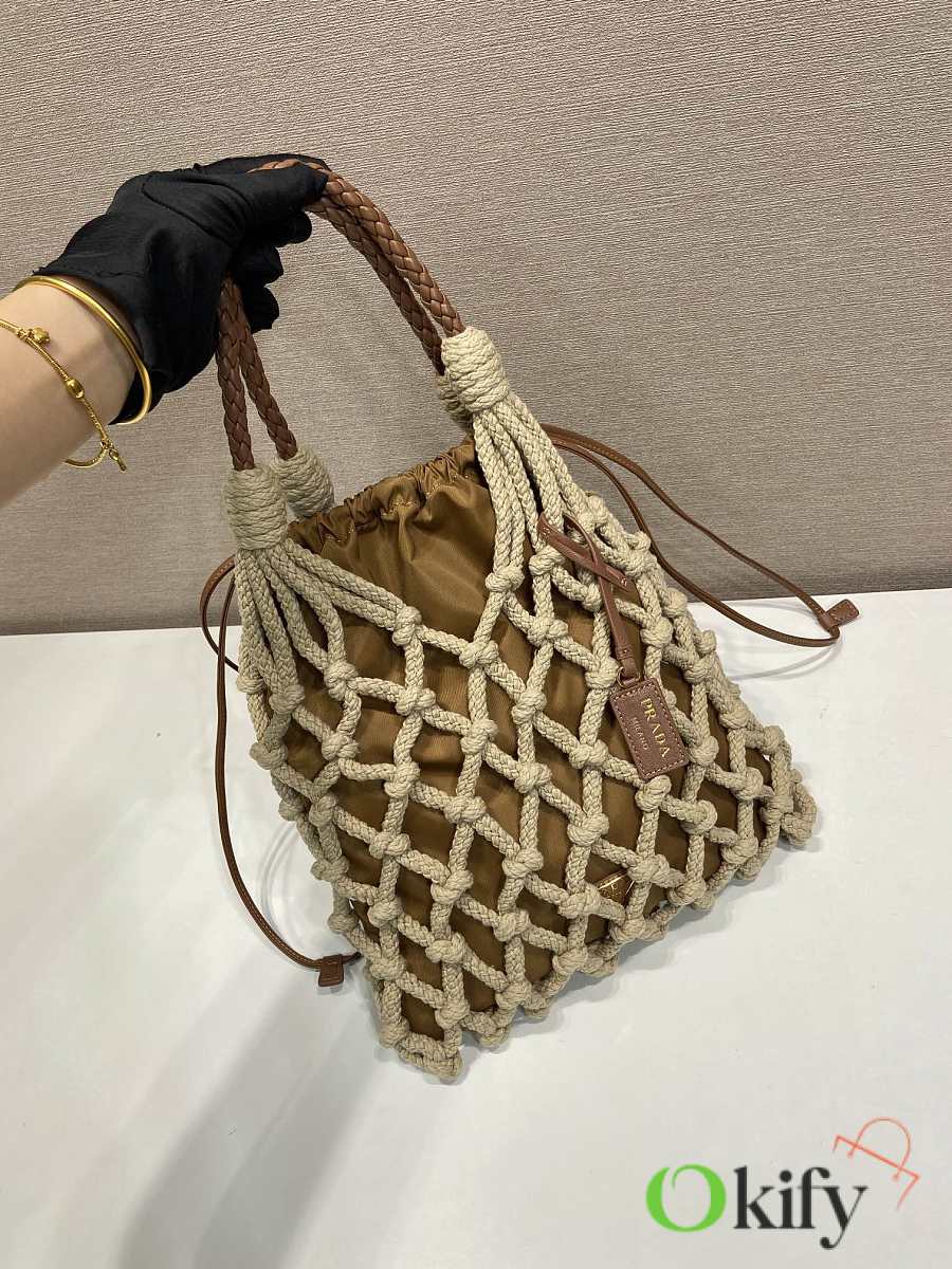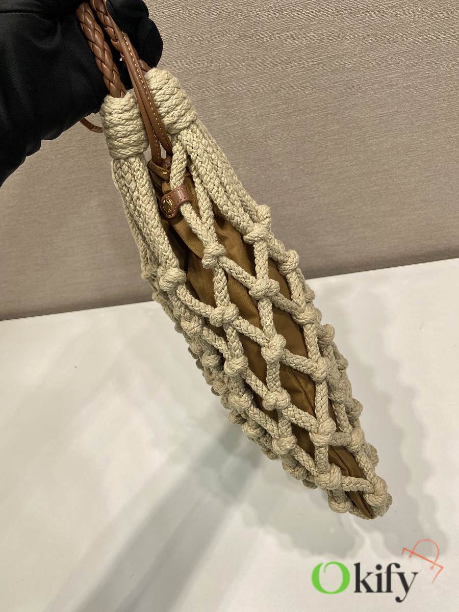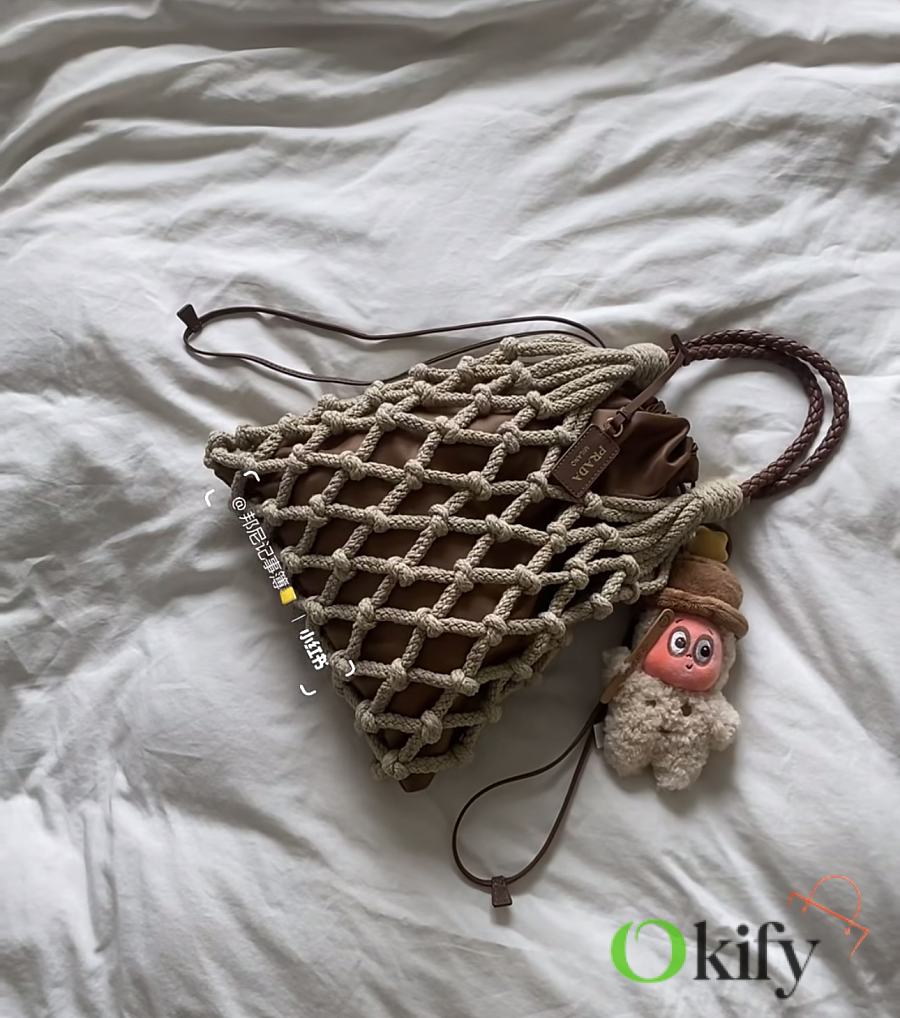 This handcrafted corded bag features a macramé design, crafted from pure hand-woven nylon fabric, embodying a fresh elegance and a genuine sense of freedom. It boasts a woven leather handle, a detachable leather pendant and metal hardware, a detachable drawstring, and a spacious, stylish two-in-one design. Grab yours now!