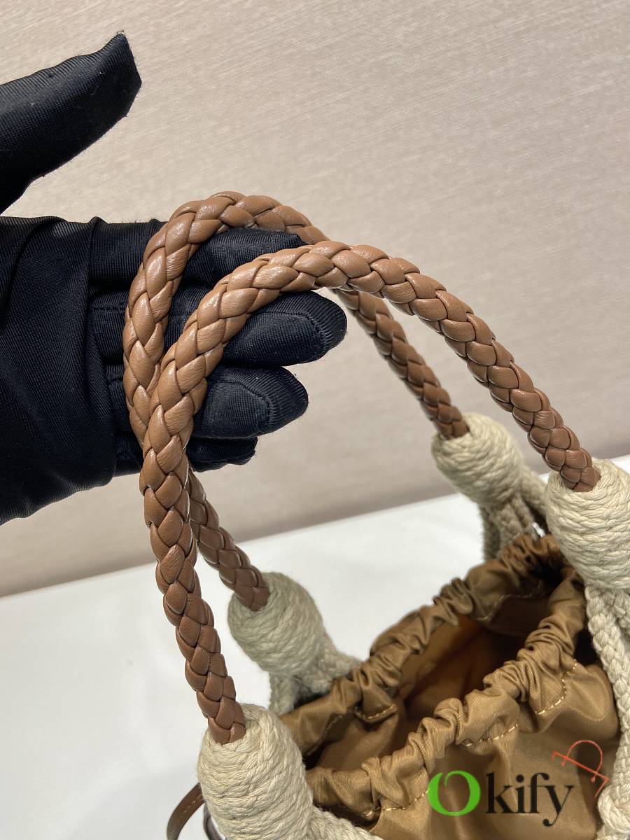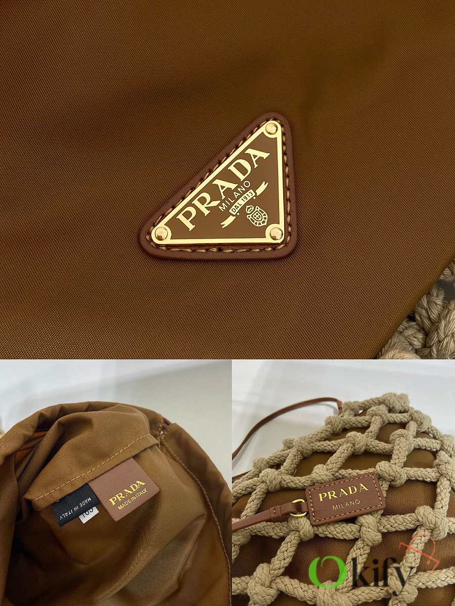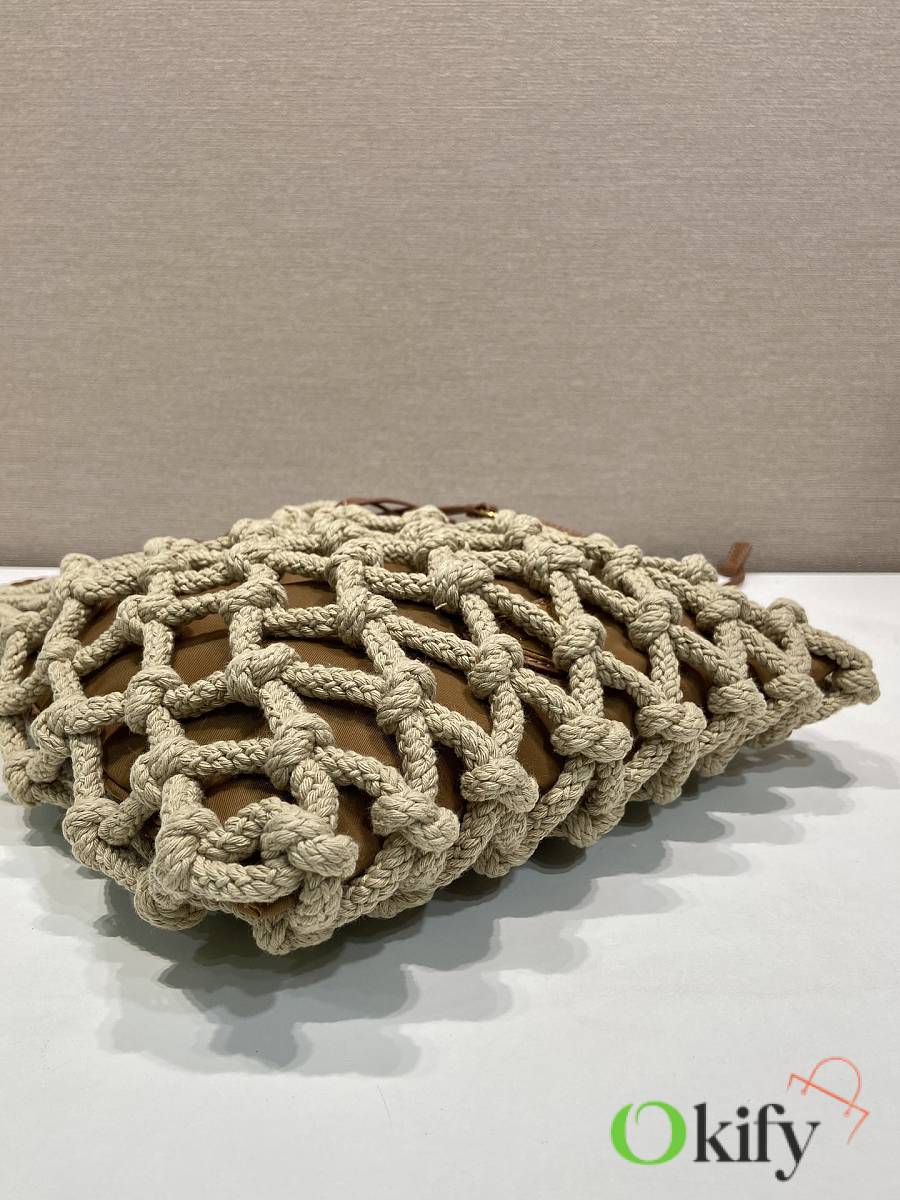 This handcrafted corded bag features a macramé design, crafted from pure hand-woven nylon fabric, embodying a fresh elegance and a genuine sense of freedom. It boasts a woven leather handle, a detachable leather pendant and metal hardware, a detachable drawstring, and a spacious, stylish two-in-one design. Grab yours now!
