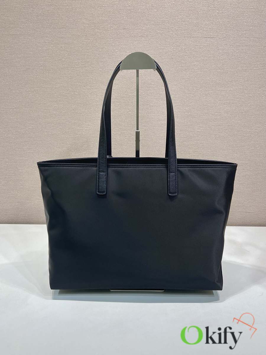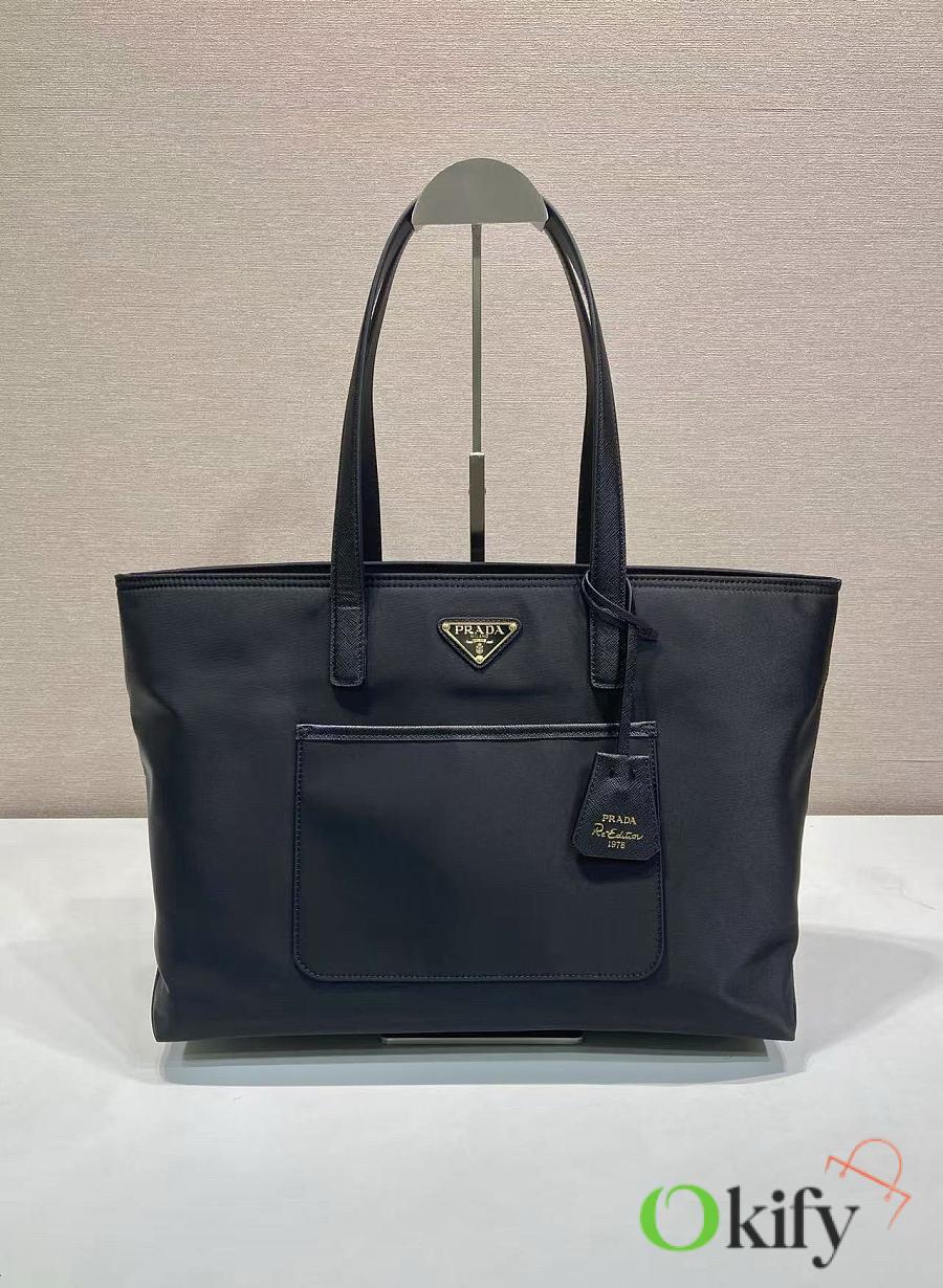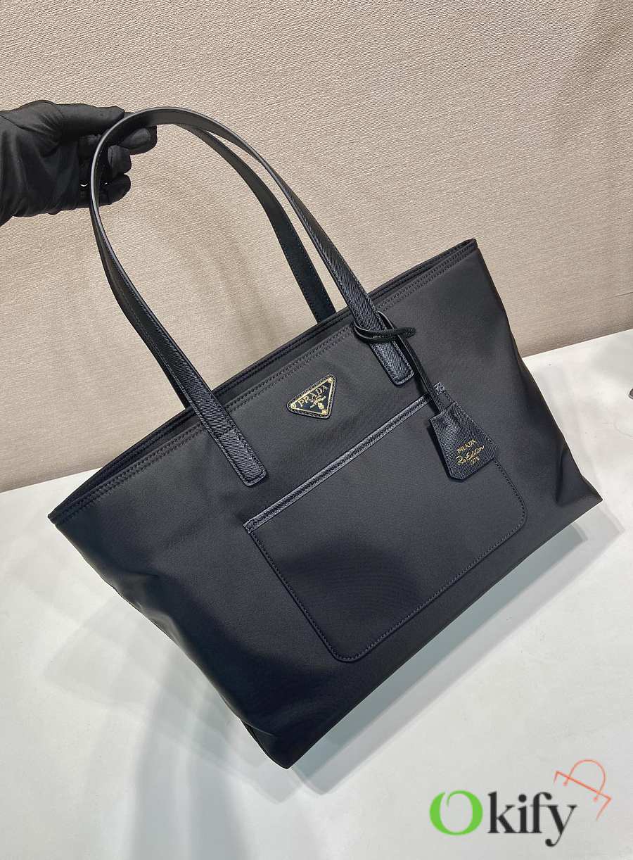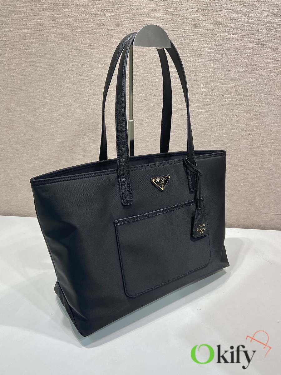 This timeless tote bag is a reinterpretation of a classic design, showcasing a unique style with its refined yet practical silhouette. Featuring clean lines, crafted from recycled nylon, it boasts imported Saffiano leather handles, metal hardware, and two interior pockets. With its spacious interior, grab yours now! Another timeless and ever-popular style!