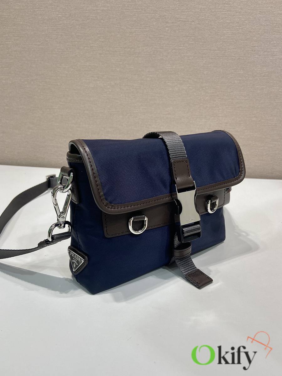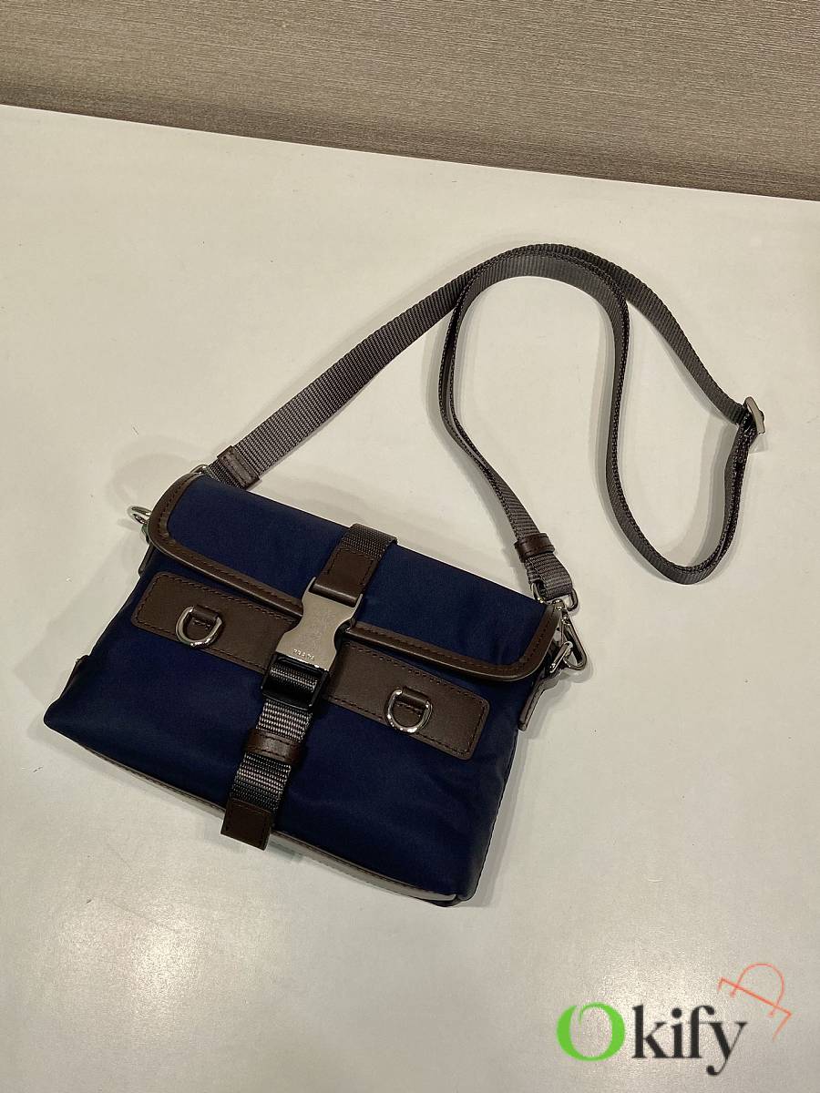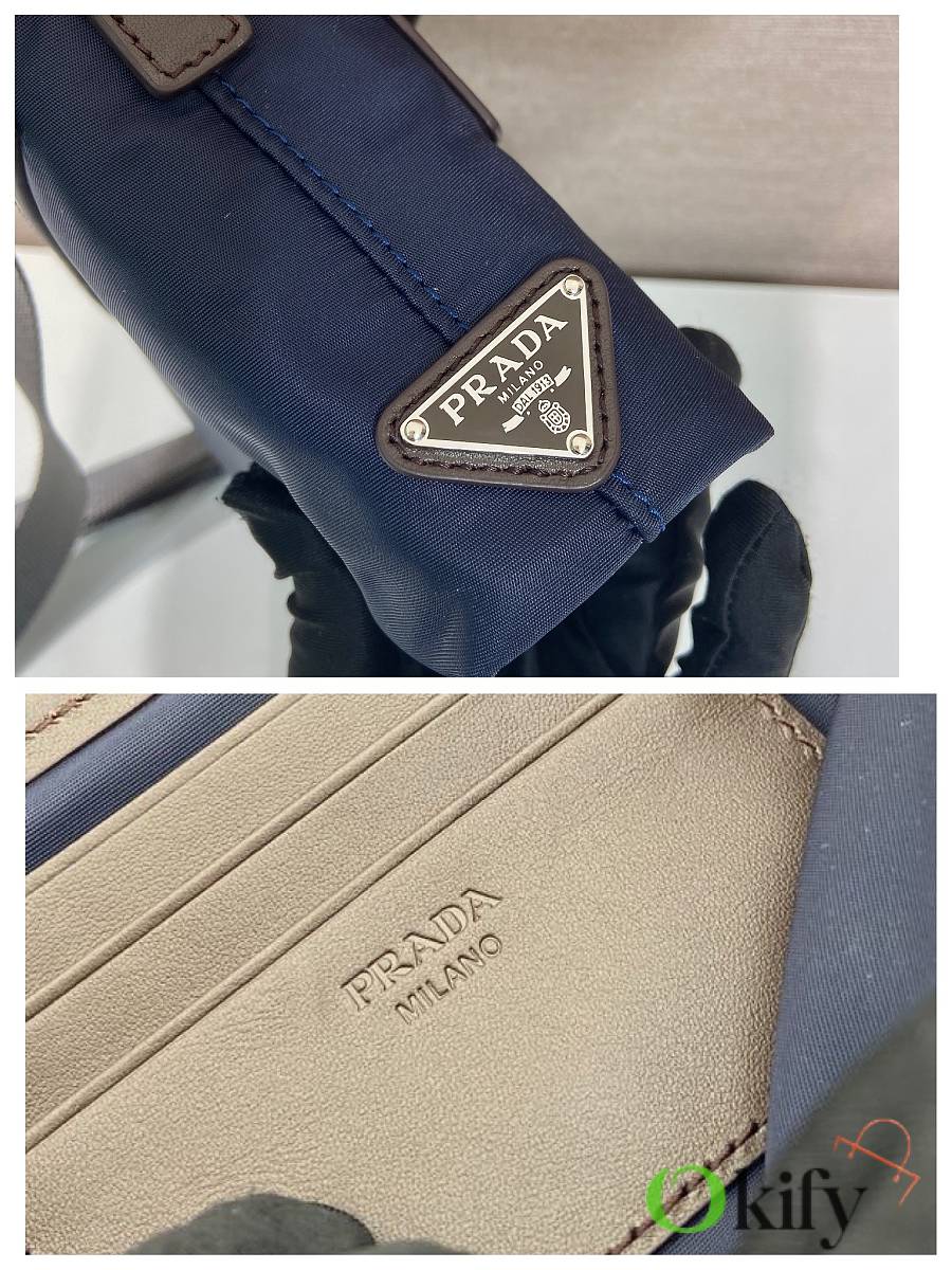 This sophisticated and modern smartphone case is crafted from Re-Nylon. It features a versatile design with leather details and a practical detachable, adjustable shoulder strap. An enamel metal triangle logo adds a touch of iconic style. It also includes two card slots. The overall look is stylish and chic; grab one now—it's another timeless and popular item