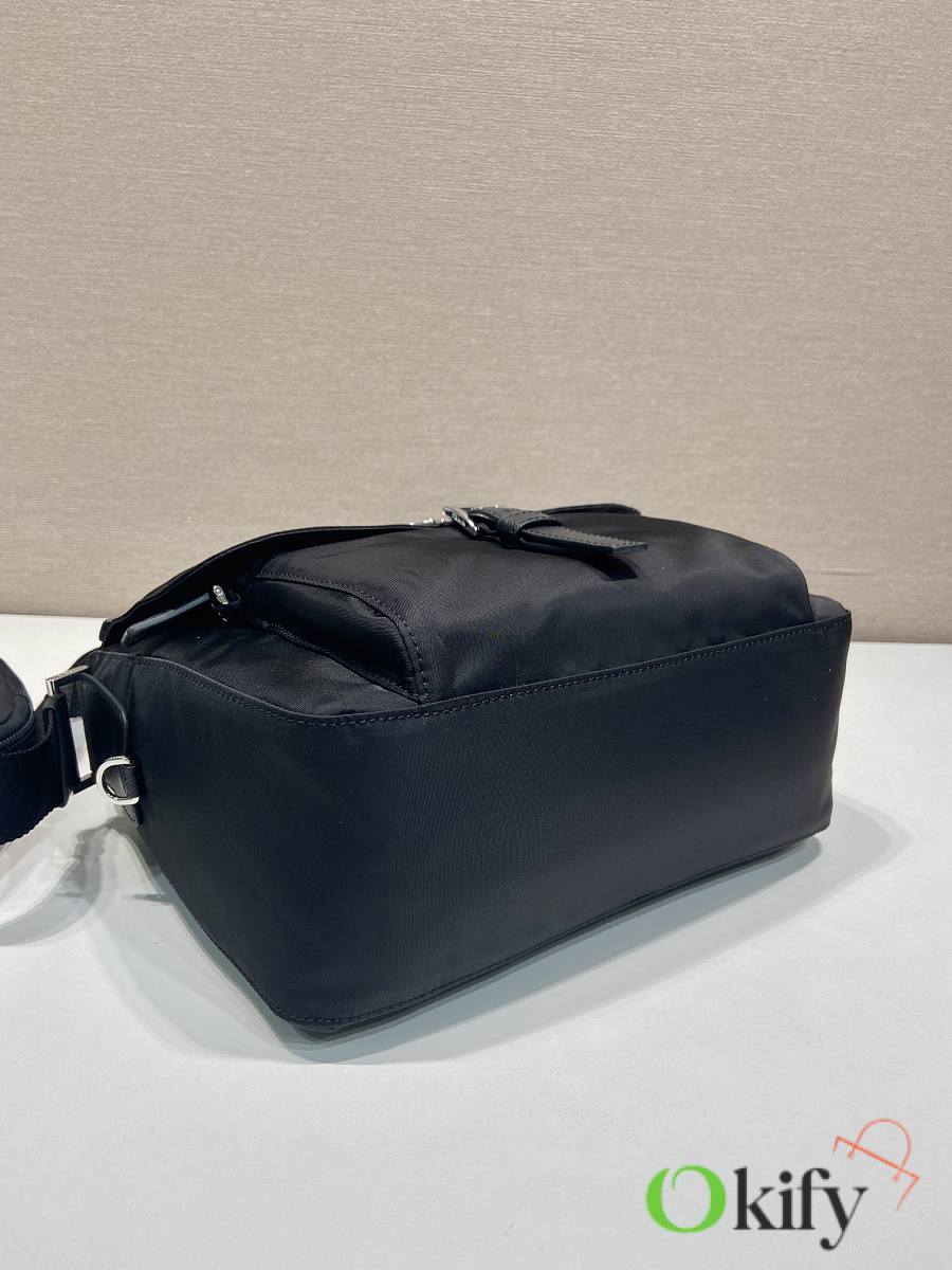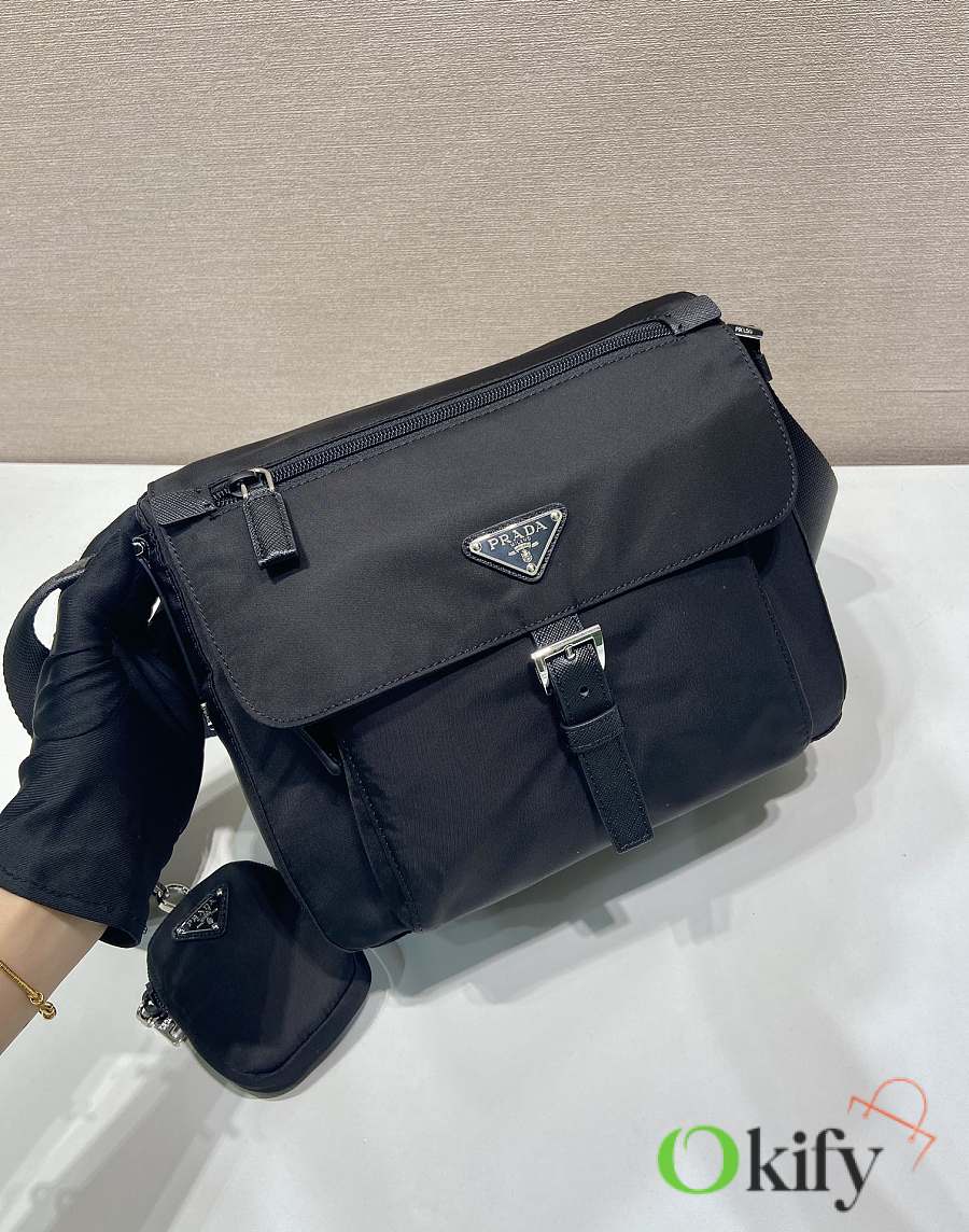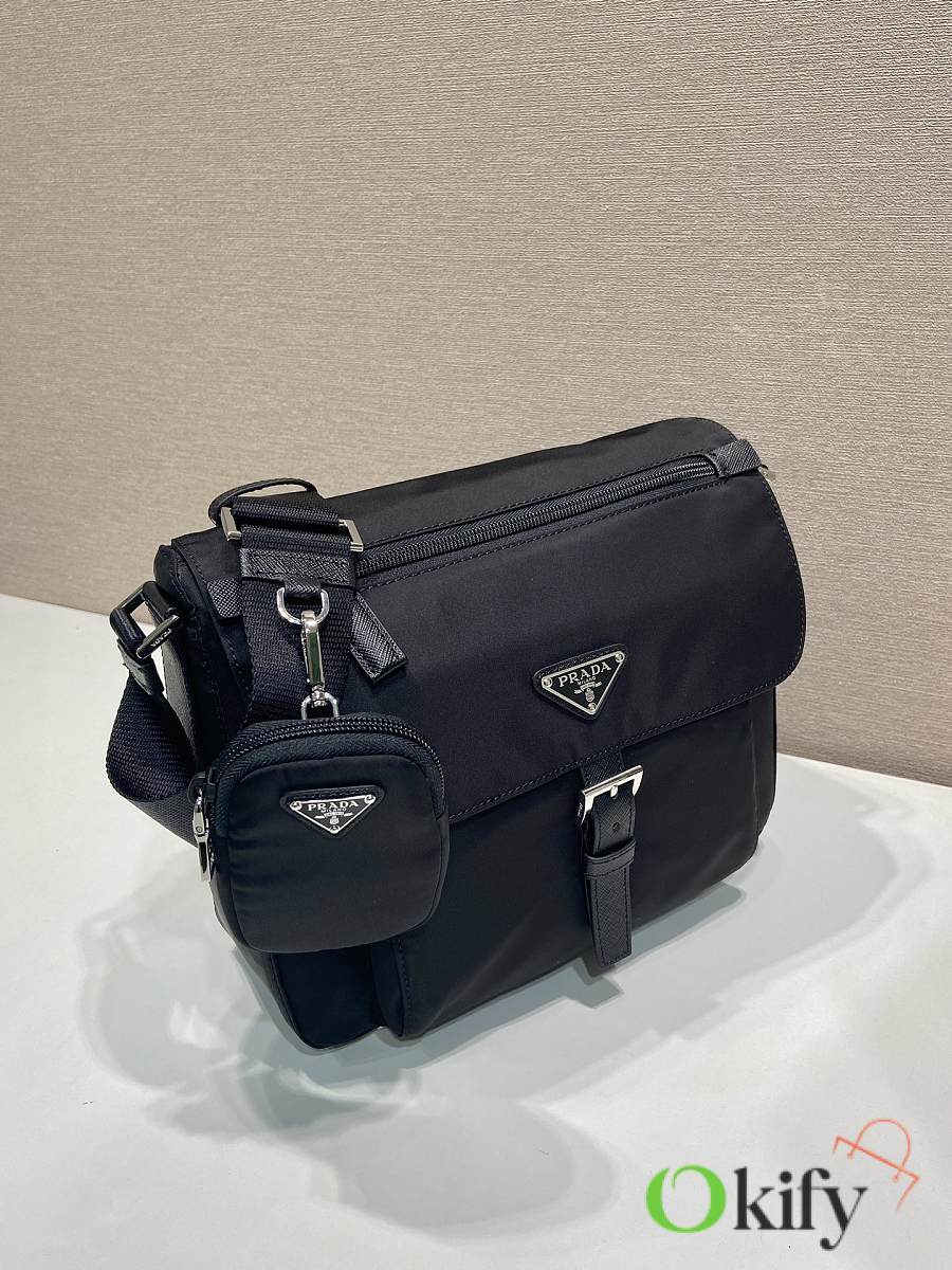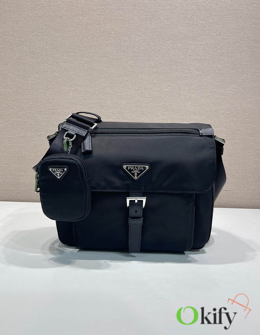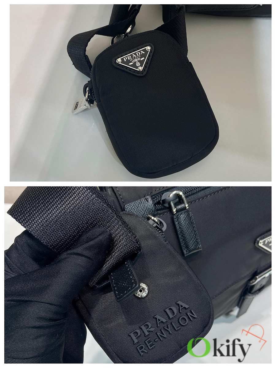 This bag is made of imported nylon and Saffiano leather trim, features an adjustable fabric shoulder strap, stainless steel hardware, and an upgraded design with square buckle hardware on both sides of the shoulder strap. It comes with a detachable eco-label, a triangular enamel logo plaque, zipper and buckle closures, two exterior pockets (one with a flap zipper), two interior pockets, and a 165 manufacturing code. Lightweight and practical