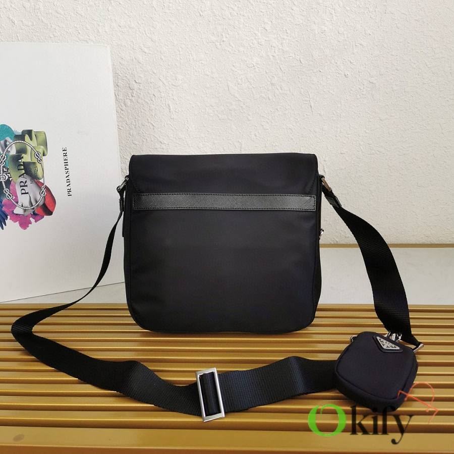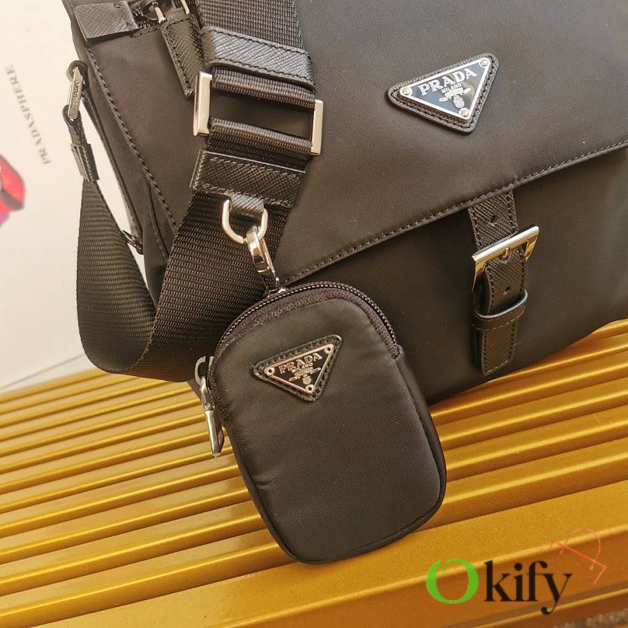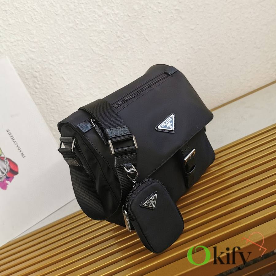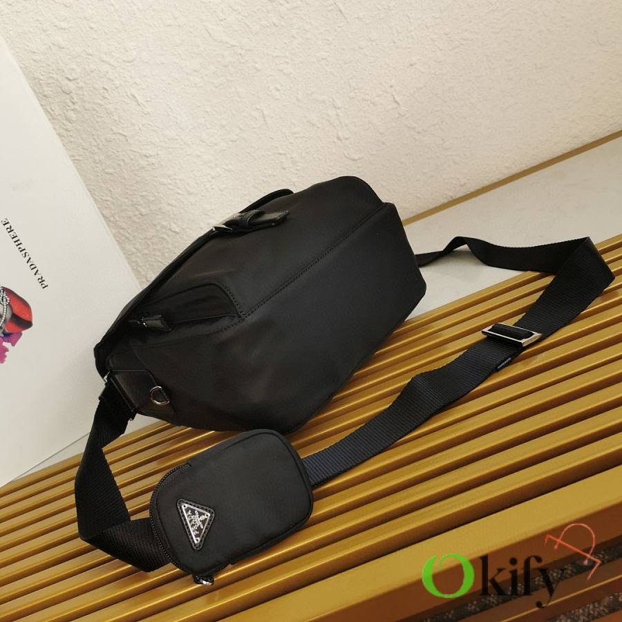This model features imported nylon material and Saffiano leather trim, an adjustable fabric shoulder strap, stainless steel hardware, and an upgraded design with a detachable pouch on the shoulder strap, a triangular enamel logo plaque, zipper and buckle closures, two exterior pockets (one with a flap zipper), two interior pockets, and a 165 manufacturing code. Lightweight and practical!