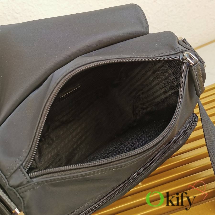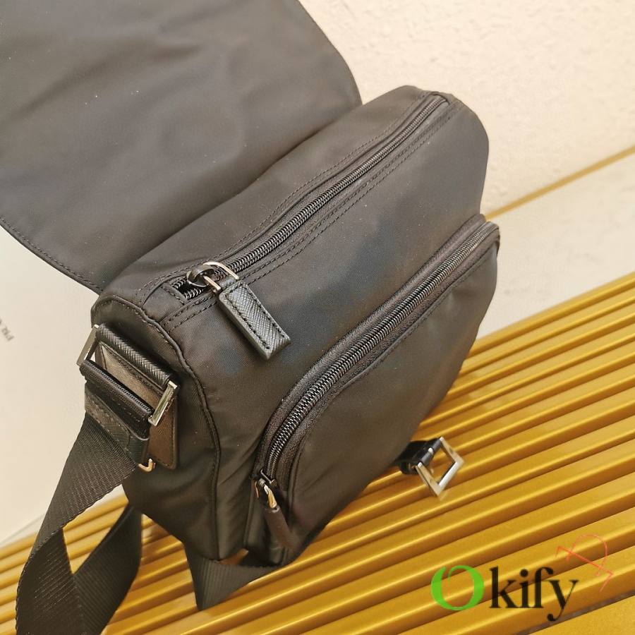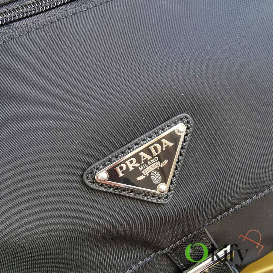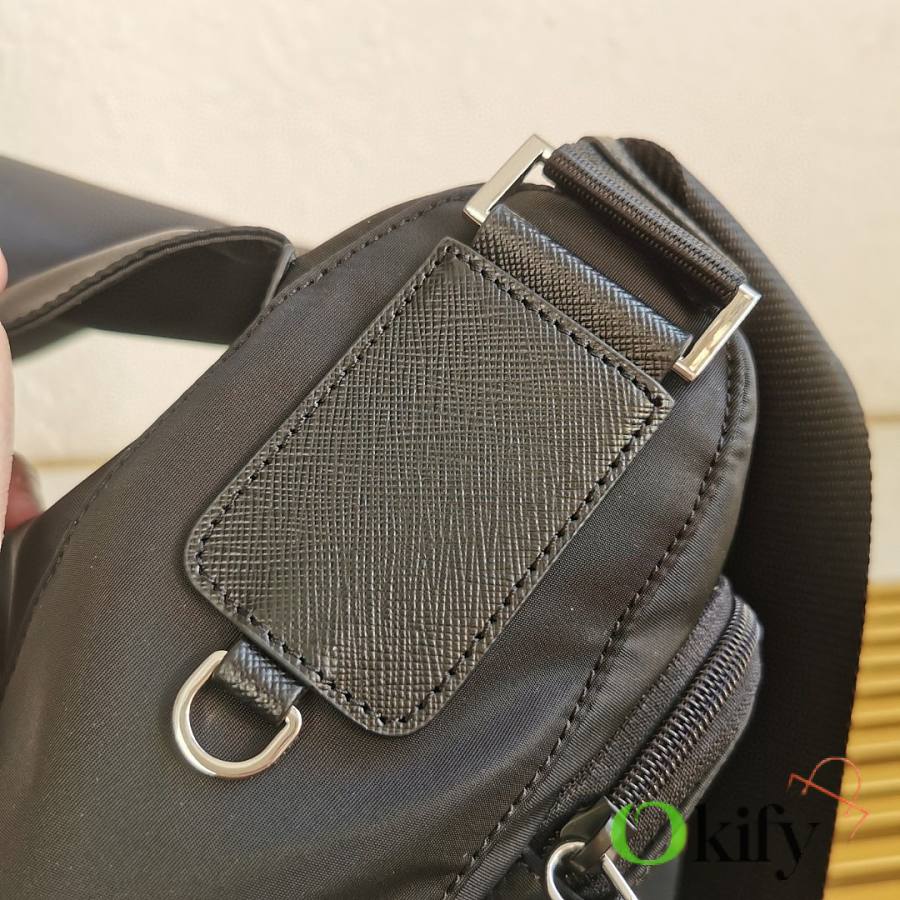 This model features imported nylon material and Saffiano leather trim, an adjustable fabric shoulder strap, stainless steel hardware, and an upgraded design with a detachable pouch on the shoulder strap, a triangular enamel logo plaque, zipper and buckle closures, two exterior pockets (one with a flap zipper), two interior pockets, and a 165 manufacturing code. Lightweight and practical!