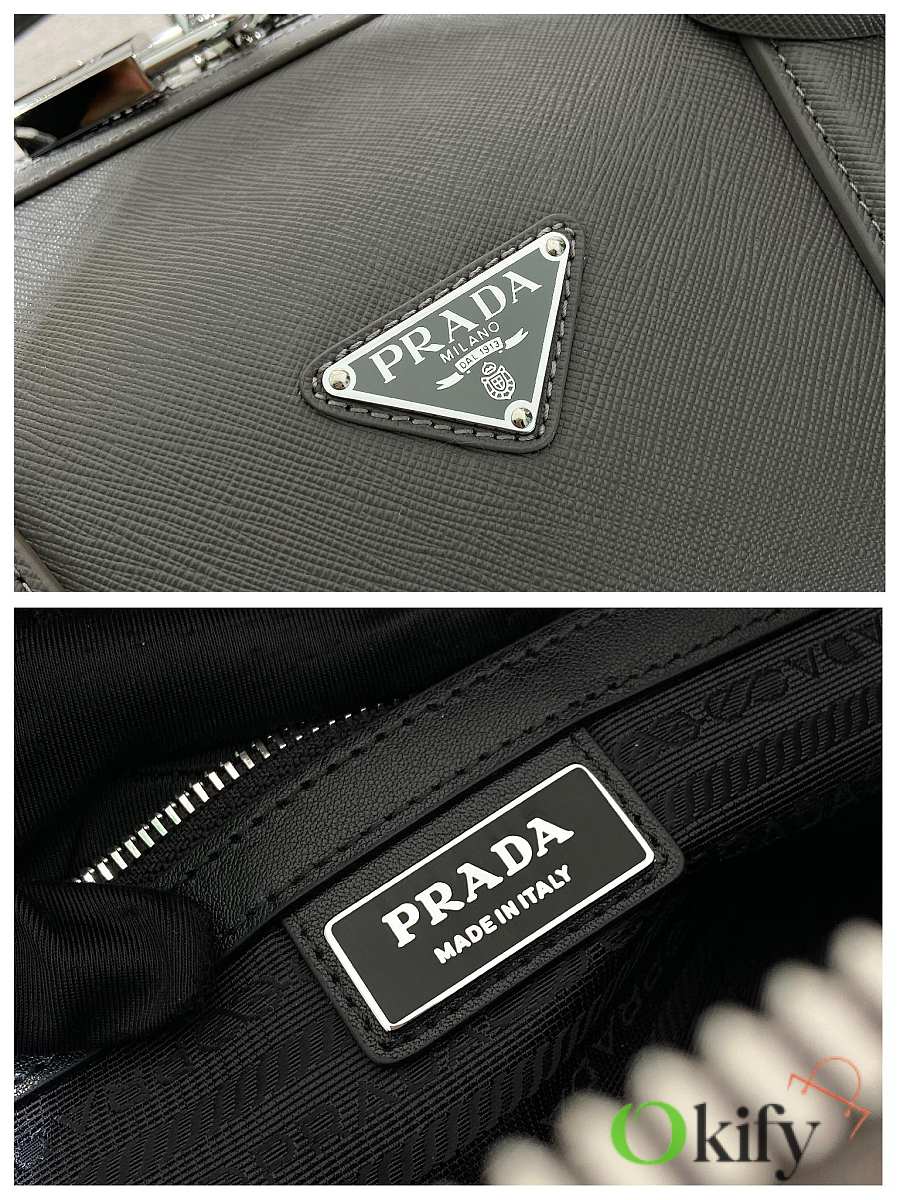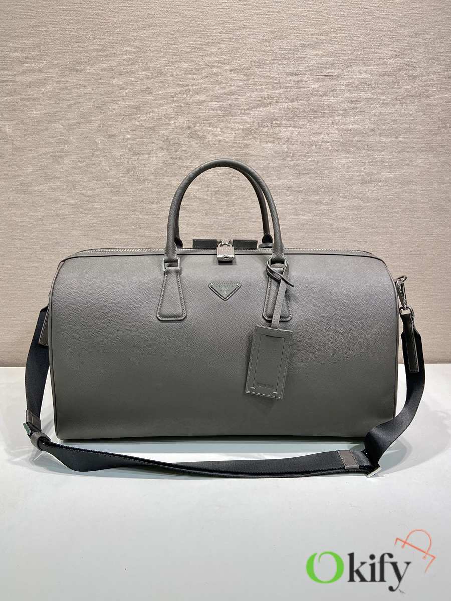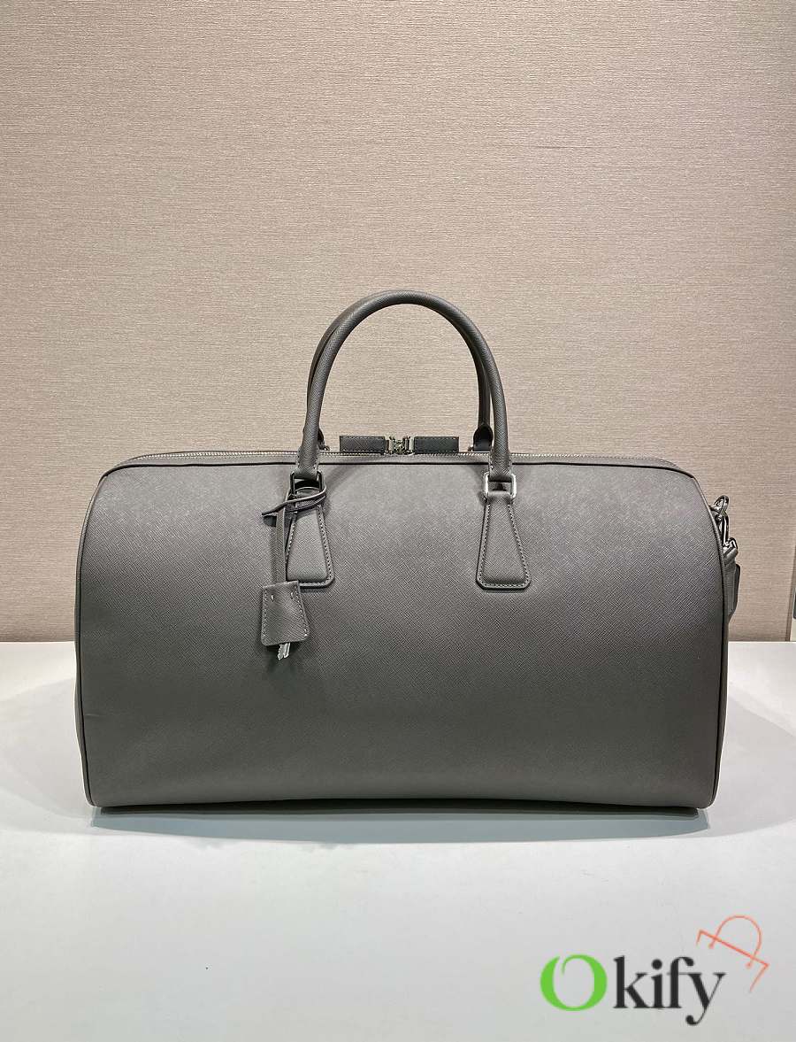 This elegant travel bag is crafted from Saffiano leather and features a wraparound zipper and nylon shoulder strap, showing a meticulous design philosophy. It's further adorned with a leather nameplate and a metal clasp with an engraved logo, exuding dazzling charm. Simple yet sophisticated. Get yours now!