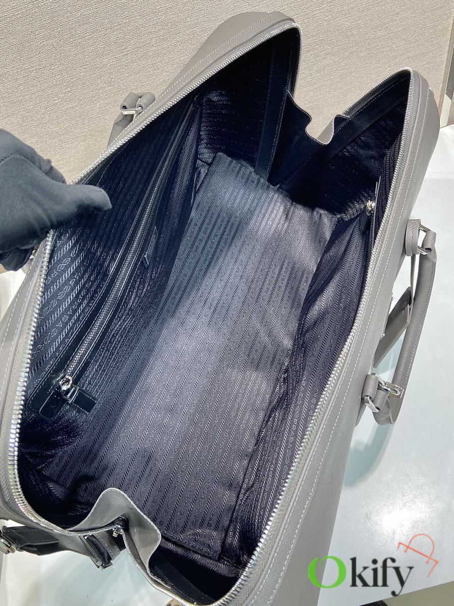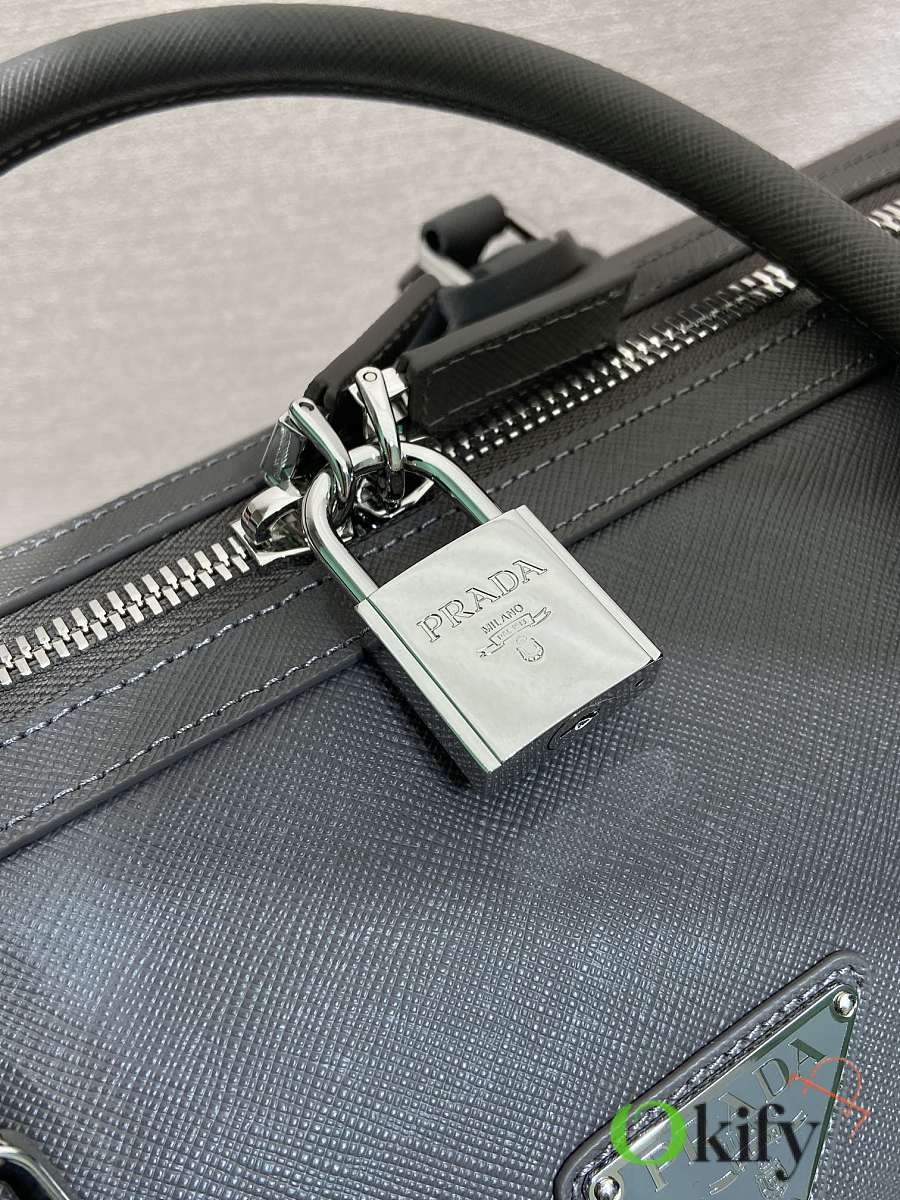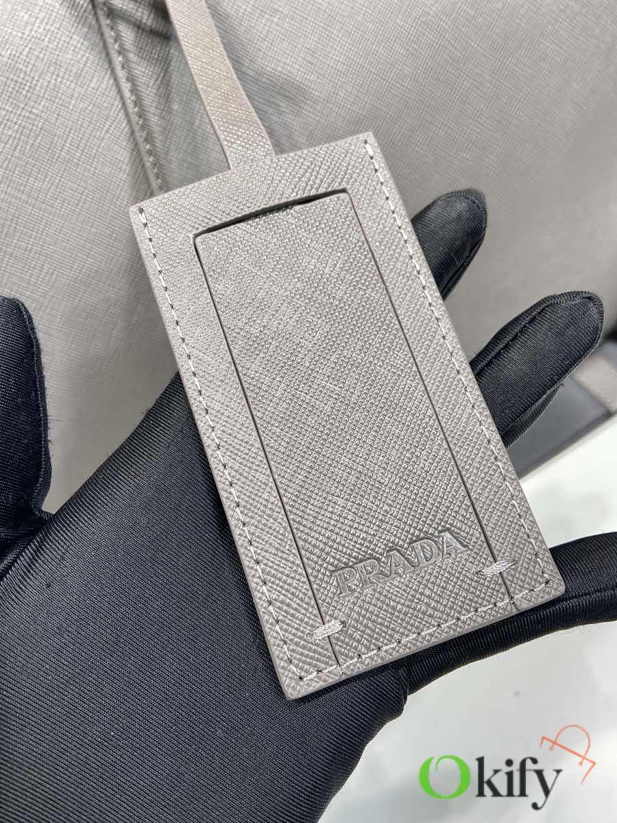 This elegant travel bag is crafted from Saffiano leather and features a wraparound zipper and nylon shoulder strap, showing a meticulous design philosophy. It's further adorned with a leather nameplate and a metal clasp with an engraved logo, exuding dazzling charm. Simple yet sophisticated. Get yours now!