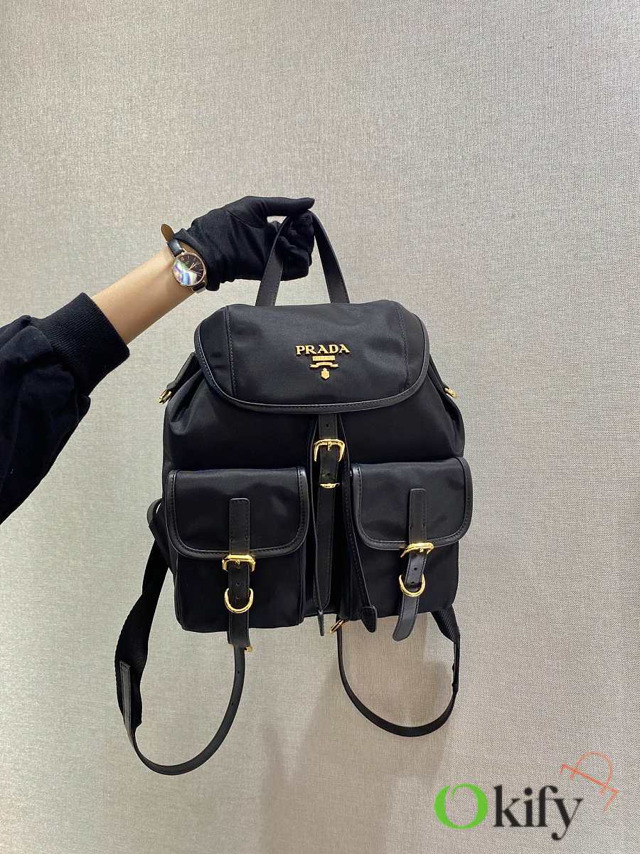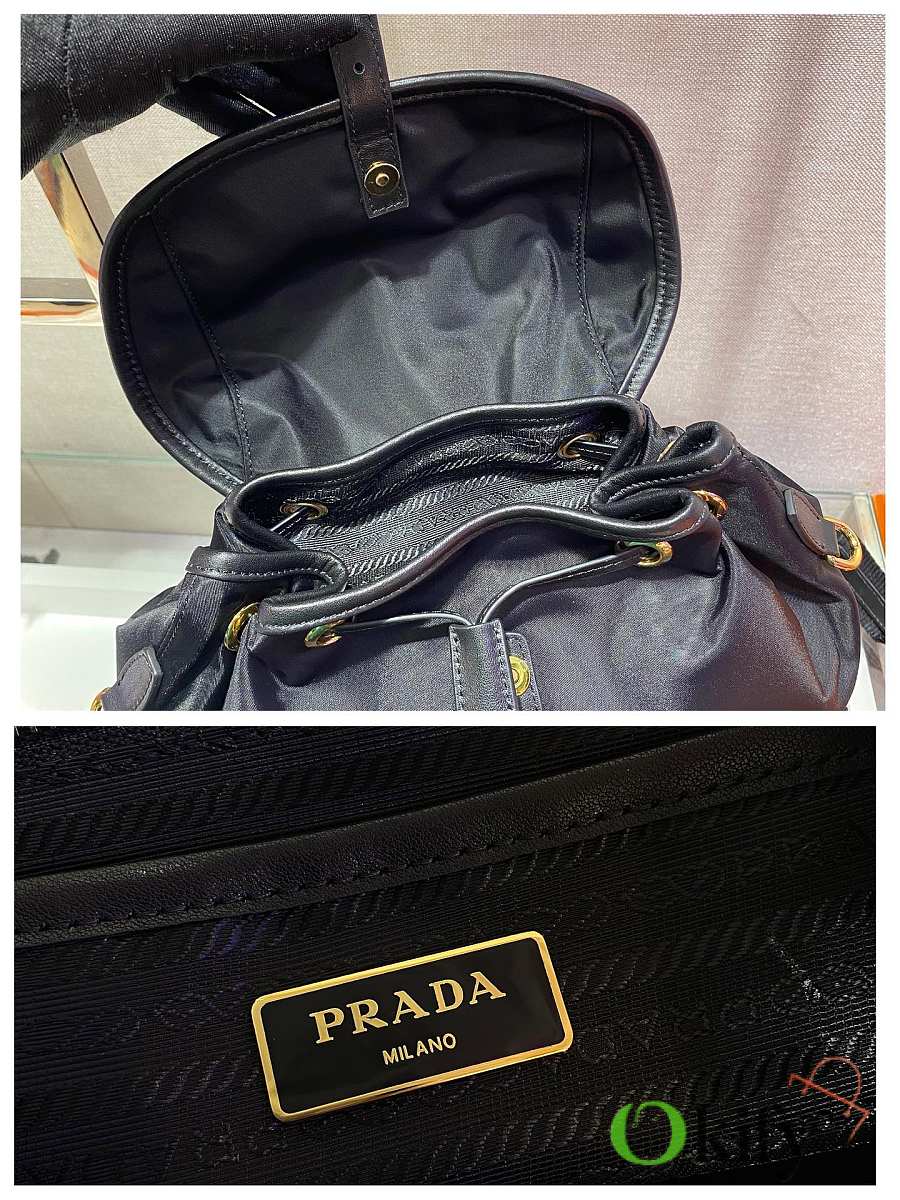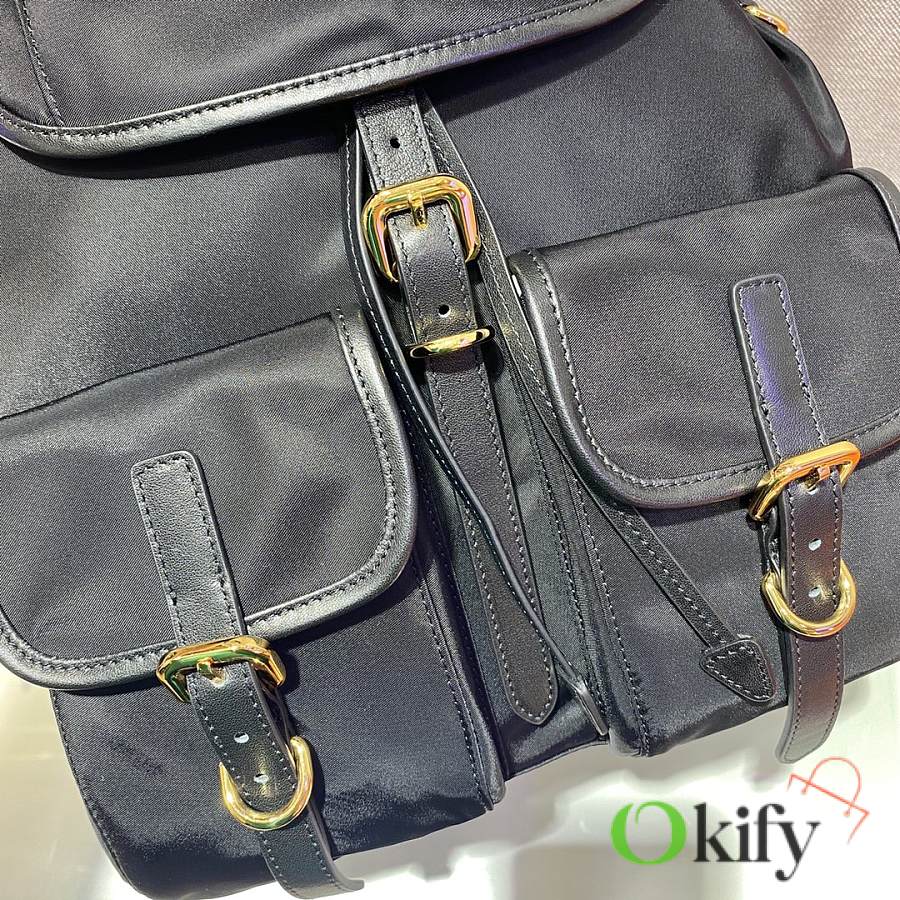 This nylon backpack features exquisite Saffiano leather trim, blending multiple materials and adorned with a unique logo. The flap design and two front pockets exude a stylish and elegant charm. Lightweight and practical, it looks incredibly stylish and is easy to match with any outfit