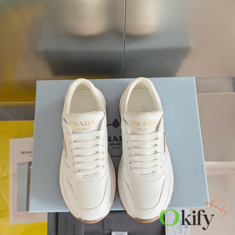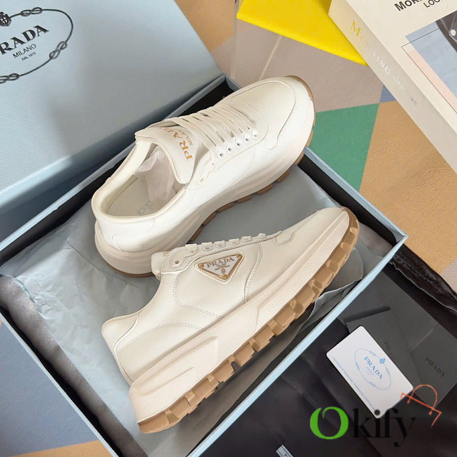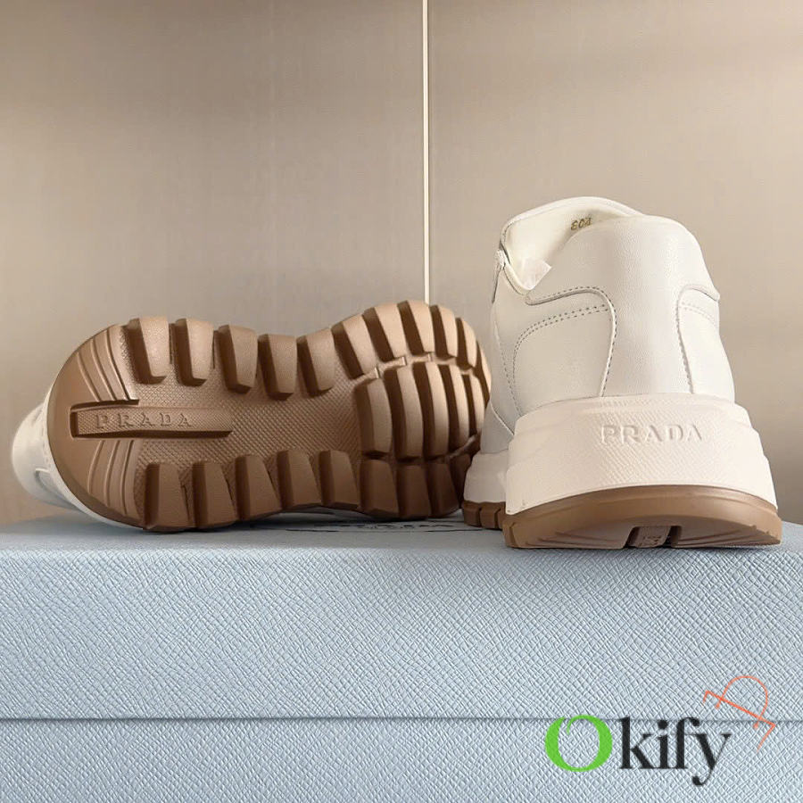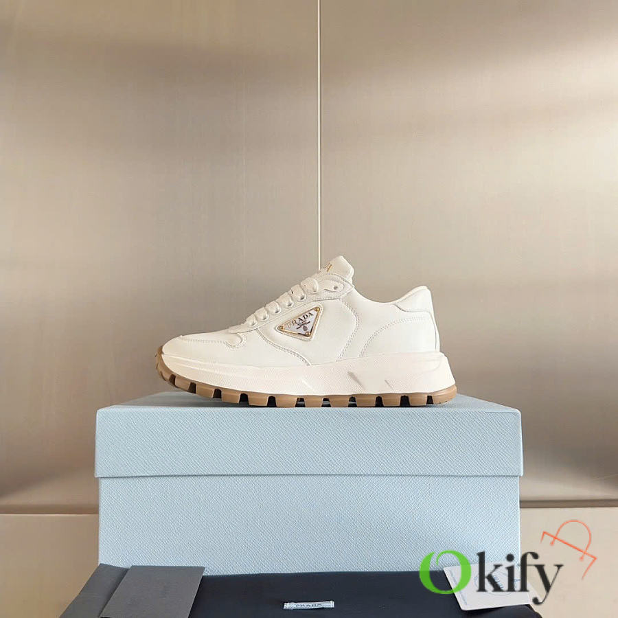 This sneaker combines elegant and innovative design with classic craftsmanship and materials. It's made from Re-lon and glossy leather, with the innovative Re-lon material sourced from recycled ocean plastics. The triangle logo adds a sporty touch and stands out on the side, while the thick rubber sole gives it a unique and stylish look.