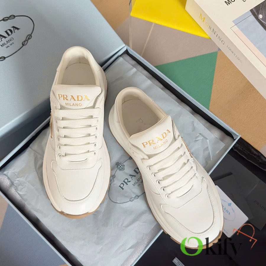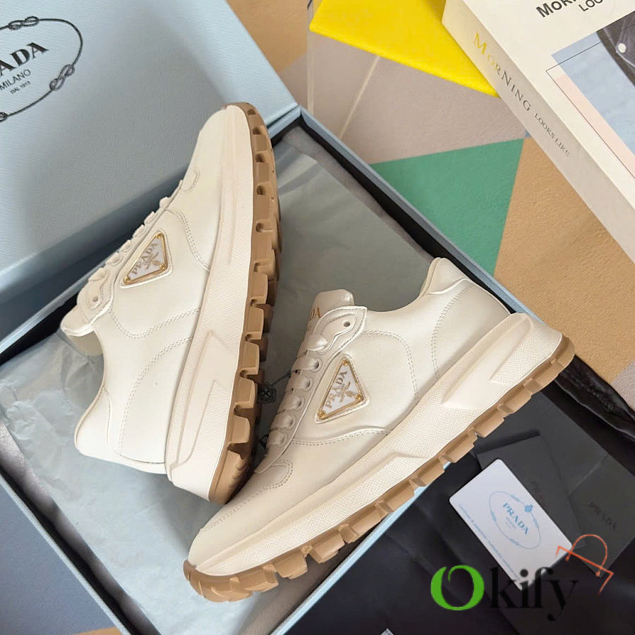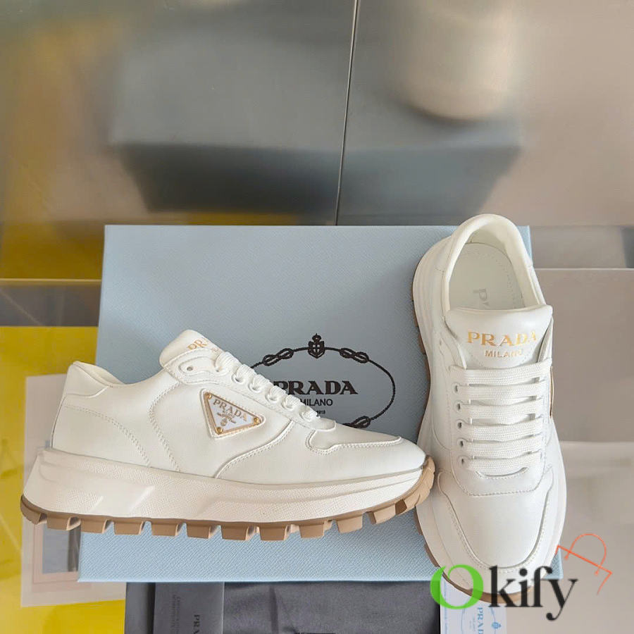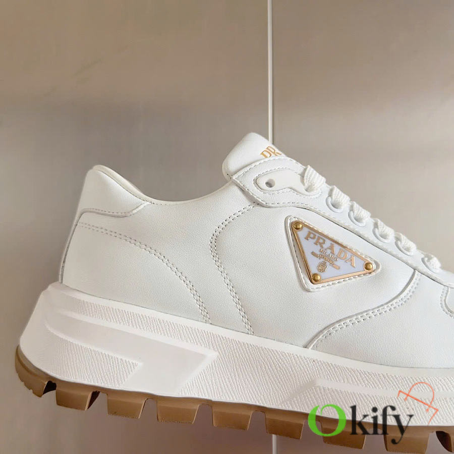 This sneaker combines elegant and innovative design with classic craftsmanship and materials. It's made from Re-lon and glossy leather, with the innovative Re-lon material sourced from recycled ocean plastics. The triangle logo adds a sporty touch and stands out on the side, while the thick rubber sole gives it a unique and stylish look.