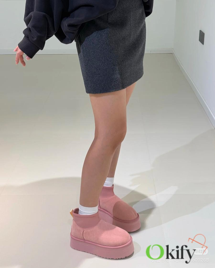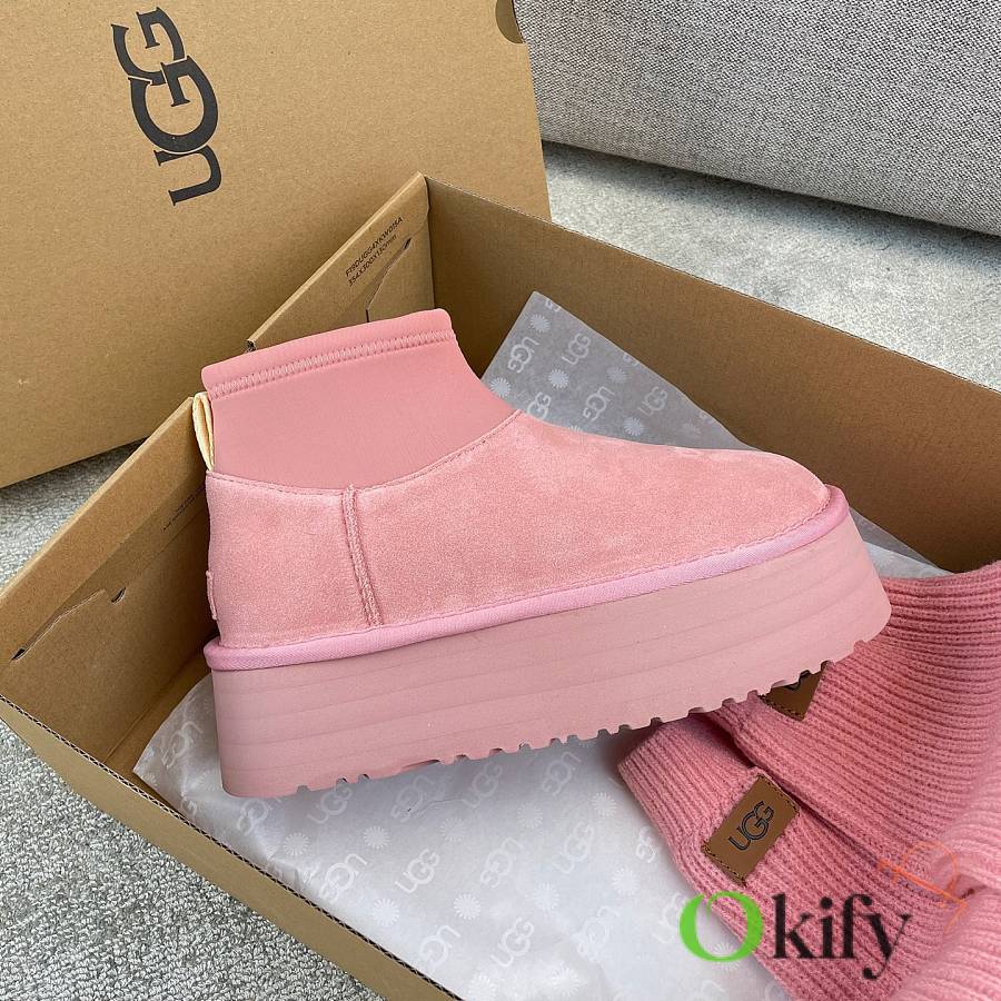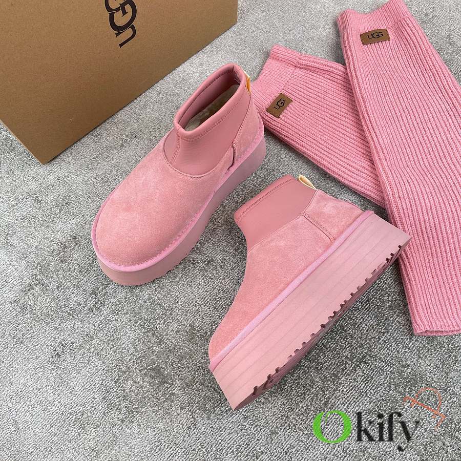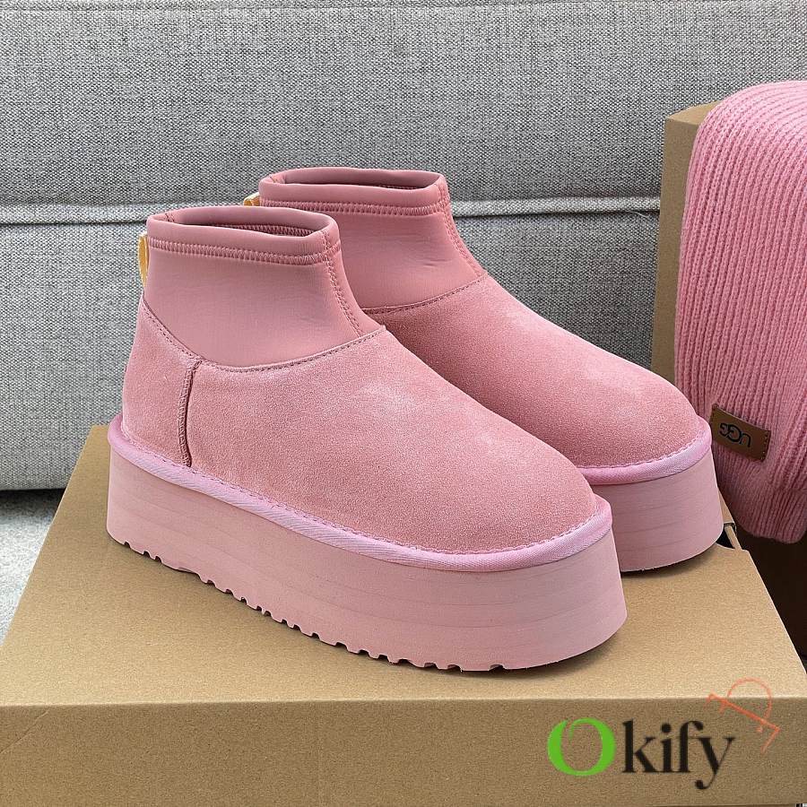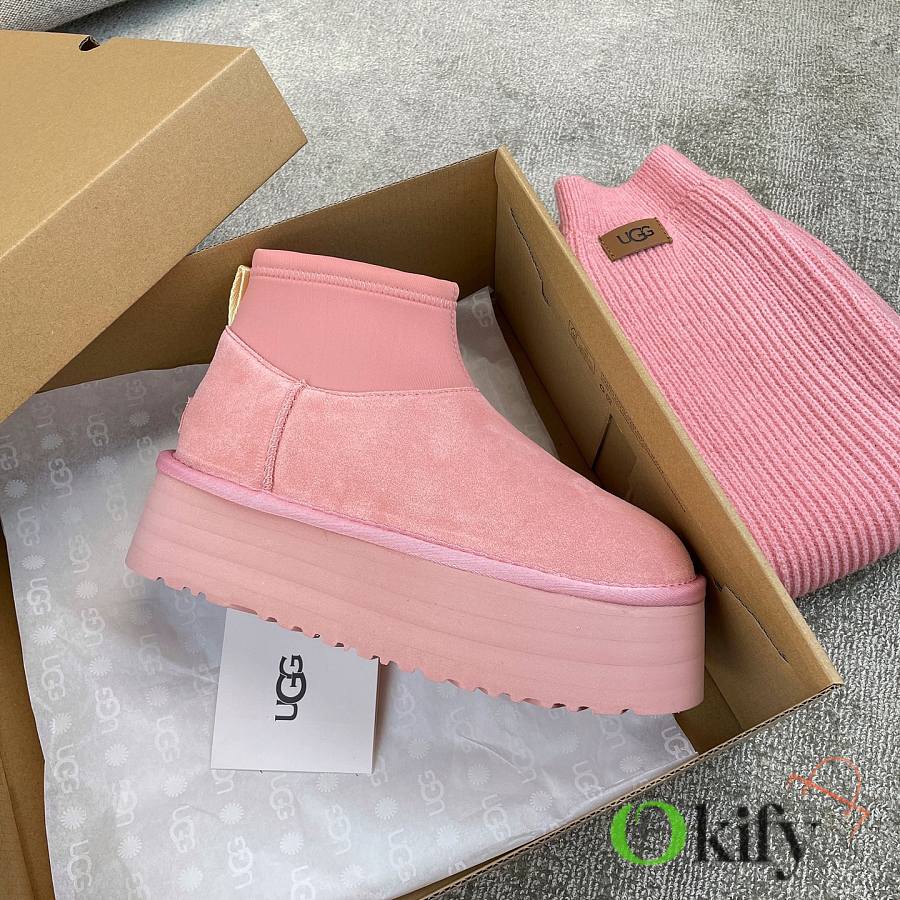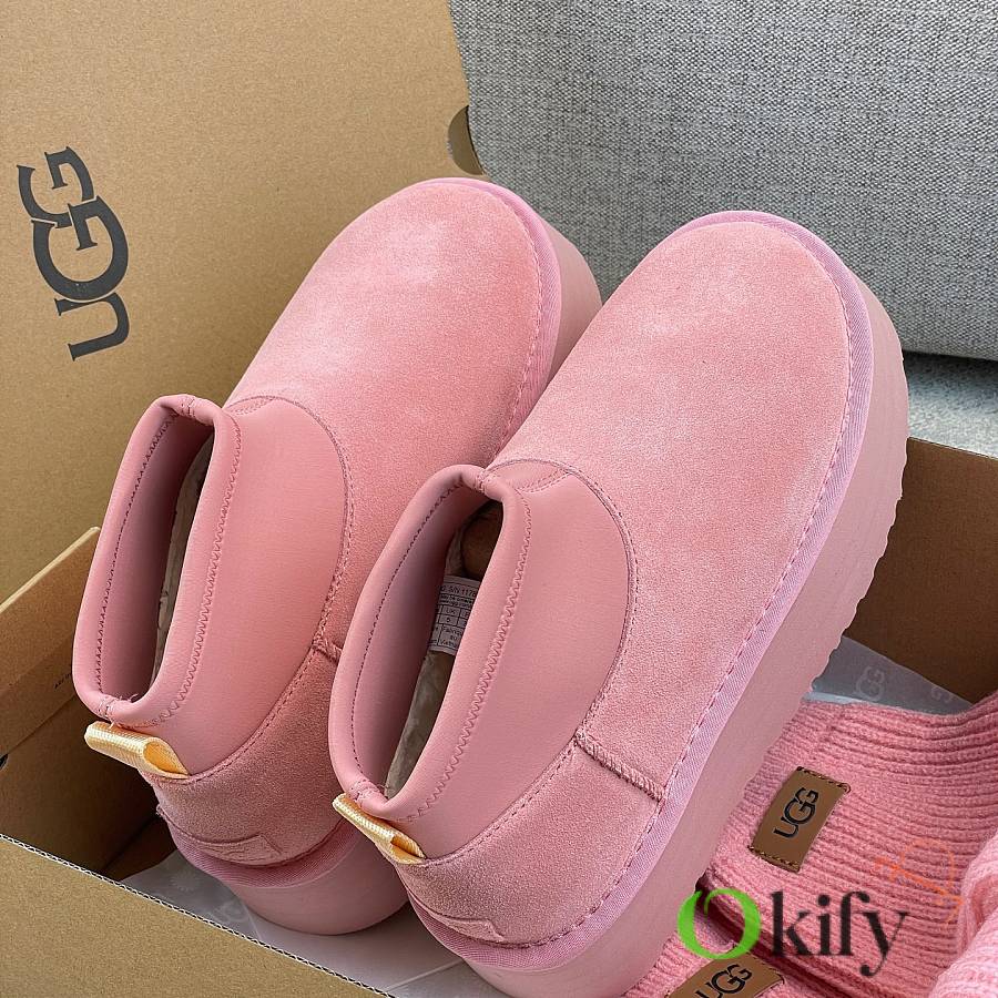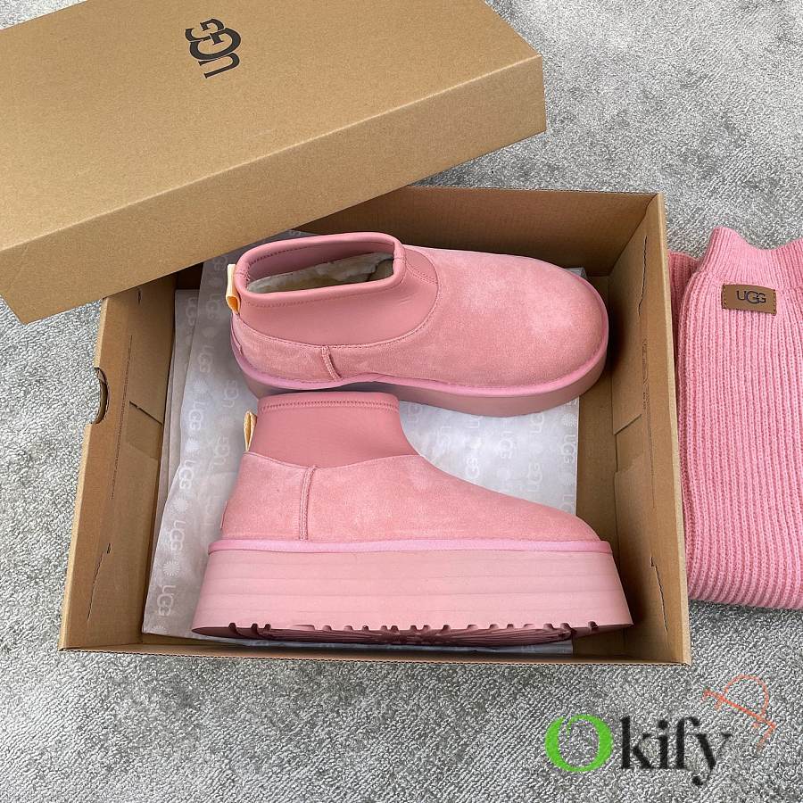 These 2025 new Ugg pink sock-like boots are two-in-one, incredibly stylish. Paired with pink knitted socks, they're sweet and adorable, instantly boosting your cuteness level. They also provide a significant height boost, with a thick, warm sheepskin lining that offers excellent insulation and a sense of security, perfect for autumn and winter. A must-have for petite women. Made with premium sheepskin from Longfeng, featuring a sunflower-patterned foam sole and wool insole. A top-tier import, adhering to original design principles, produced entirely in a dust-free workshop with four QC processes. We welcome comparison with official stores for the perfect fit, details, and workmanship! Material: Fur-lined foam outsole