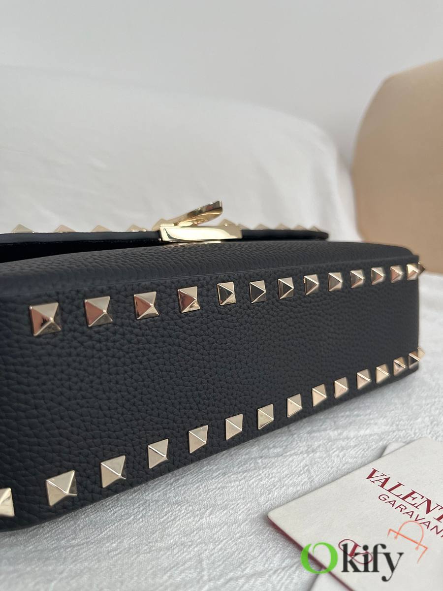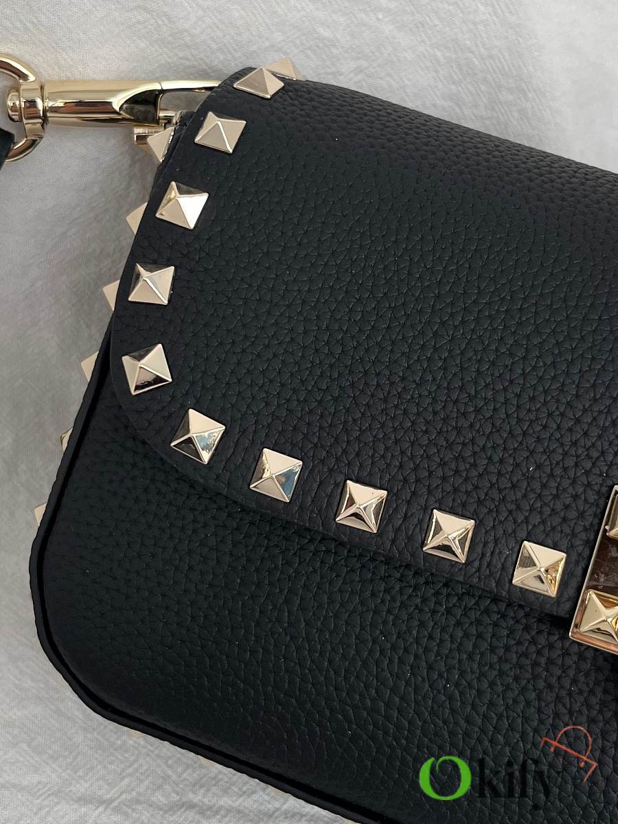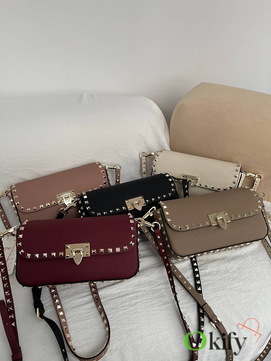 Model: 2299 GARAVANI ROCKSTUD grained calfskin handbag with signature hook and loop closure. - Metal-plated rivets and accessories - Hook and clasp opening and closing - Adjustable and detachable shoulder straps - An inner flap pocket - Dimensions: 24 cm (W) x 12 cm (H) x 6 cm (D)