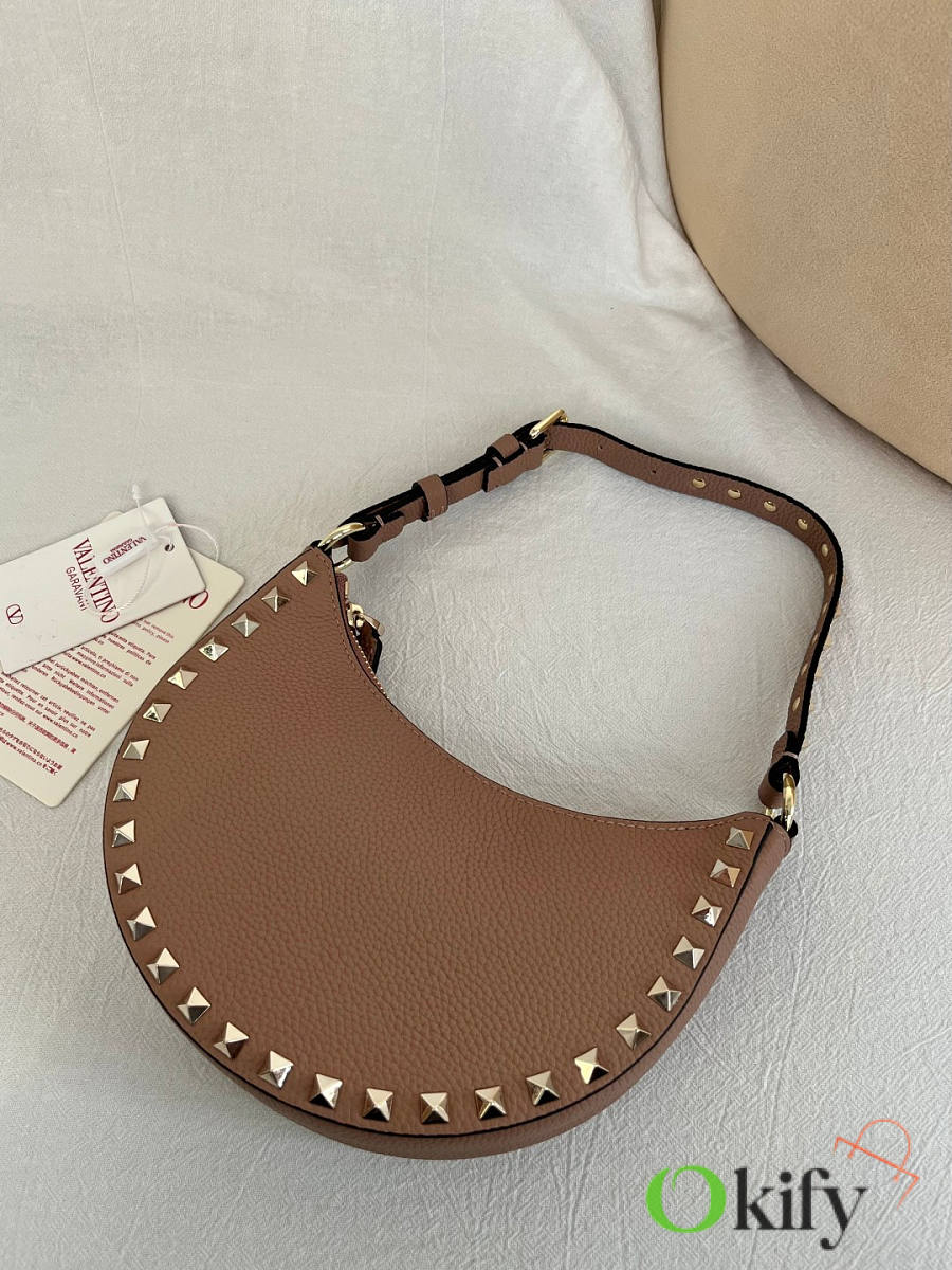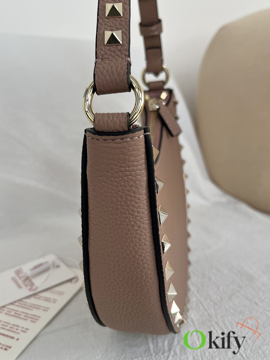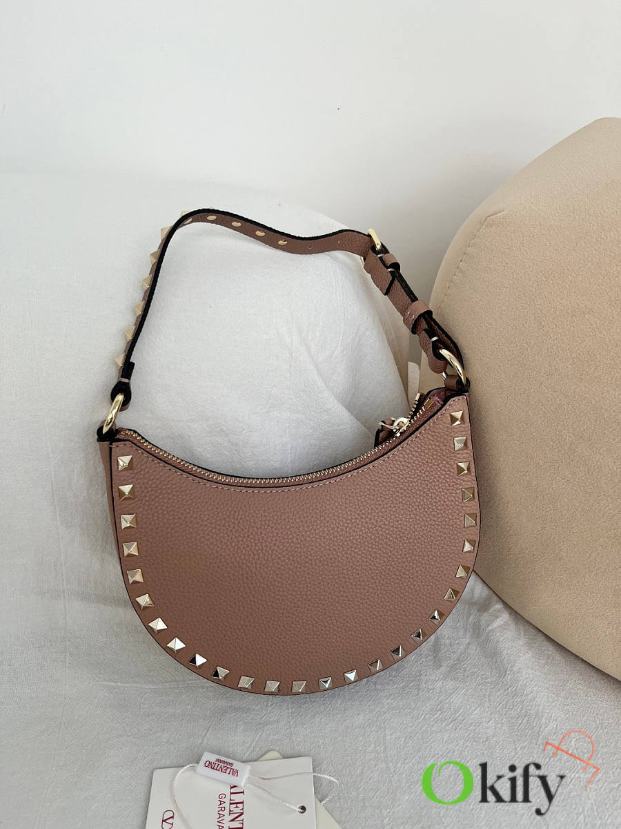 Product Code: WAI7VSH0NO VALENTINO GARAVANI ROCKSTUD Mini Grained Cowhide Hobo Handbag with Adjustable Handle, can be carried on the shoulder or by hand. - Zipper opening and closing - Platinum-plated rivets and metal fittings - Lambskin leather lining with an internal card slot - Adjustable leather handle, height (vertical distance from midpoint to top of bag): 18 cm - Dimensions: Width 20 cm x Height 12 cm x Depth 4 cm Model: 2211