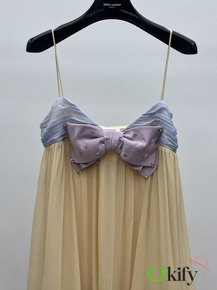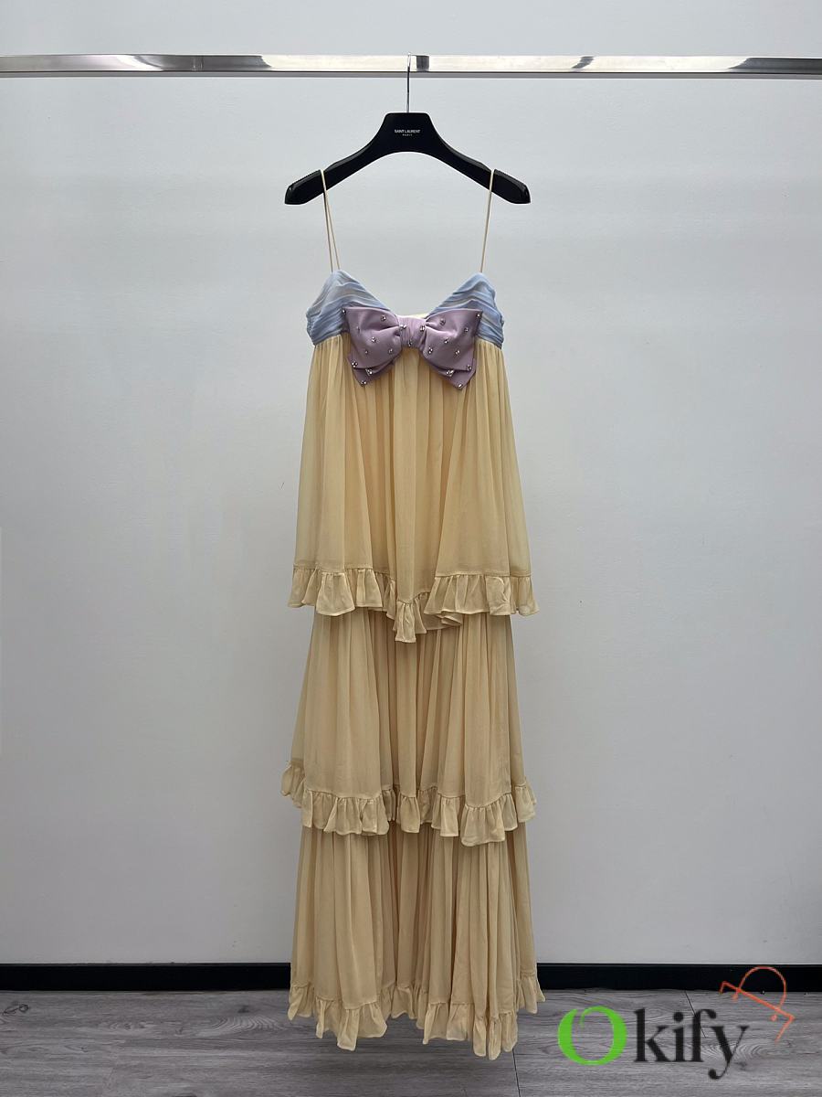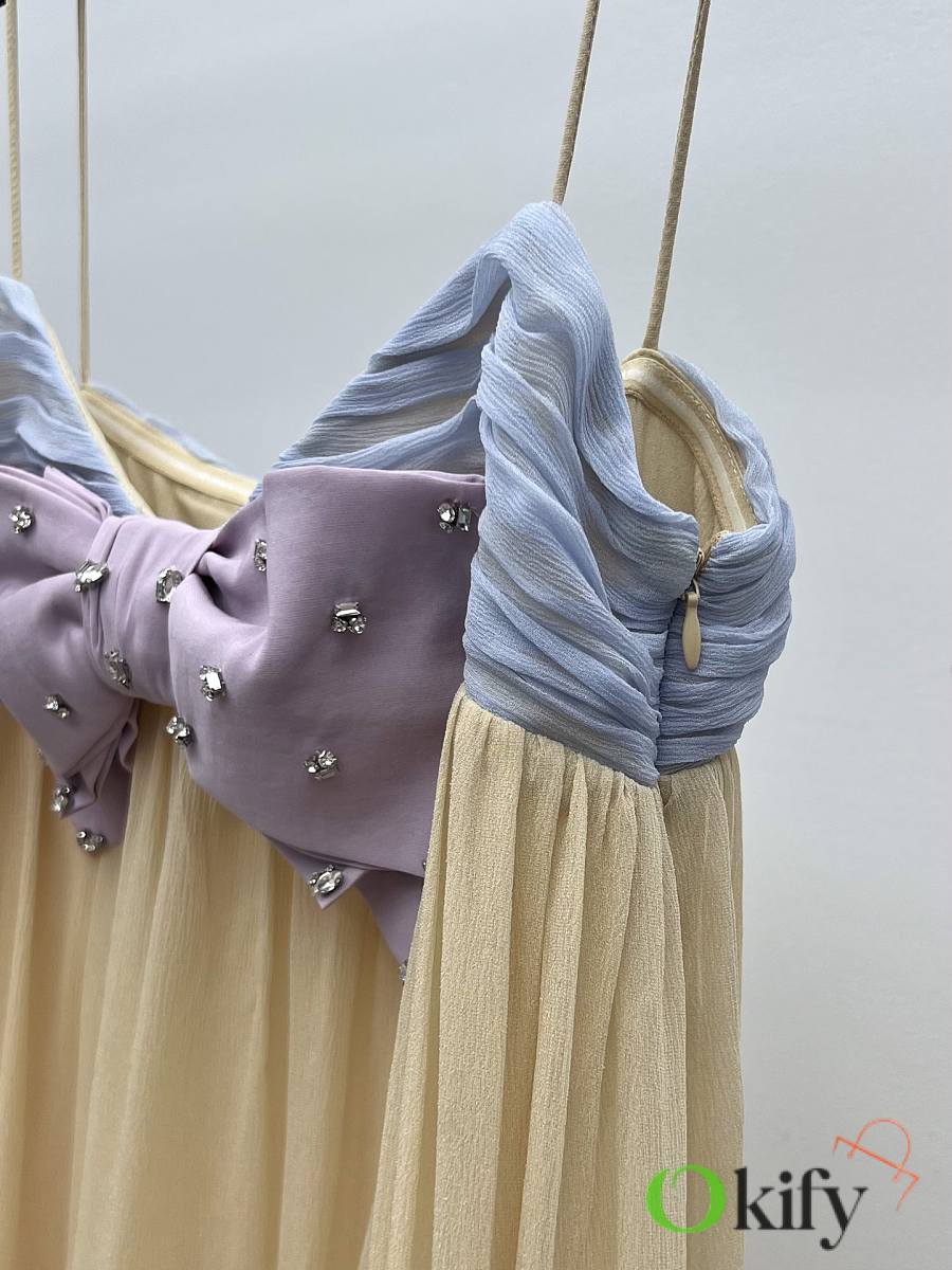 The new season's maximalism combines history and modernity, art and fashion Every detail is carefully designed, and the light yellow layers of skirt are luxurious and dreamy. The soft collision of blue and purple bows is full of fairy spirit Can be paired with fur to create a French retro and luxurious palace style