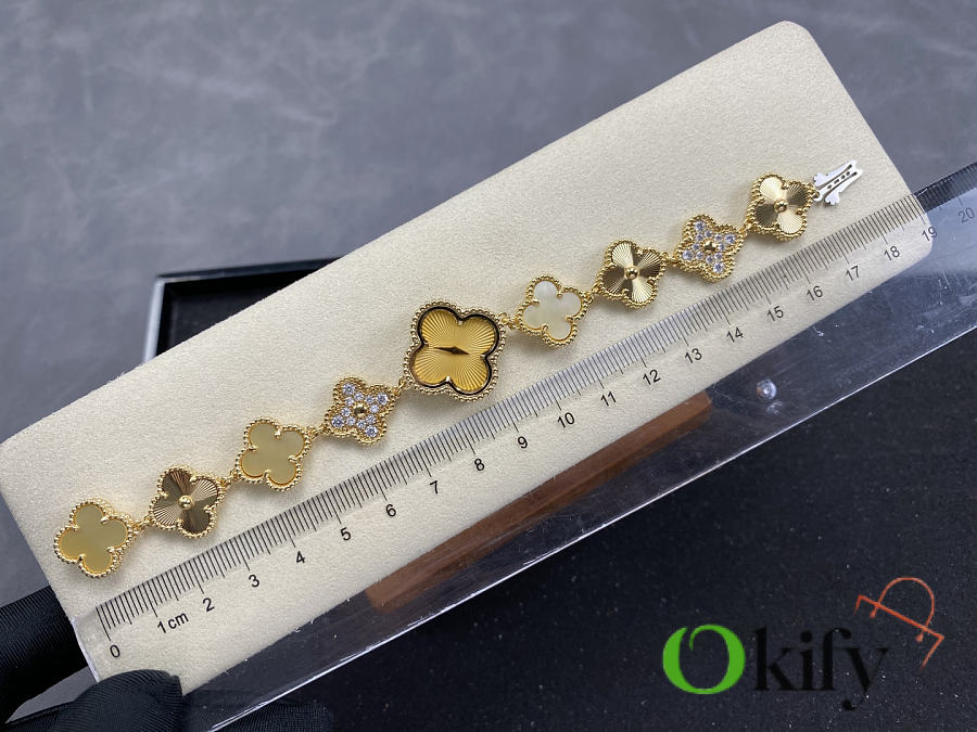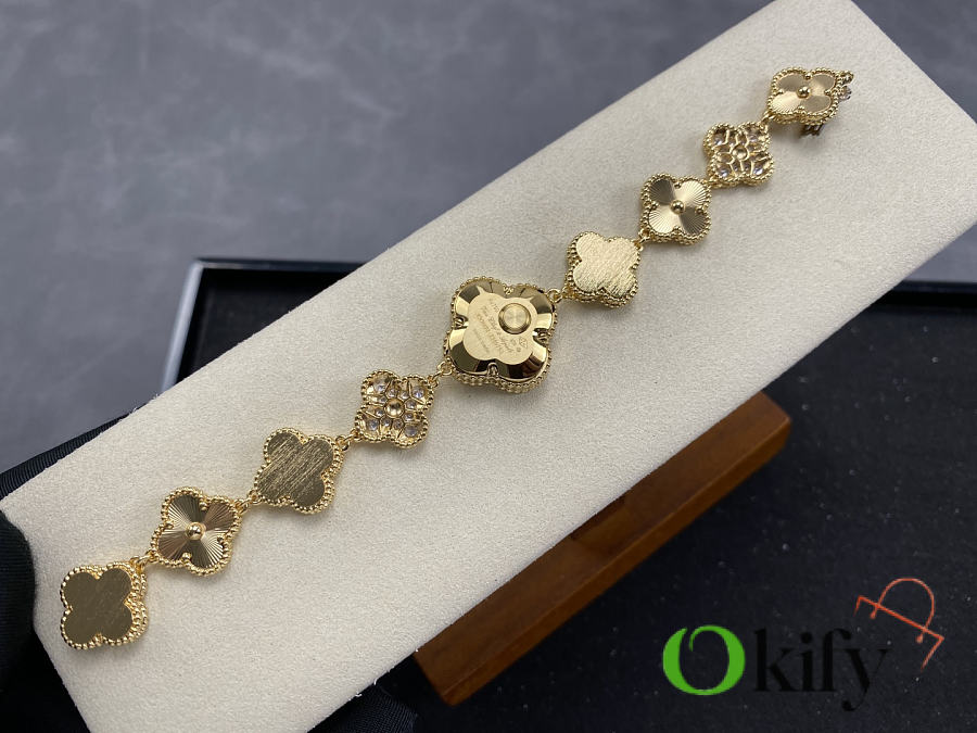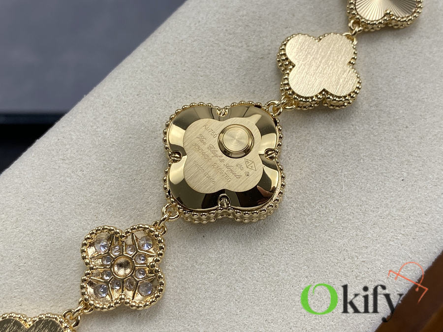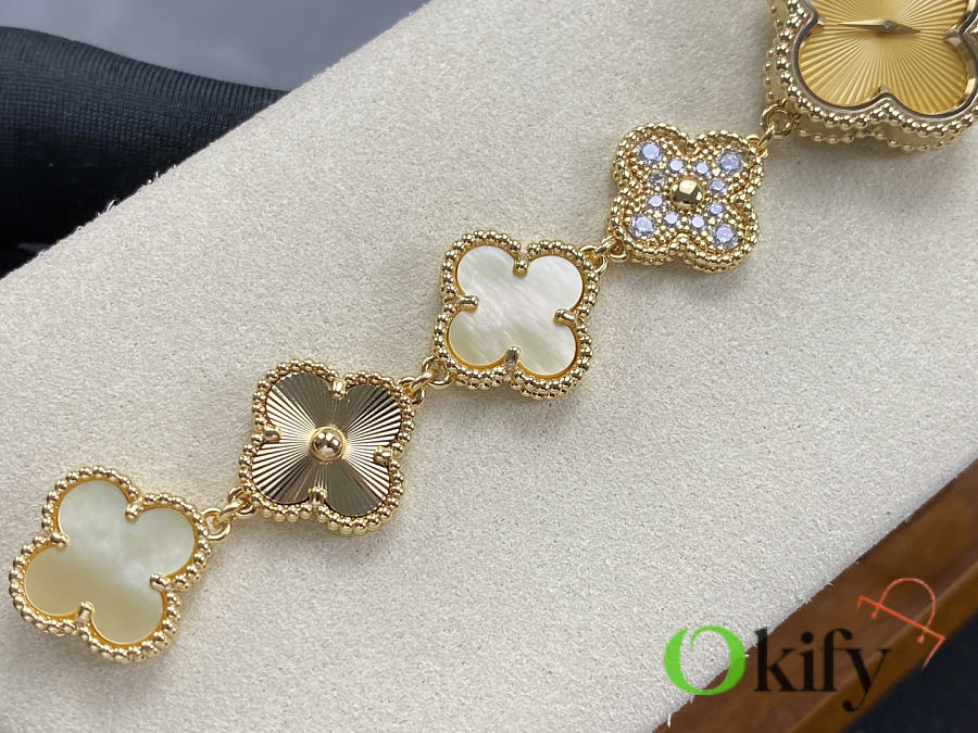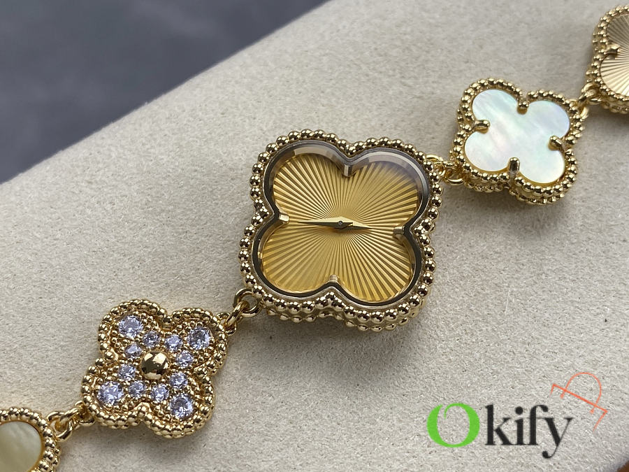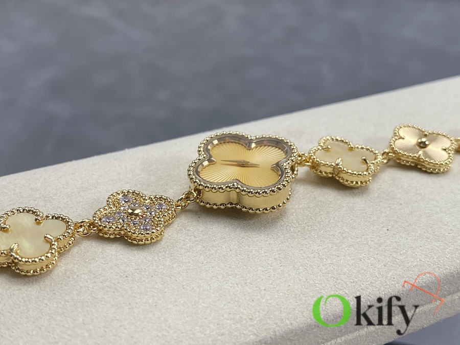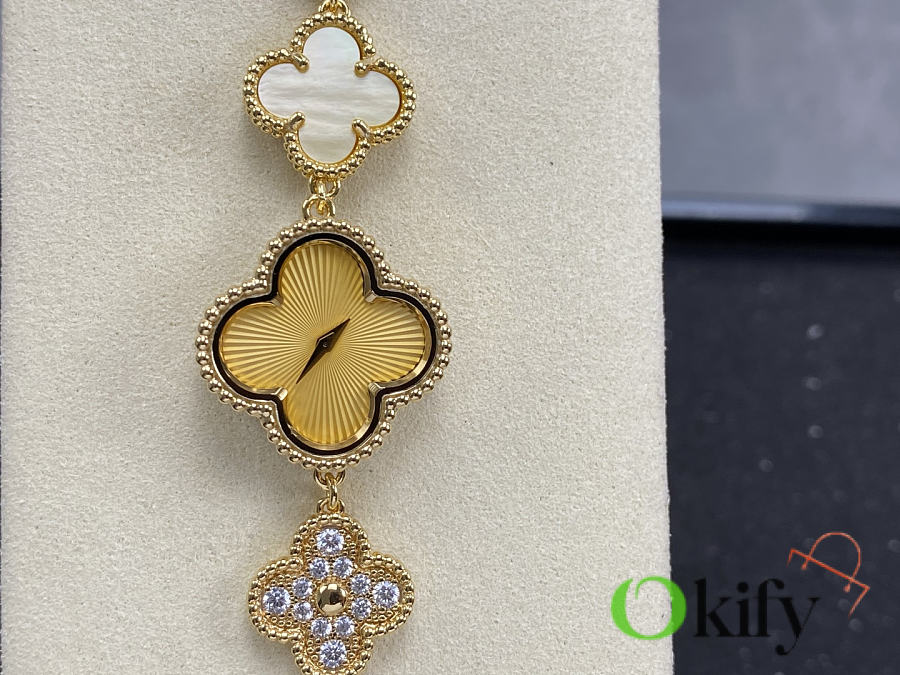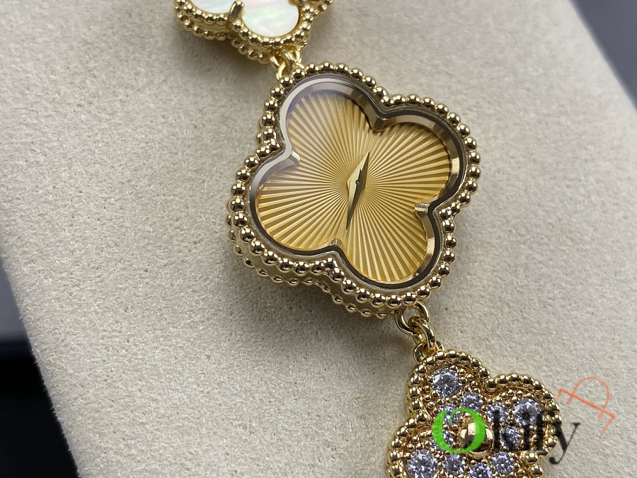 The watch continues Van Cleef & Arpels' iconic motif , exuding timeless elegance. Exquisite diamond-set designs surround the floral case, making it appear as if it were set within a white mother-of-pearl dial. This timepiece is a tribute to jewelry design and is produced in the VCA factory. Movement: Swiss quartz Diameter: 23mm