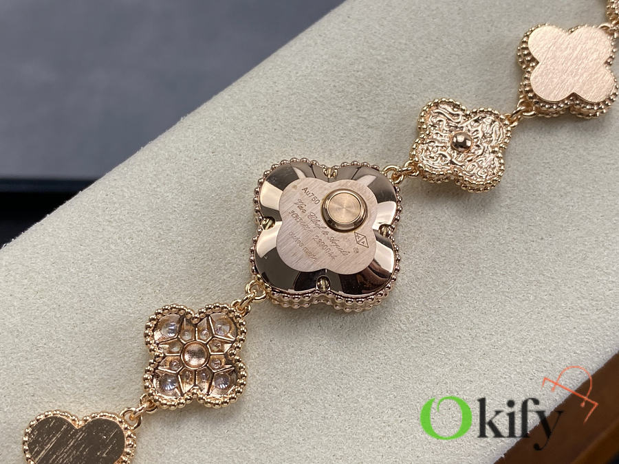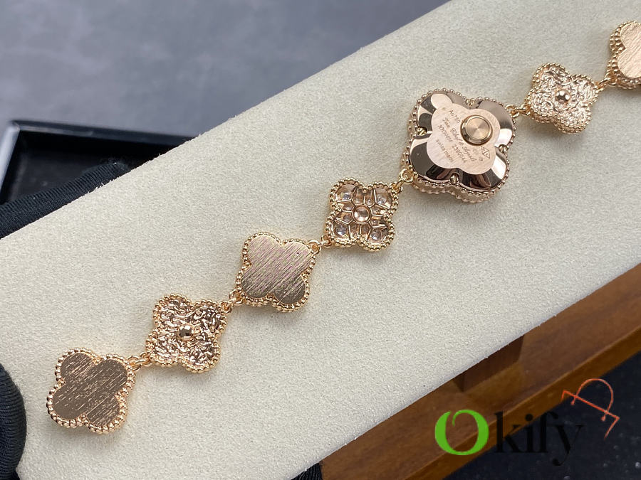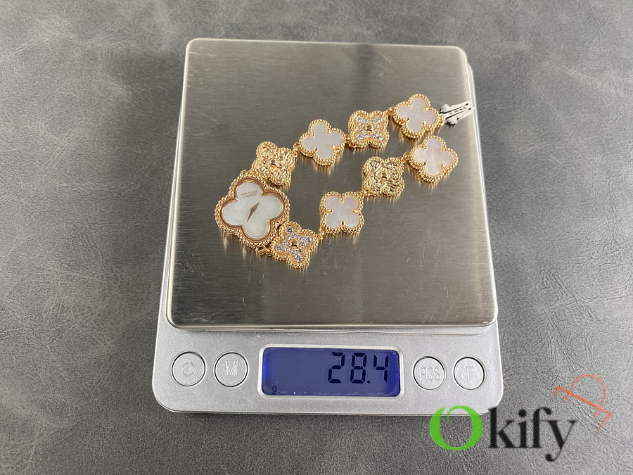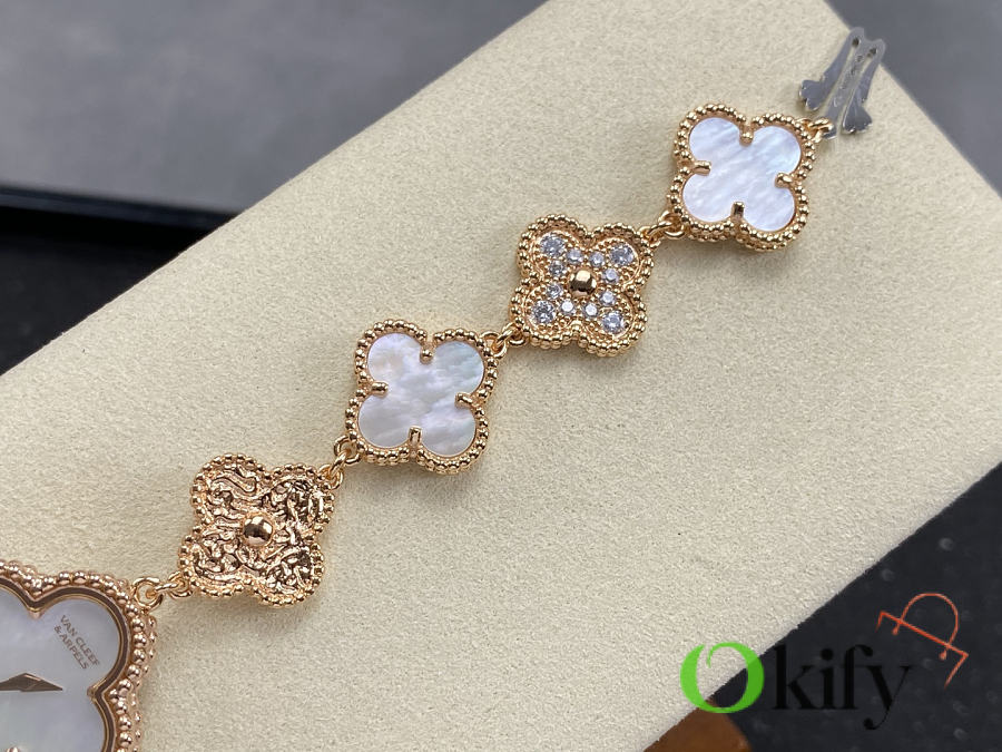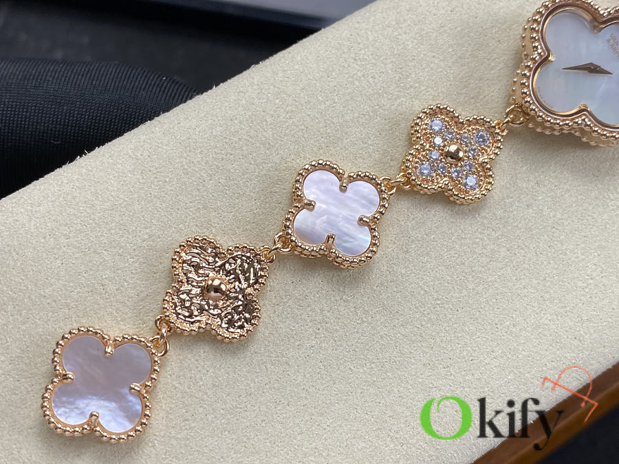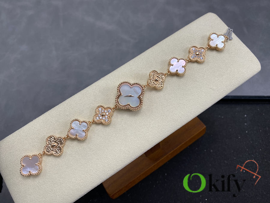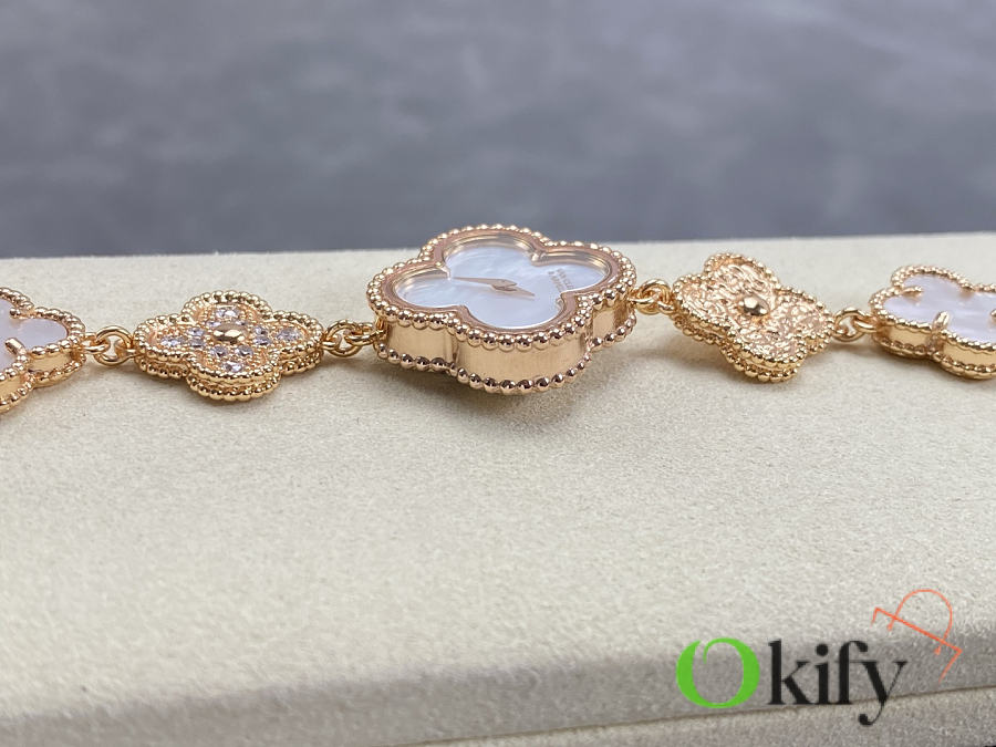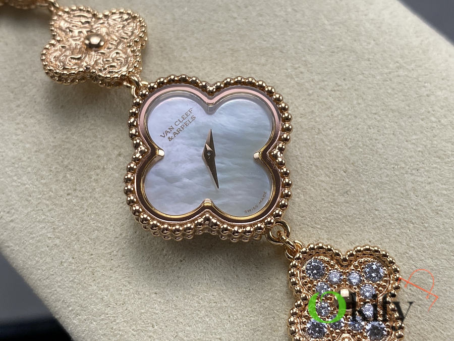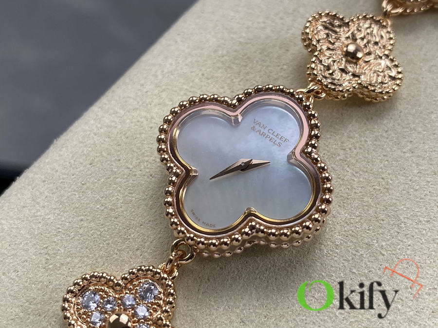 The watch continues Van Cleef & Arpels' iconic motif , exuding timeless elegance. Exquisite diamond-set designs surround the floral case, making it appear as if it were set within a white mother-of-pearl dial. This timepiece is a tribute to jewelry design and is produced in the VCA factory. Movement: Swiss quartz Diameter: 23mm